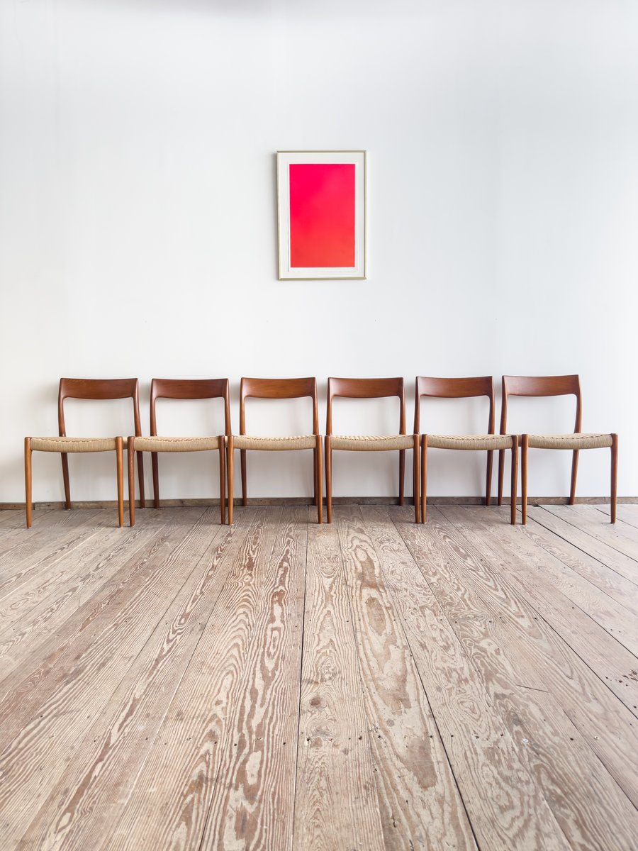 This authentic set of six Danish dining chairs was designed by Niels O. Møller and produced by J.L. Møllers Møbelfabrik in the 1960s. The chairs are Model 77, one of Møller's most iconic designs – celebrated for its refined proportions, clean lines, and superb craftsmanship.