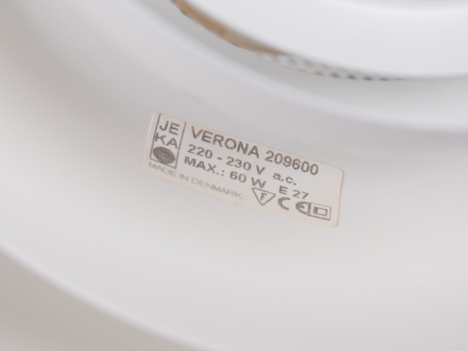 Leuchte des dänischen Designers Kurt Wiborg, hergestellt von Jeka. Die Form der Leuchte wurde nach dem Prinzip eines reflektierenden Systems entworfen, das das Licht nicht nur nach unten, sondern auch zu den Seiten lenkt und dabei die Leuchte selbst beleuchtet. Dank ihrer Struktur spendet die Leuchte diffuses und blendfreies Licht in einem warmen Ton.