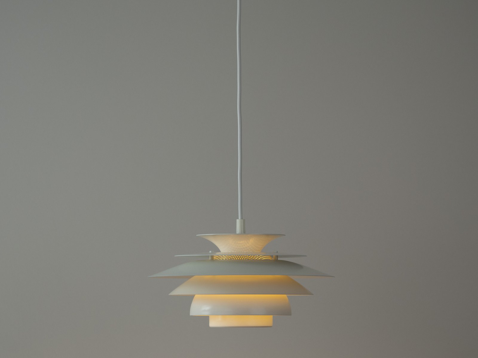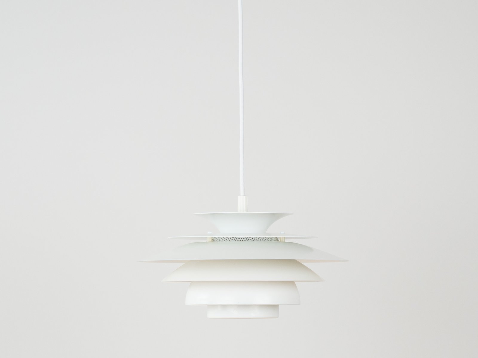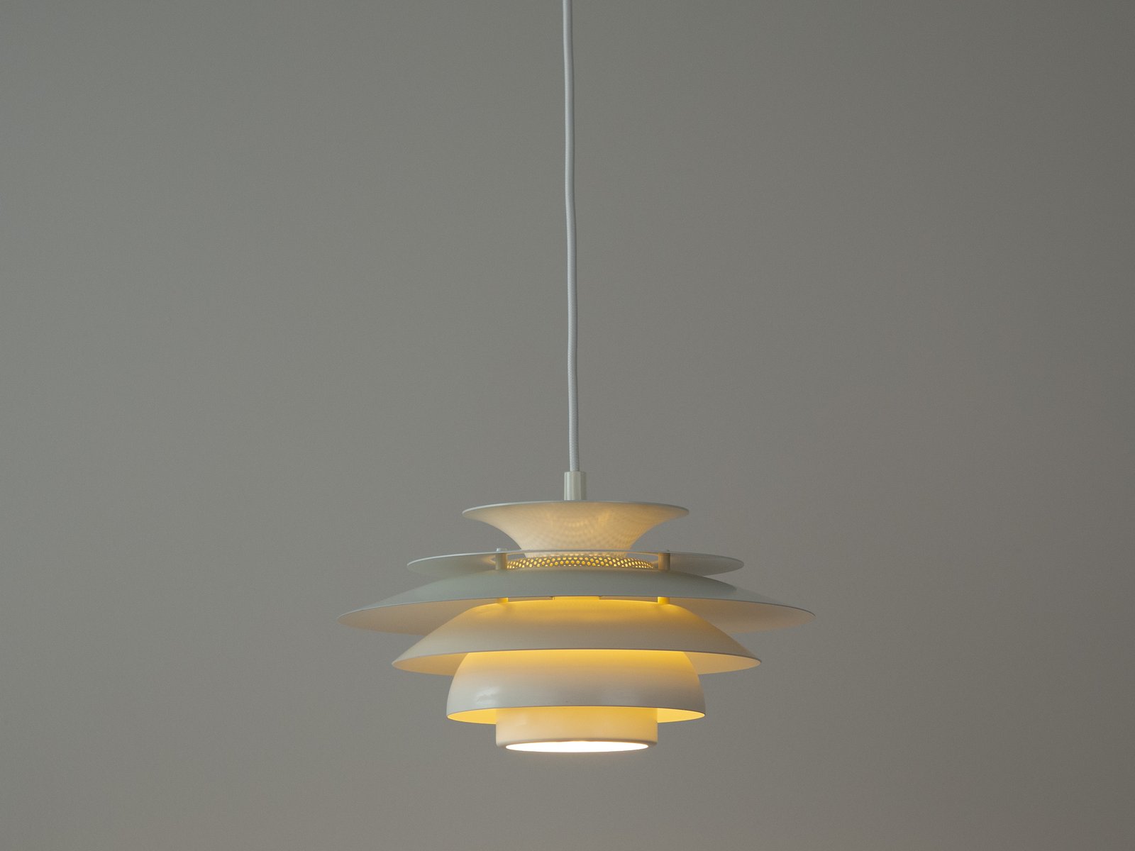 Lamp designed by Danish designer Kurt Wiborg, manufactured by Jeka. The lamp's form was designed based on the principle of a reflective system that directs light not only downwards but also to the sides, while illuminating the lamp itself. Thanks to its structure, the lamp provides diffused and non-glare light in a warm tone.