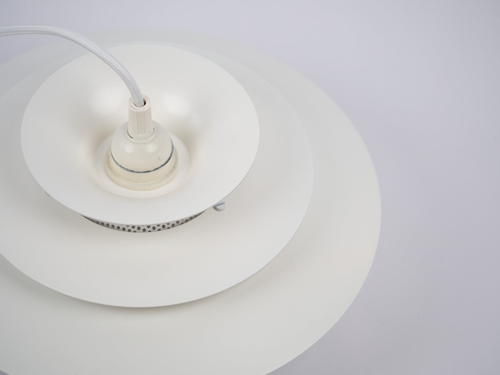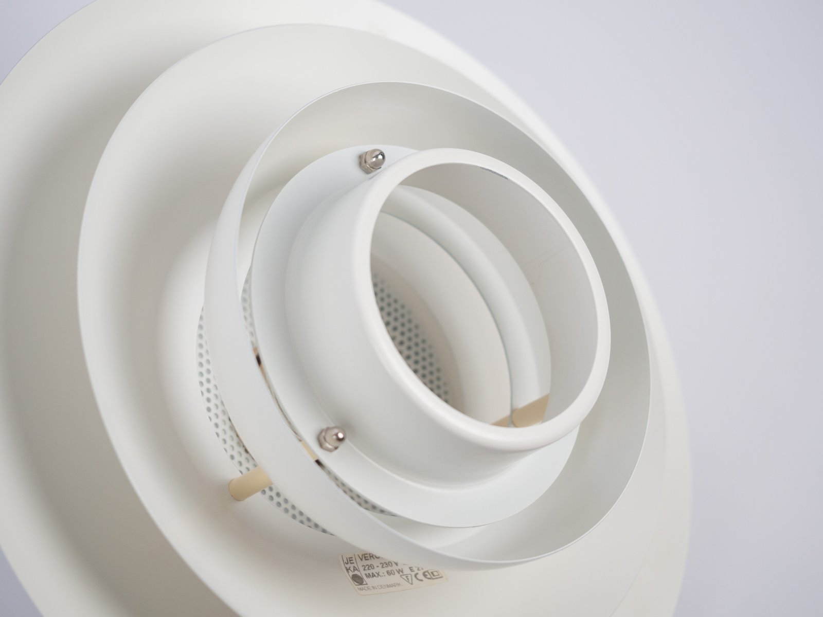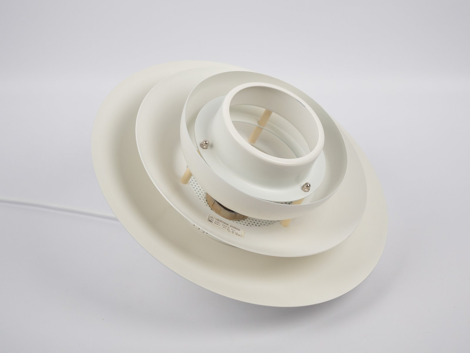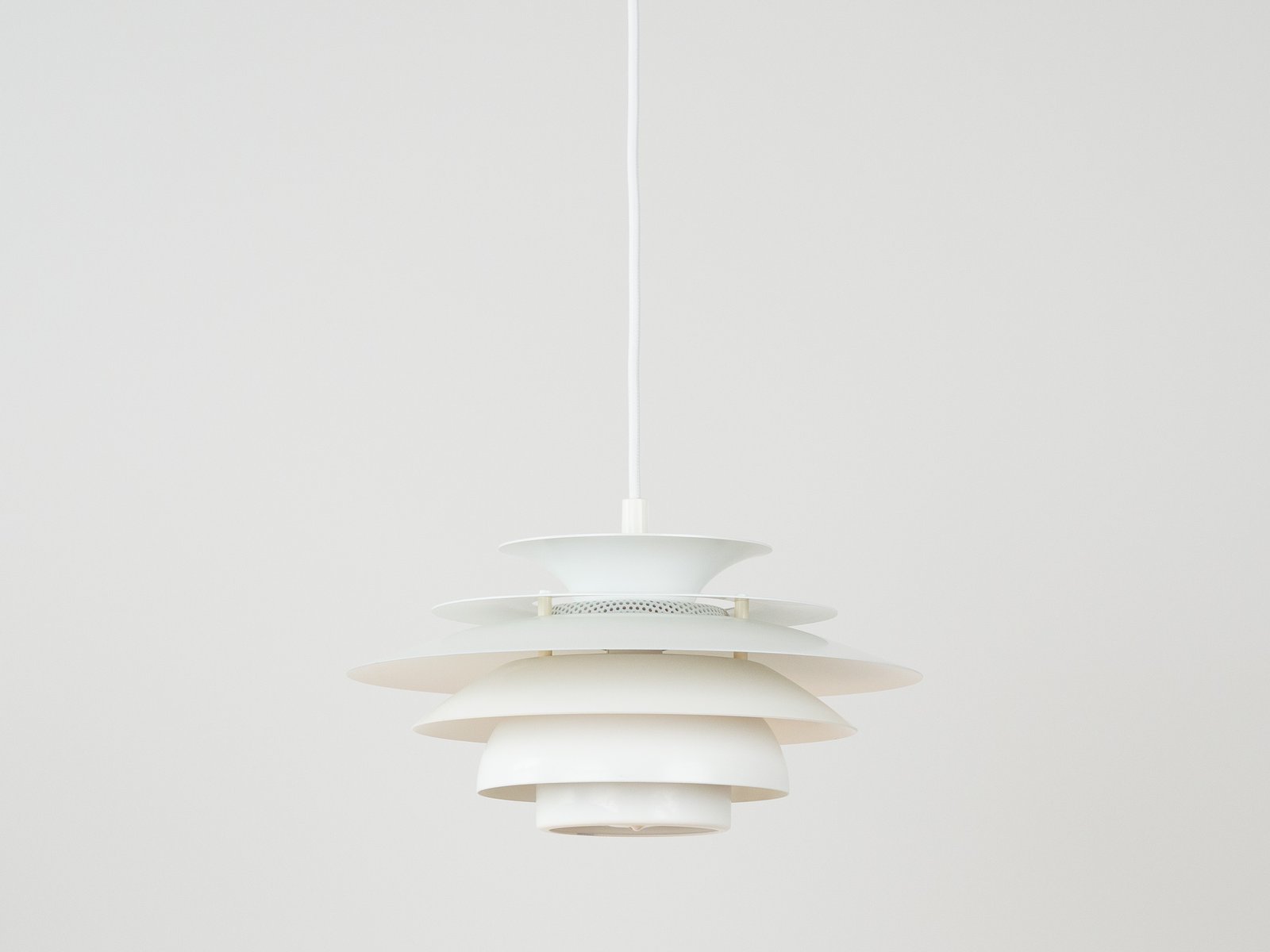 Lamp designed by Danish designer Kurt Wiborg, manufactured by Jeka. The lamp's form was designed based on the principle of a reflective system that directs light not only downwards but also to the sides, while illuminating the lamp itself. Thanks to its structure, the lamp provides diffused and non-glare light in a warm tone.