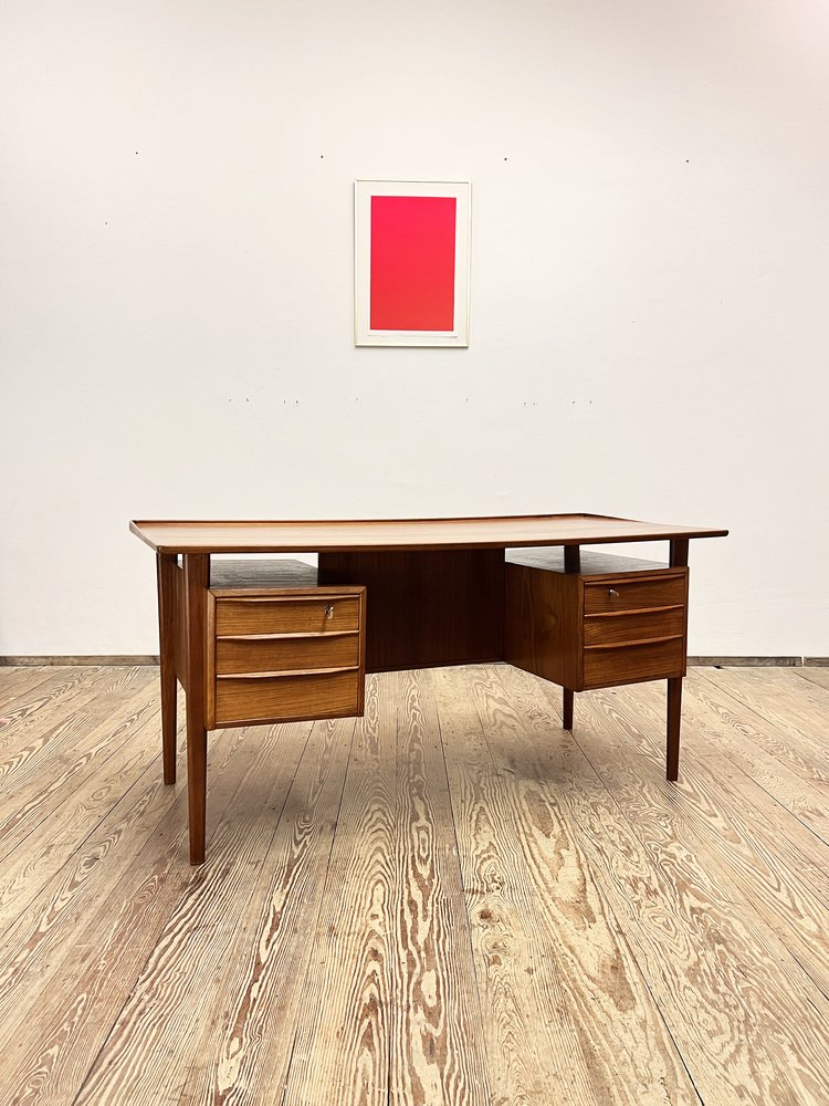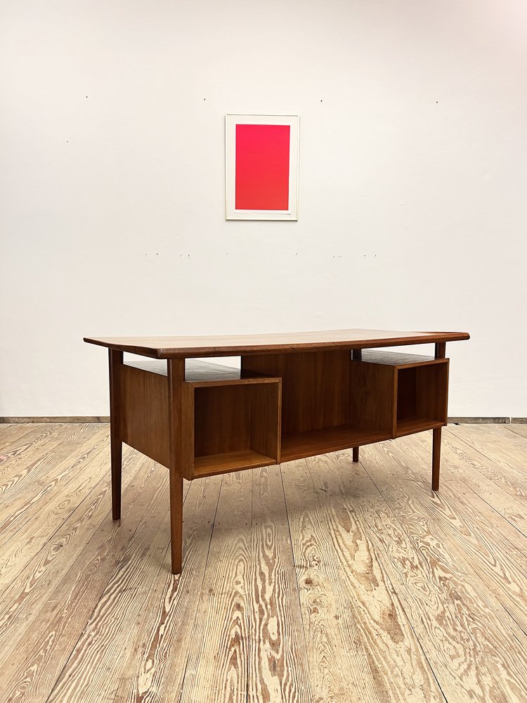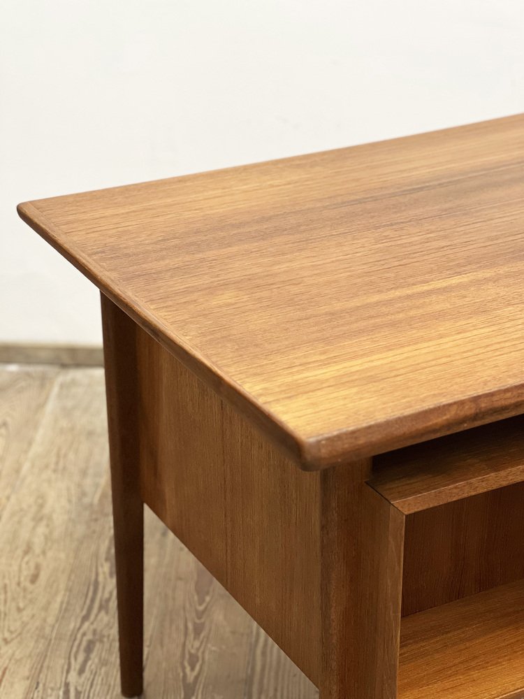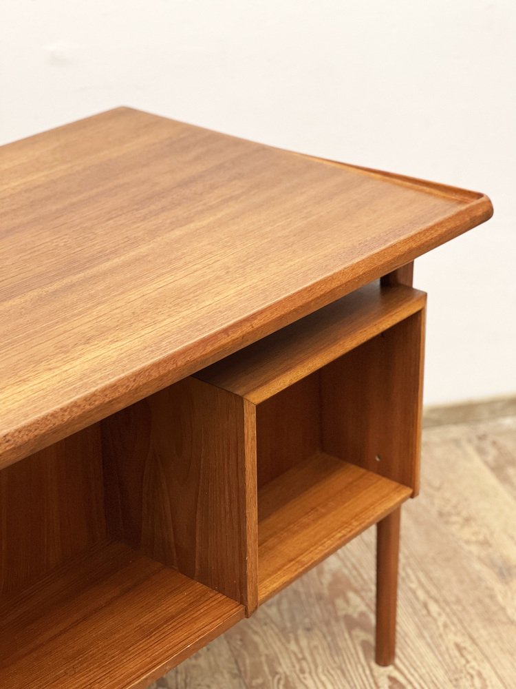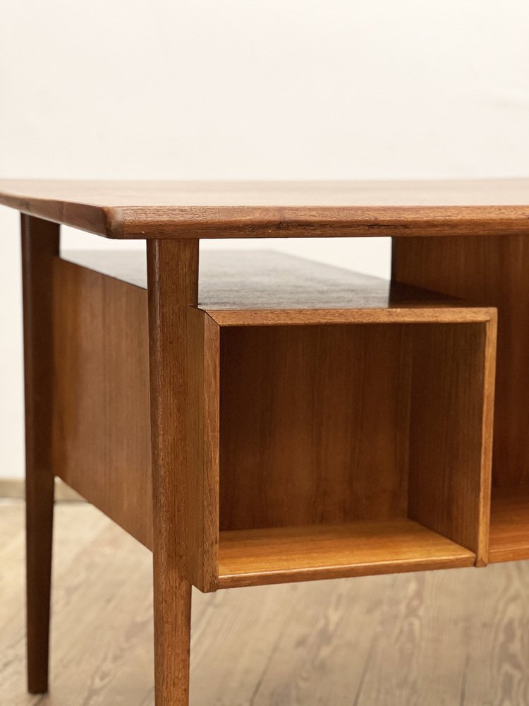 This free standing midcentury Danish Wrring Desk was designed by Peter Løvig Nielsen, Produced by Hedensted Møbelfabrik Denmark in 1976. The Table is made of teak Wood and features Two Sets of Three Drewers on Each Side and 2 Storage ComPortments as well as a shelve on the Tables Back Side. It shows some beautiful detailing, especialy the tabletops lip and the handles. The Table Comes with a key for the Top Drawers.
