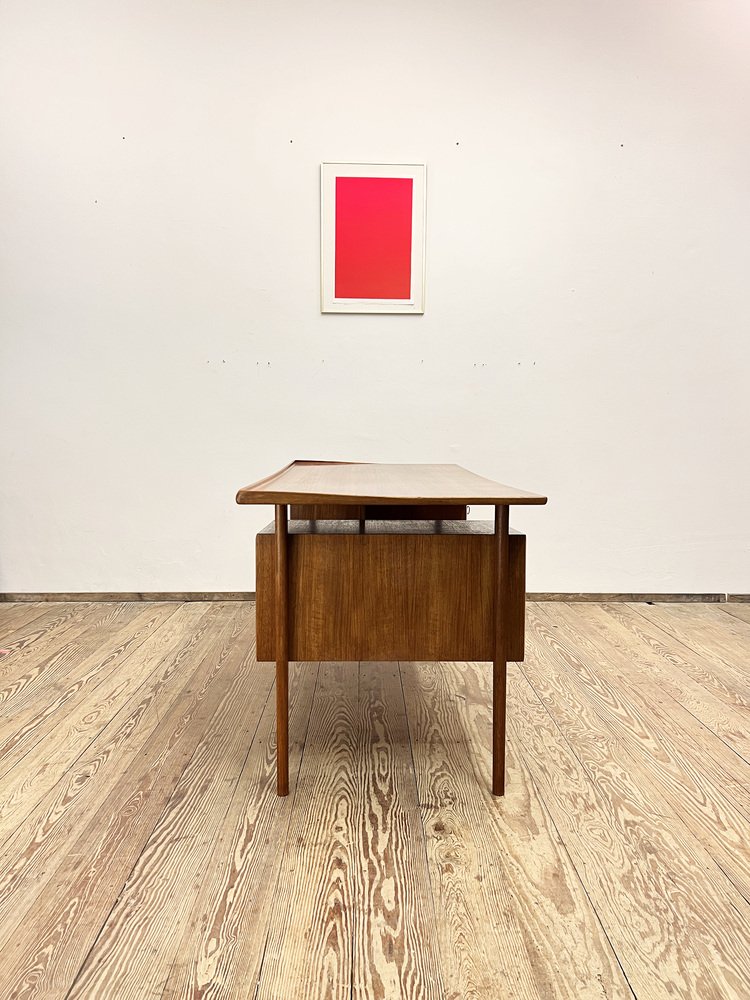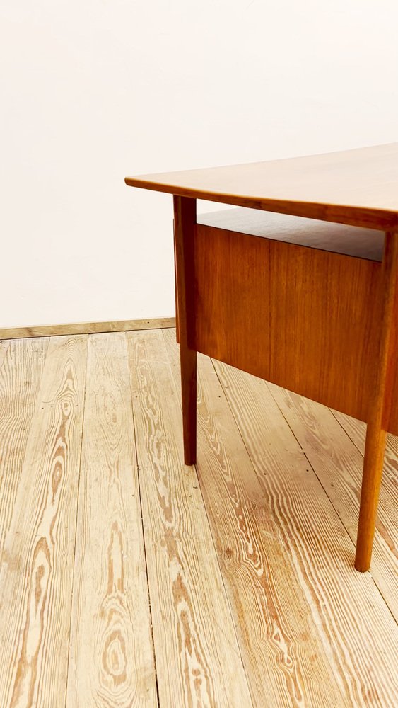 The desk is made of teak and convinces with the high -quality workmanship and wonderful details, such as the upgrown tables plate, the tapering legs and the beautifully worked handles of the drawers. The table is freely adjustable in the room and offers sufficient storage space on the shelf and the two compartments on the back, as well as in the 6 drawers, from which the upper can be locked with the existing key.