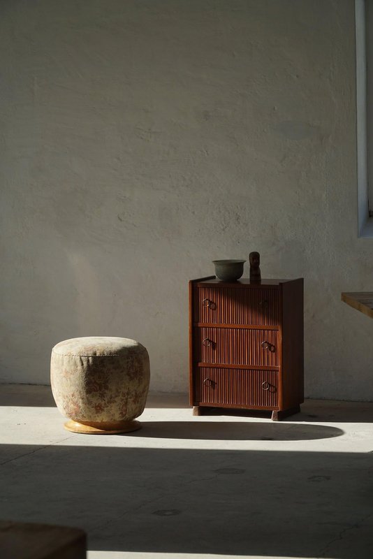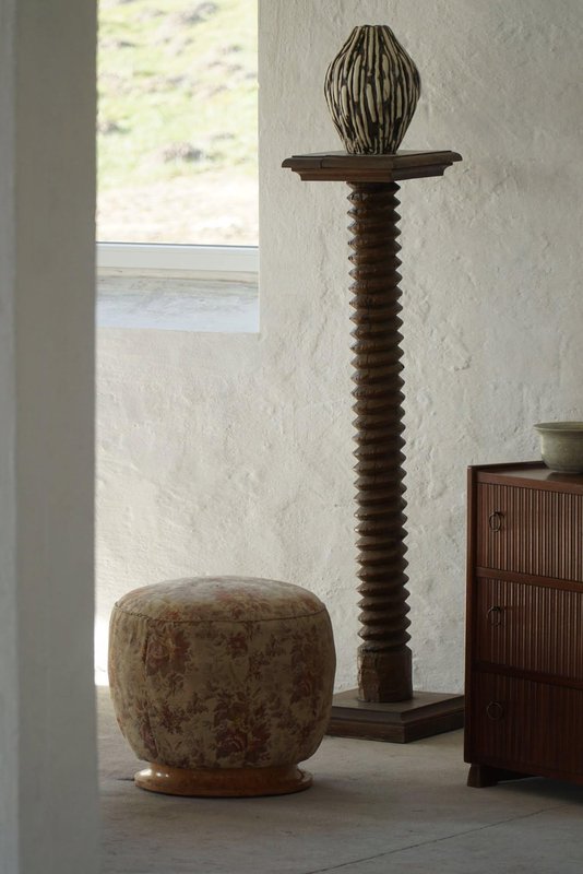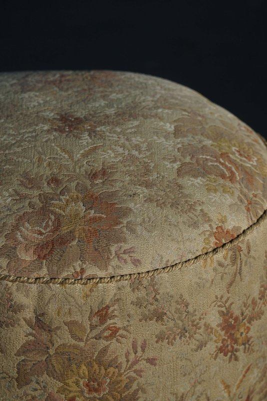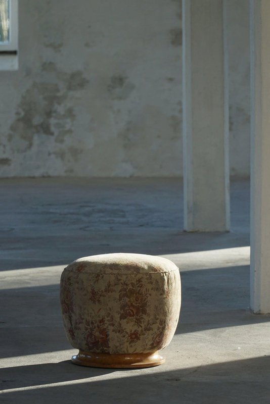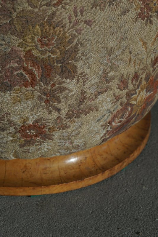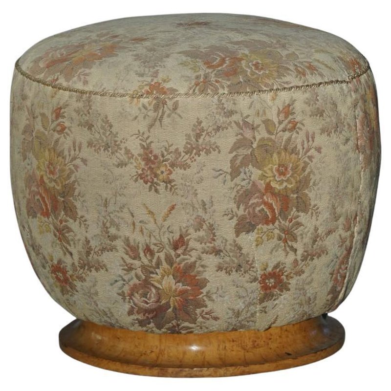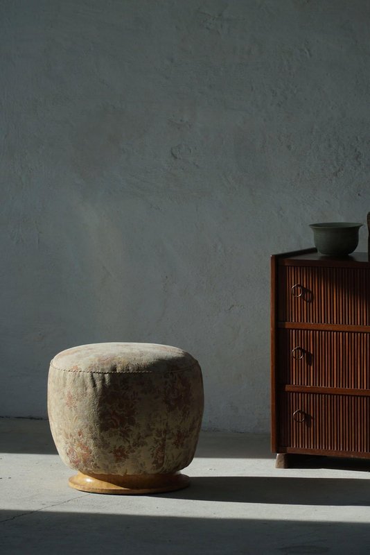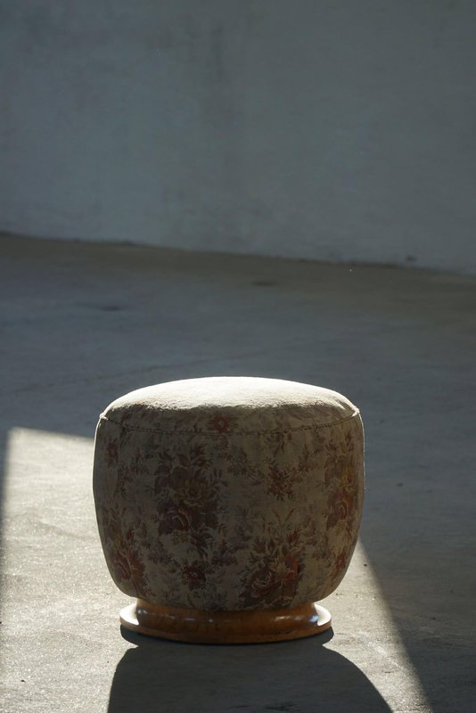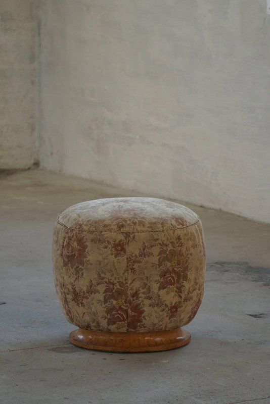 A luxurious Danish Art Deco pouf / stool. Upholstered in a glamorous flora fabric with a decadent burl wood base. Made by a Danish cabinetmaker in the 1940s. This beautiful vintage stool will fit in many interior styles. A modern, Scandivinavian, Art Deco interior or a Classic home for example. "There is no style like Art Deco that embraces both the figurative and the abstract, the feminine and the masculine, the monumental, the stringent and the opulent, the functional and the unnecessary. Art Deco is a seducer who, with its cool language, will generously enrich our lives with beauty".