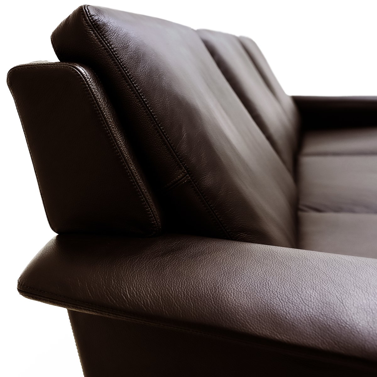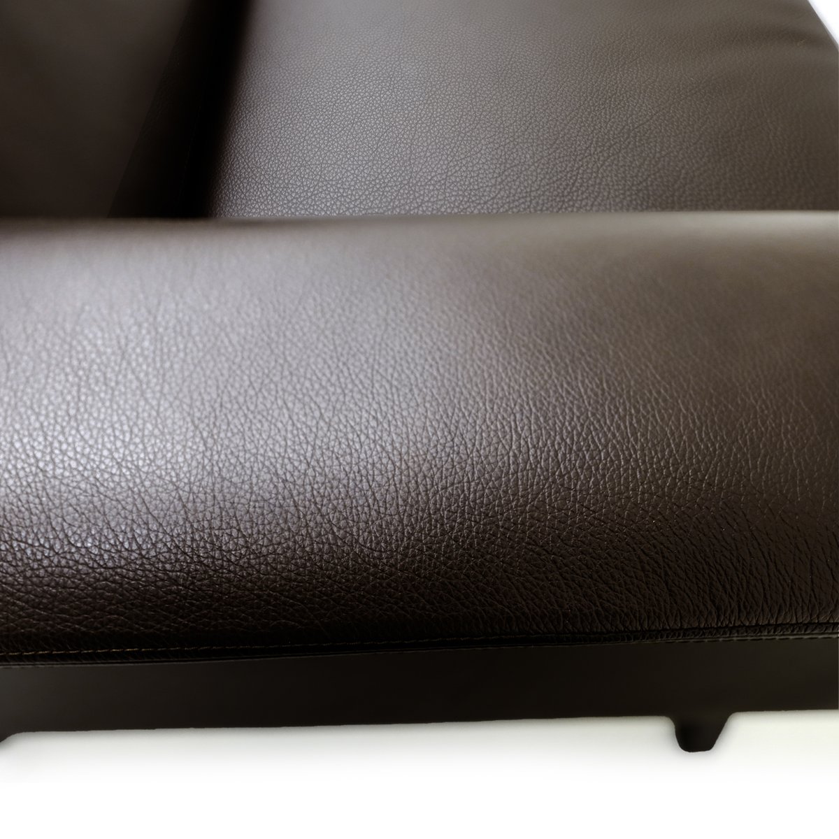Die Originale wurden in einer Reihe von Stoffen und Ledern hergestellt, und dieses Sofa wurde vor kurzem in einem atemberaubenden, fein genarbten, dunkelschokoladenfarbenen Leder neu gepolstert; es ist daher in ausgezeichnetem Zustand mit nur ein paar sehr kleinen Flecken hier und da. Es ist ein sehr bequemes Sofa, da es über eine gefederte Basis verfügt, die durch eine Schaumstoff- und Vlieseinlage noch verstärkt wird. Es ist auch clever konstruiert, so dass es leicht auseinander genommen werden kann, damit es in Bereichen platziert werden kann, in denen man normalerweise nicht in der Lage ist, ein großes Sofa aufgrund von Höhen- oder Breitenbeschränkungen in einem Flur oder einer Türöffnung zu bekommen; die Rückenlehne wird einfach mit 5 langen Schrauben durch die Basis befestigt und jeder Arm dreht sich auf einem Beschlag und rastet dann mit zwei Bolzen auf jeder Seite ein.