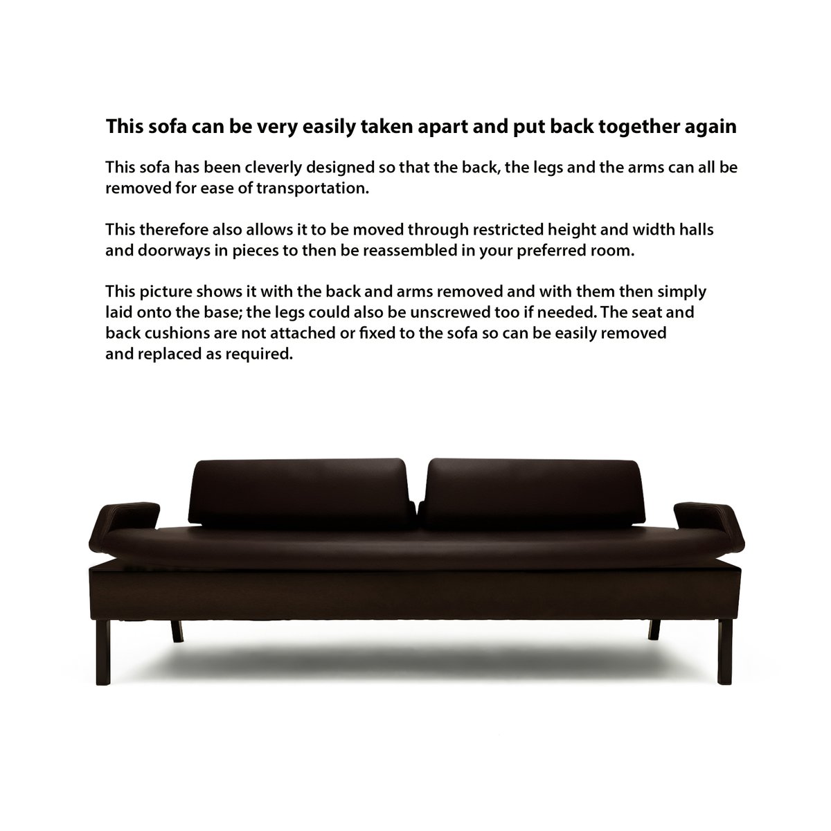 Originals were produced in a range of fabrics and leathers and this sofa has been reupholstered in recent times in a stunning fine grained, dark chocolate leather; it is therefore in excellent condition with just a few very minor marks here and there. It’s a very comfortable sofa as it benefits from having a sprung base which is further enhanced with a foam and fleece interlay. It’s also been cleverly designed so that it can easily be taken apart to enable it to be placed in areas where you might not usually be able to get a large sofa because of height or width restrictions in a hall or doorway; the back is simply fixed by 5 long screws through the base and each arm rotates on a fitting and then locks into place with two bolts on each side.