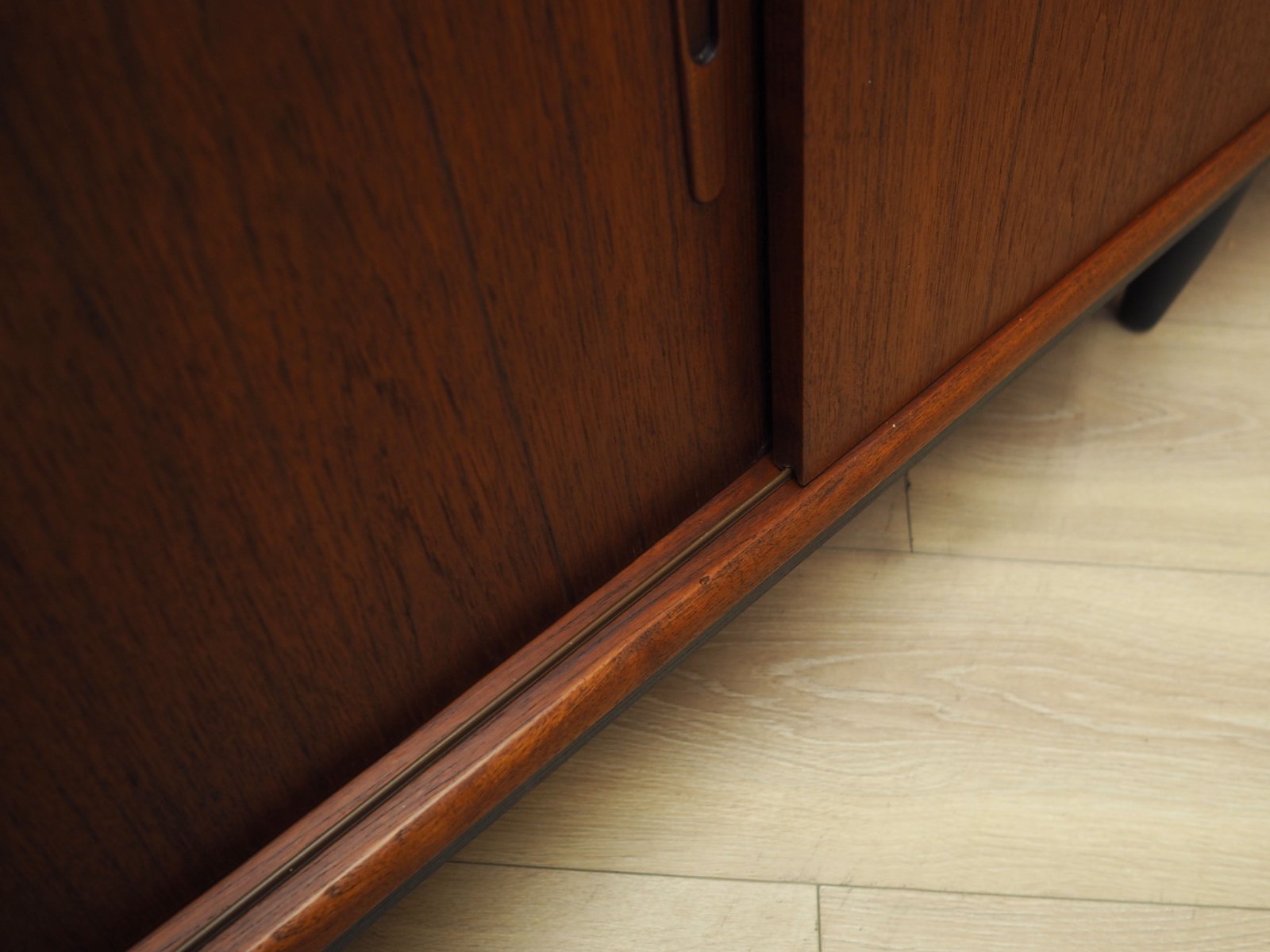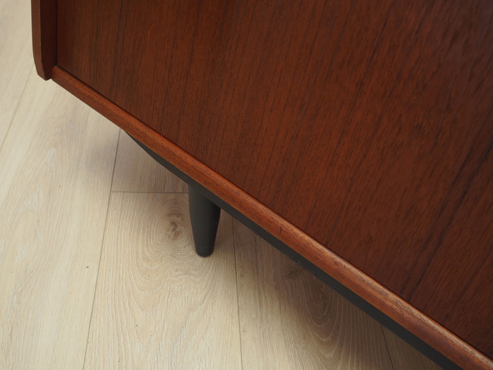 The structure is covered with teak veneer. The legs are made of solid wood stained black. Surface after refreshing. Inside, the space has been filled with two practical height-adjustable shelves. The furniture has a practical sliding door solution, which reduces the need to leave a large free space in front of the furniture, while not restricting access to the interior. An additional feature is the versatile bar, inside of which there is a decorative mirror, two drawers and a non-adjustable shelf.