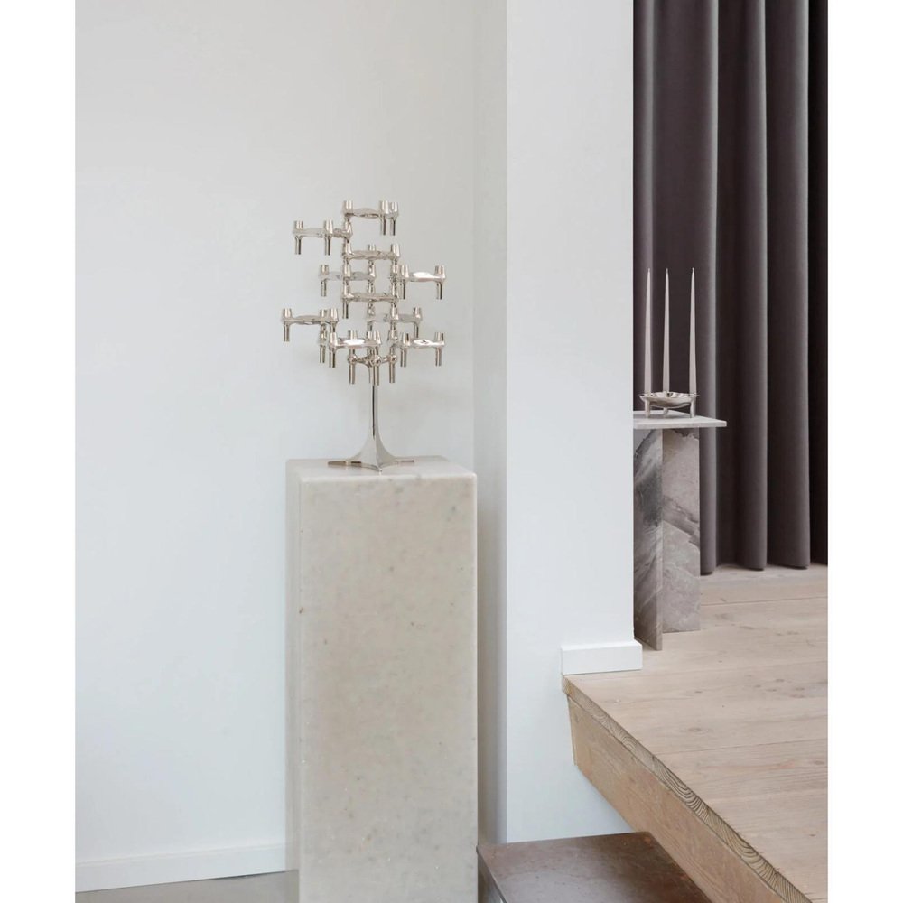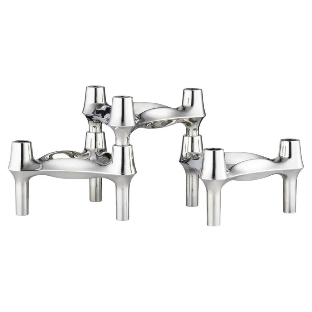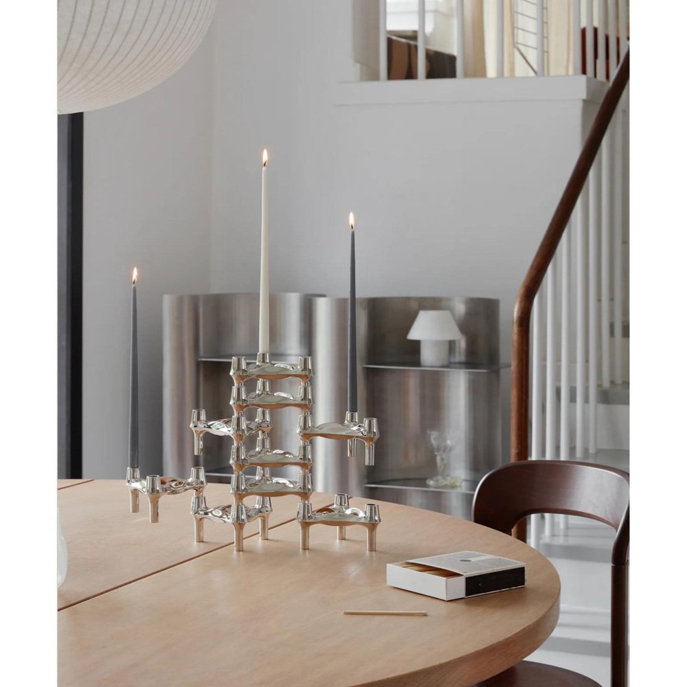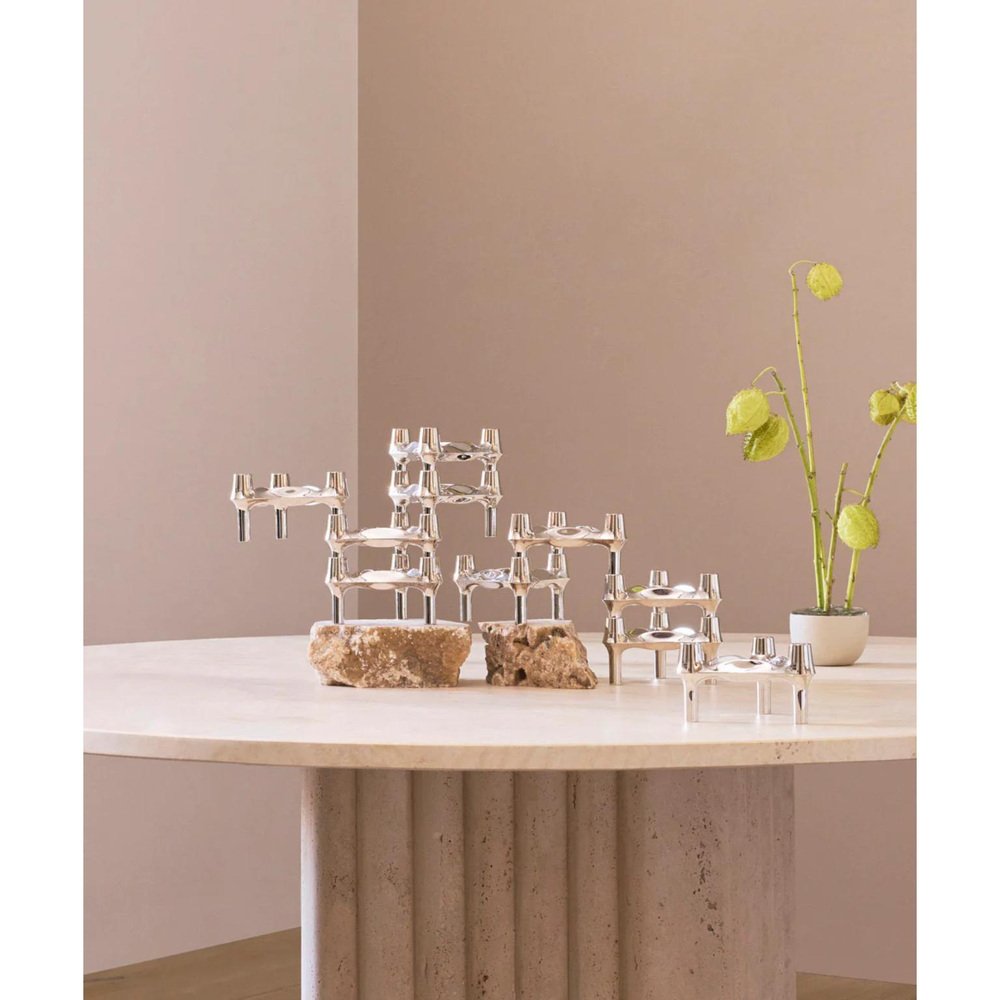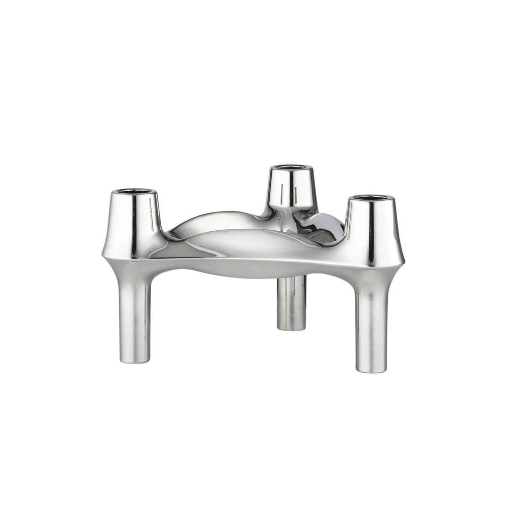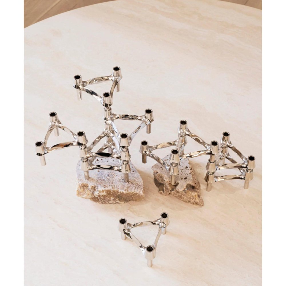 Set of 3 Decorative BMF Candle Holders in Chrome Finish by STOFF Nagel Dimensions: Ø 11,7 x H 6,7 cm. Materials: Chrome. The BMF candle holder is among the most iconic candle holder designs from the prominent design decade of the 1970s. The candle holder was originally designed by the Nagel company in the late 1970s, but shortly after its launch, it was handed over to the BMF company and produced until 1985. The three-legged stackable signature design is considered a collector’s item in homes around the world – an organic, sculptural object inviting its owner to unfold their creativity in endless expressions. Today, the BMF candle holder has joined the STOFF Nagel collection to continue the vision of rediscovering iconic design.
