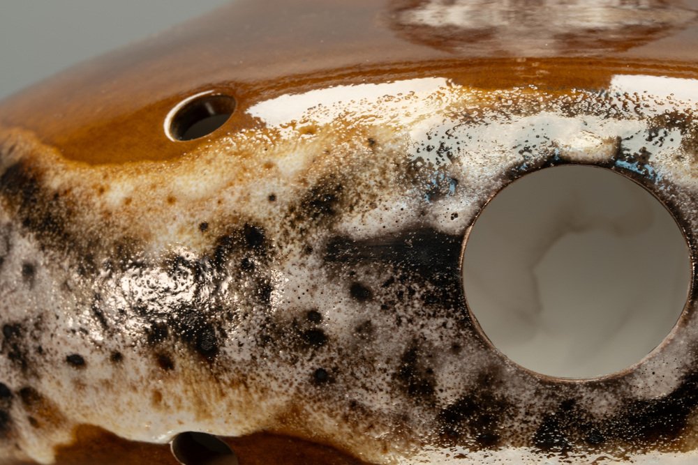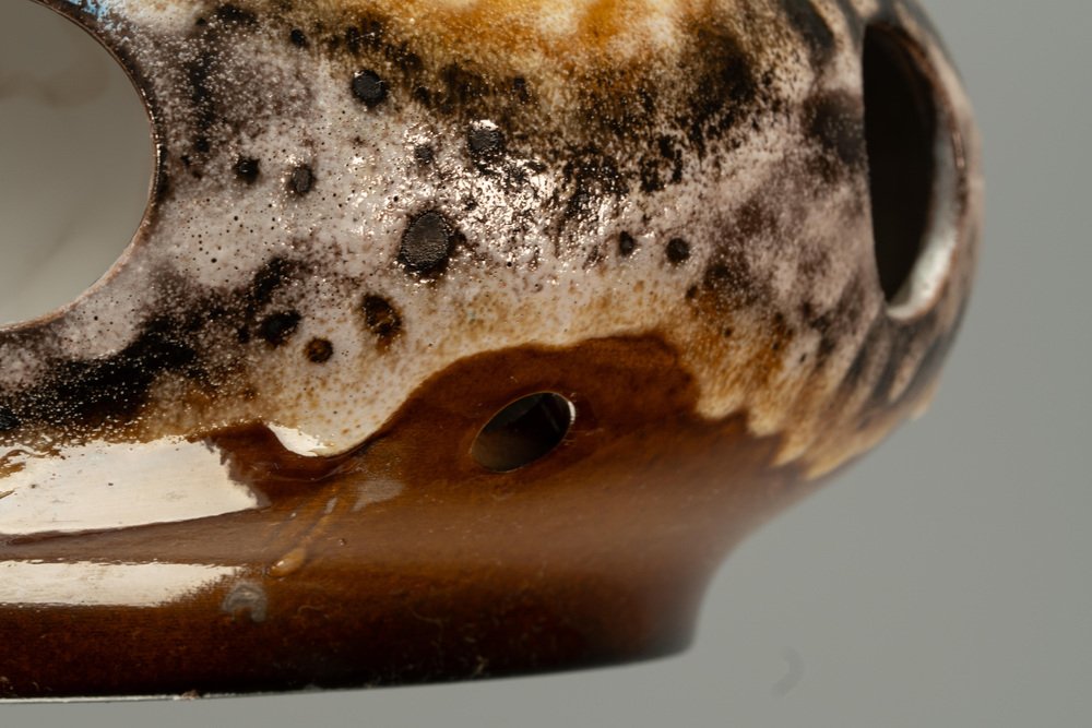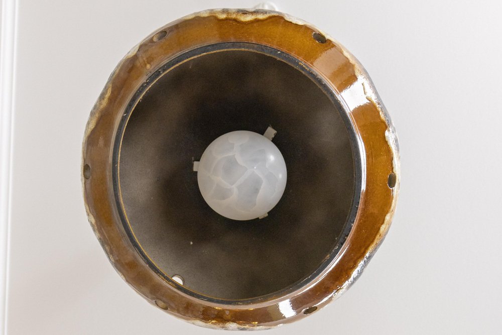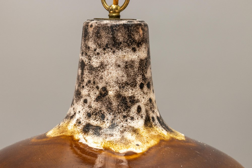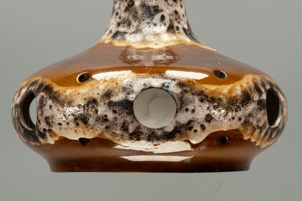 Sculptural ceramic shade with richly textured glaze in brown, ochre, and cream tones, typical of West German Fat Lava production.