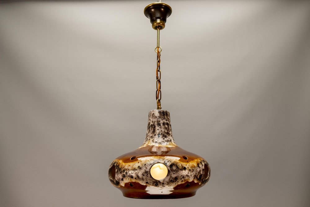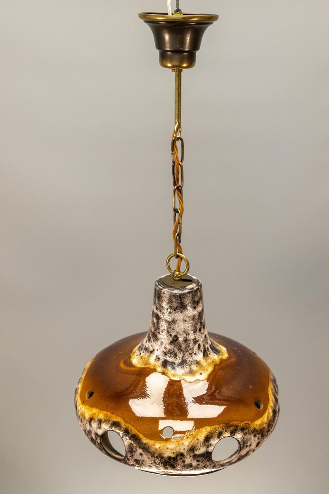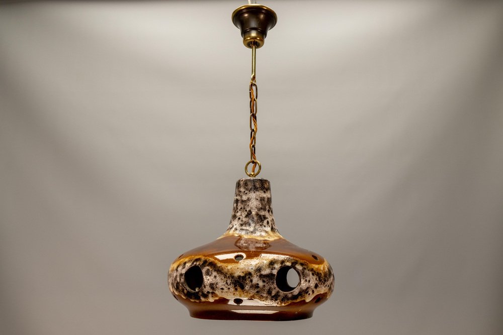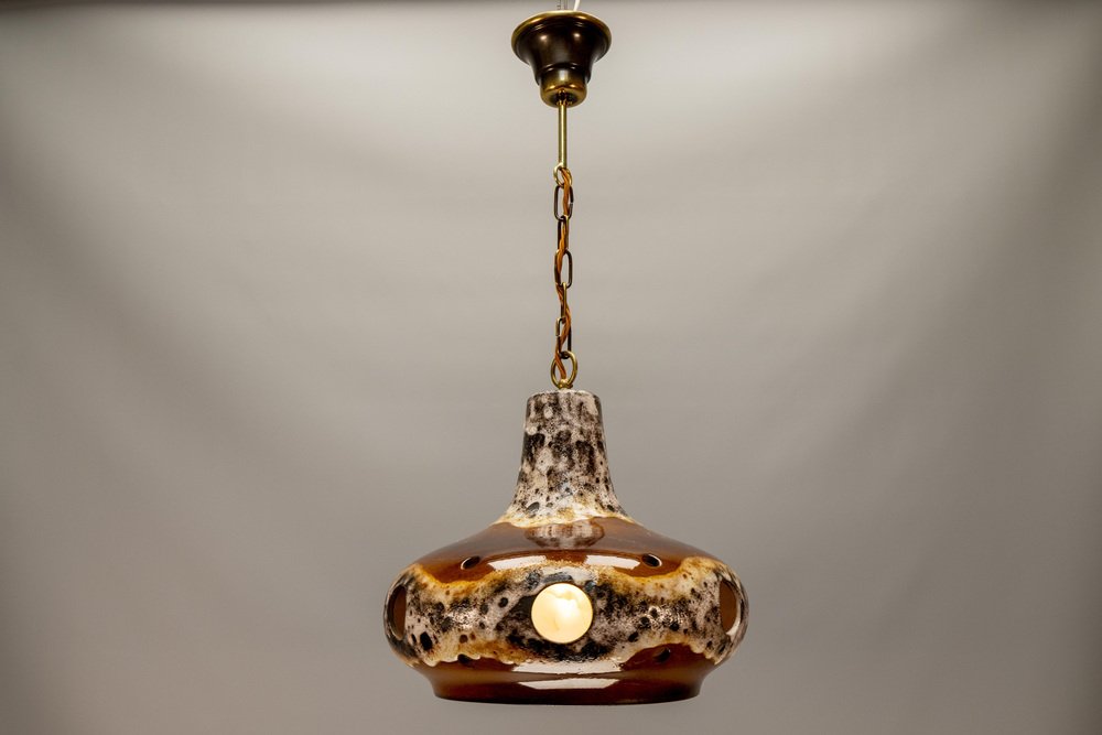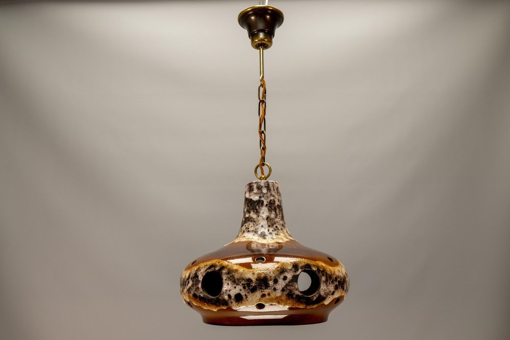 Deutsche Fat Lava Pendelleuchte, circa 1970er Jahre. Skulpturaler Keramikschirm mit reich strukturierter Glasur in Braun-, Ocker- und Cremetönen, typisch für die westdeutsche Fat Lava-Produktion. Kreisförmige Ausschnitte lassen sanftes Seitenlicht durch und sorgen gleichzeitig für einen warmen Lichtschein nach unten. Aufgehängt an einer Messingkette mit Metallbeschlägen, kombiniert sie ausdrucksstarke Keramik mit klassischen Mid-Century-Modern-Proportionen.