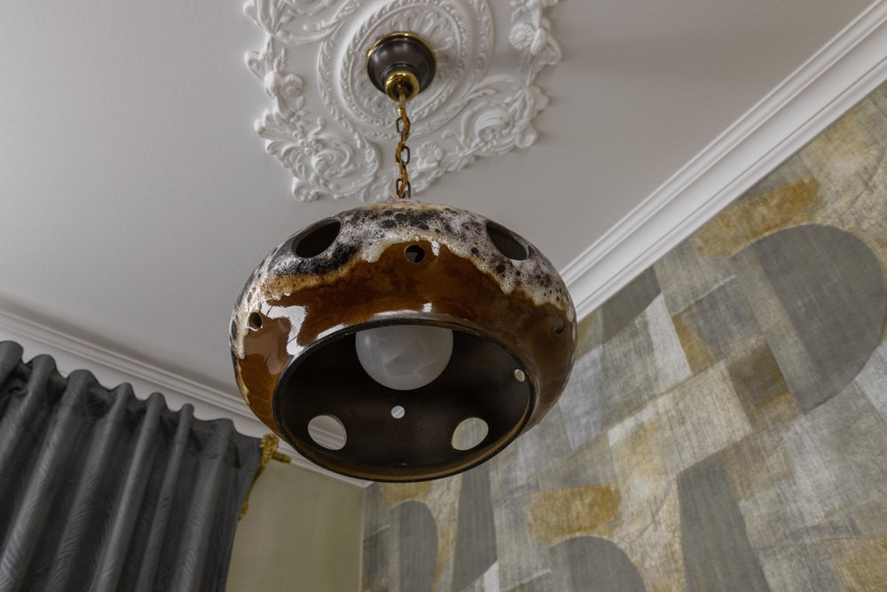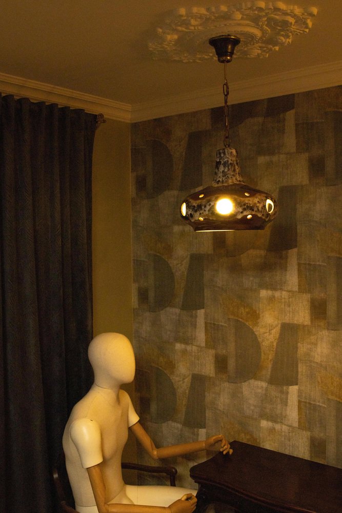 Ausgestattet mit einer E27-Fassung (E26-kompatibel). Guter Vintage-Zustand mit leichten Gebrauchsspuren an der Oberfläche und natürlichen Glasurunterschieden, die dem Alter entsprechen. Professionelle Installation empfohlen.