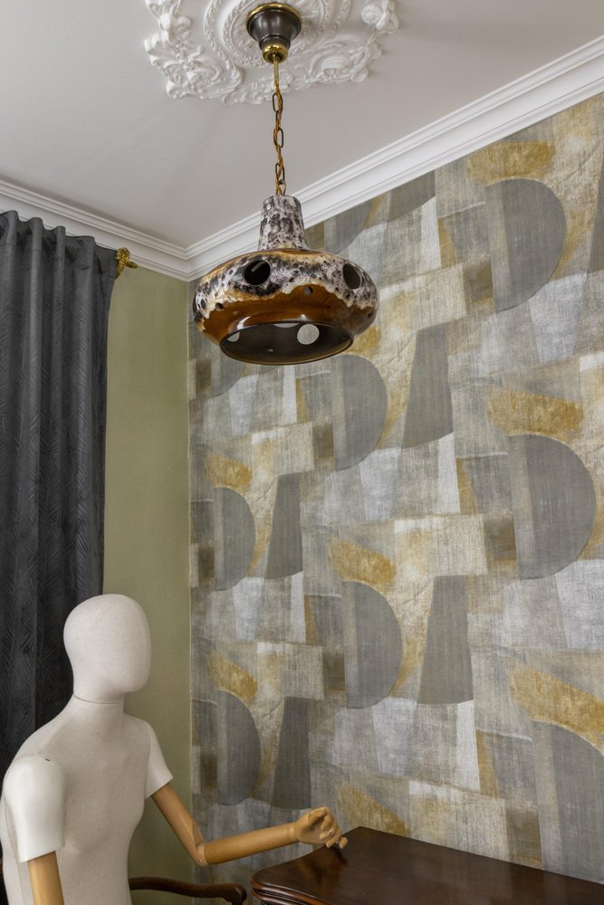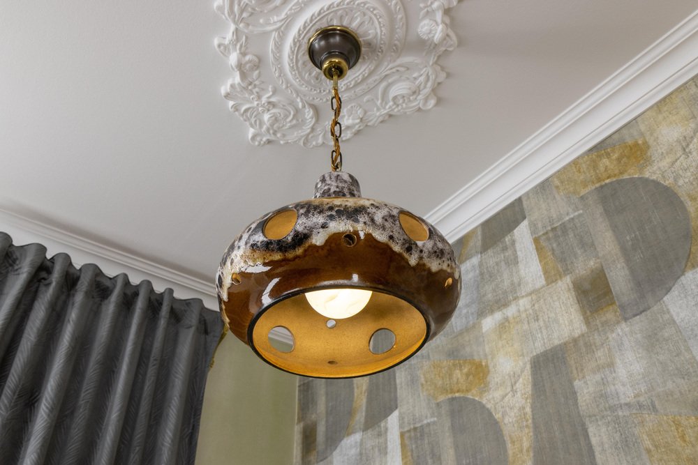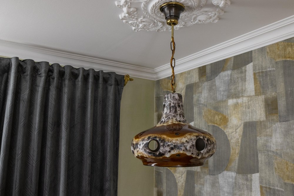 Suspended on a brass chain with metal fittings, combining expressive ceramics with classic Mid-Century Modern proportions.