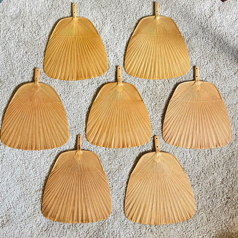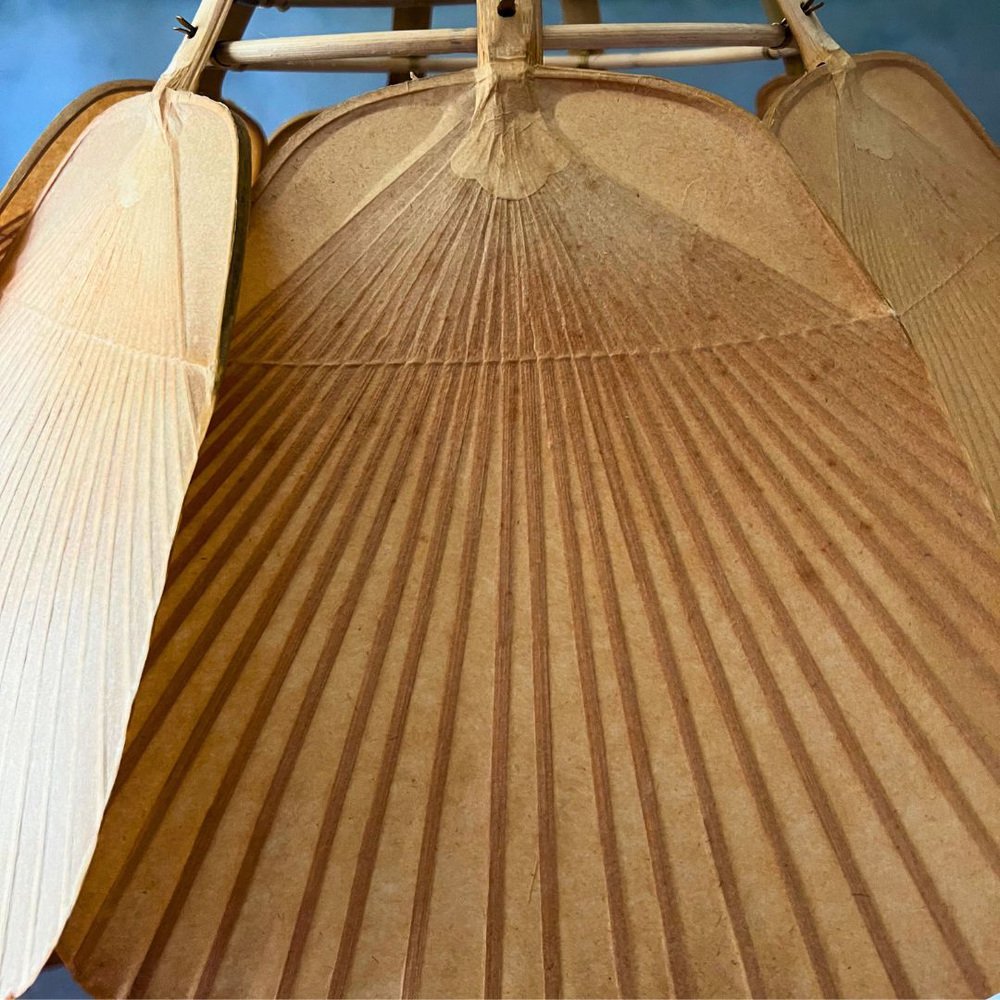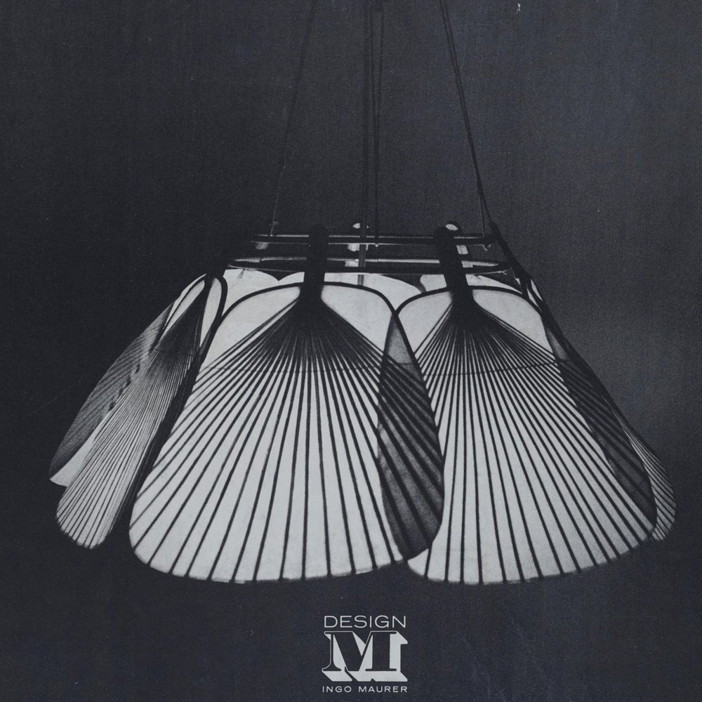 Ceiling lamp designed by Ingo Maurer (1932-2019) for Design M, Munich, known as the SHICHI model from the “Uchiwa” series, crafted in 1973. Even though it was made in the 1970s, this lamp still has its original box. It was only taken out for taking pictures. Constructed with a wooden frame holding seven overlapping leaf-shaped fans made of bamboo and beige-colored rice paper, secured with brass clamps. Features an adjustable holder composed of cords, internally equipped with a socket and lamp holder made from bamboo tubes. Assembled Dimensions: Height: Approximately 120 cm (adjustable). Diameter: Approximately 55 cm. Condition: Shows minimal signs of aging, evident in detailed photos. The cardboard box exhibits wear from storage. The lamp shown in the opening image is just an illustration, as this piece has never been assembled.