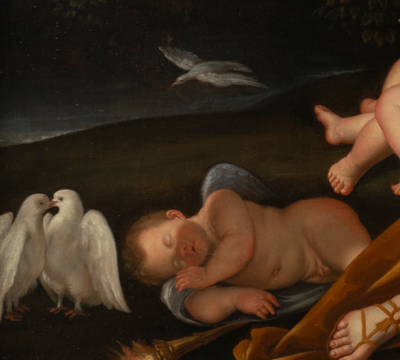 The painting is in very good condition for its age. The painting was restored and relined in the 19th century. According to the previous owner, it was cleaned and, because the canvas was brittle at the edges, relined again at the edges (see pictures).