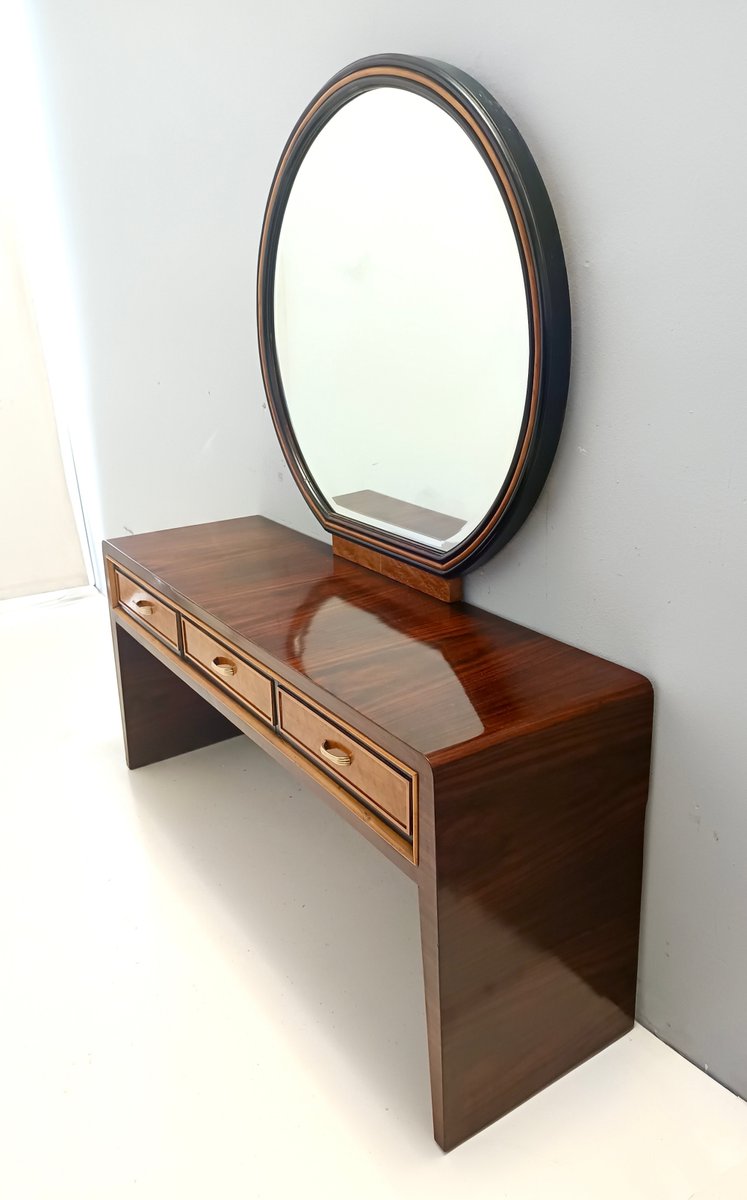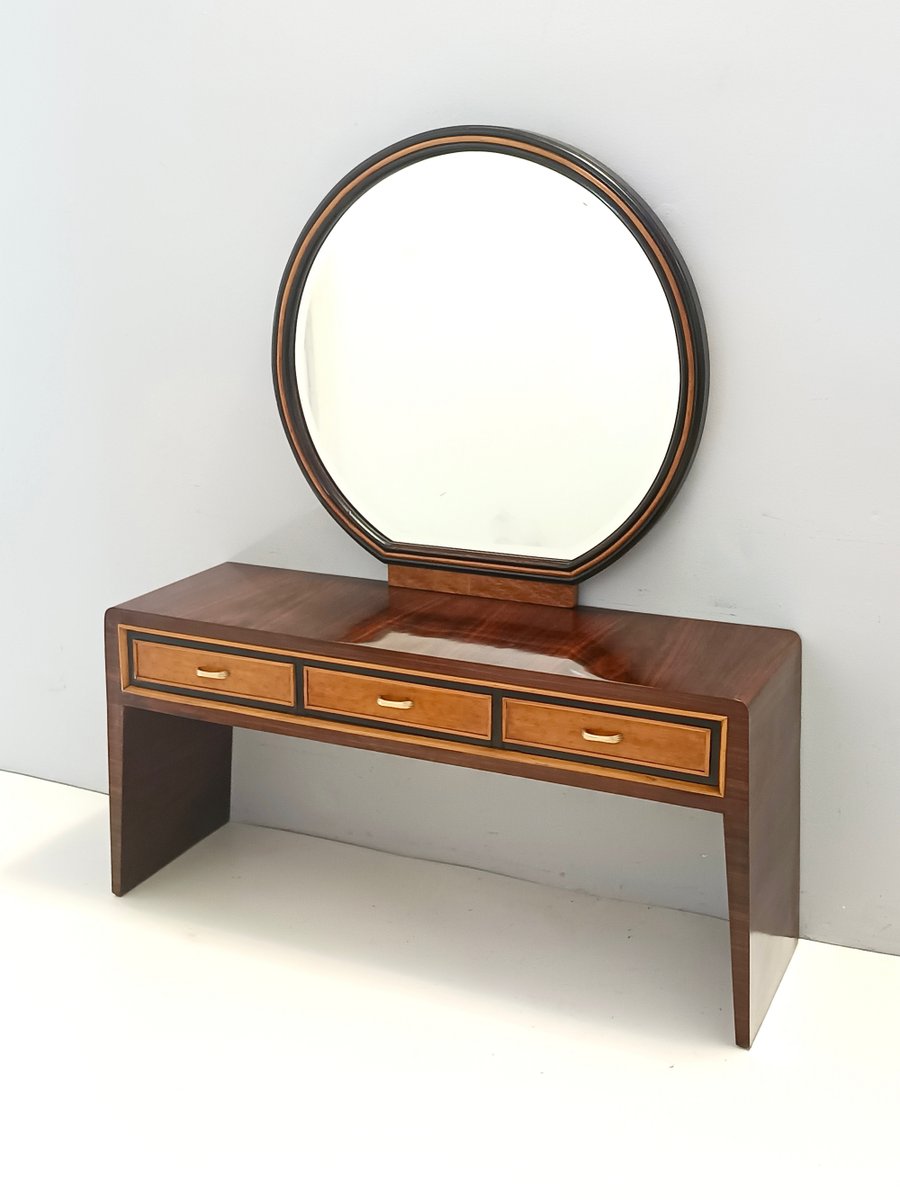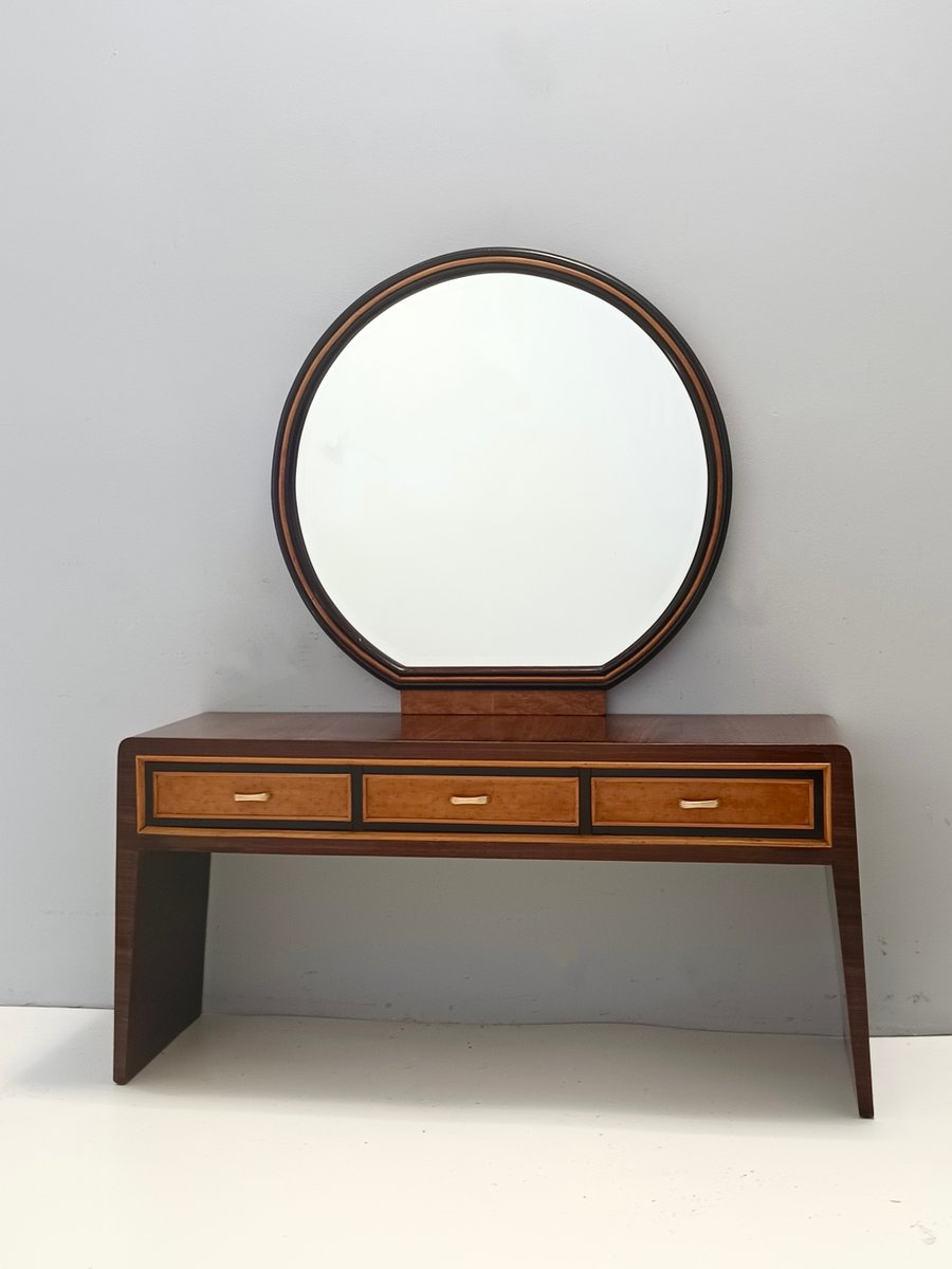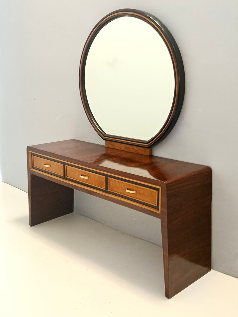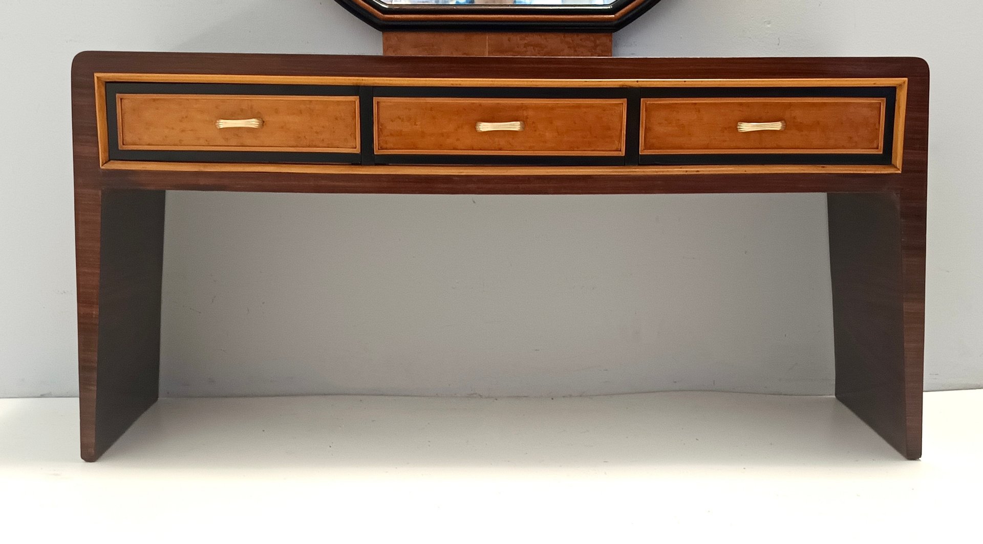 This console table / vanity table is made in ebonized walnut and birch. with brass handles.