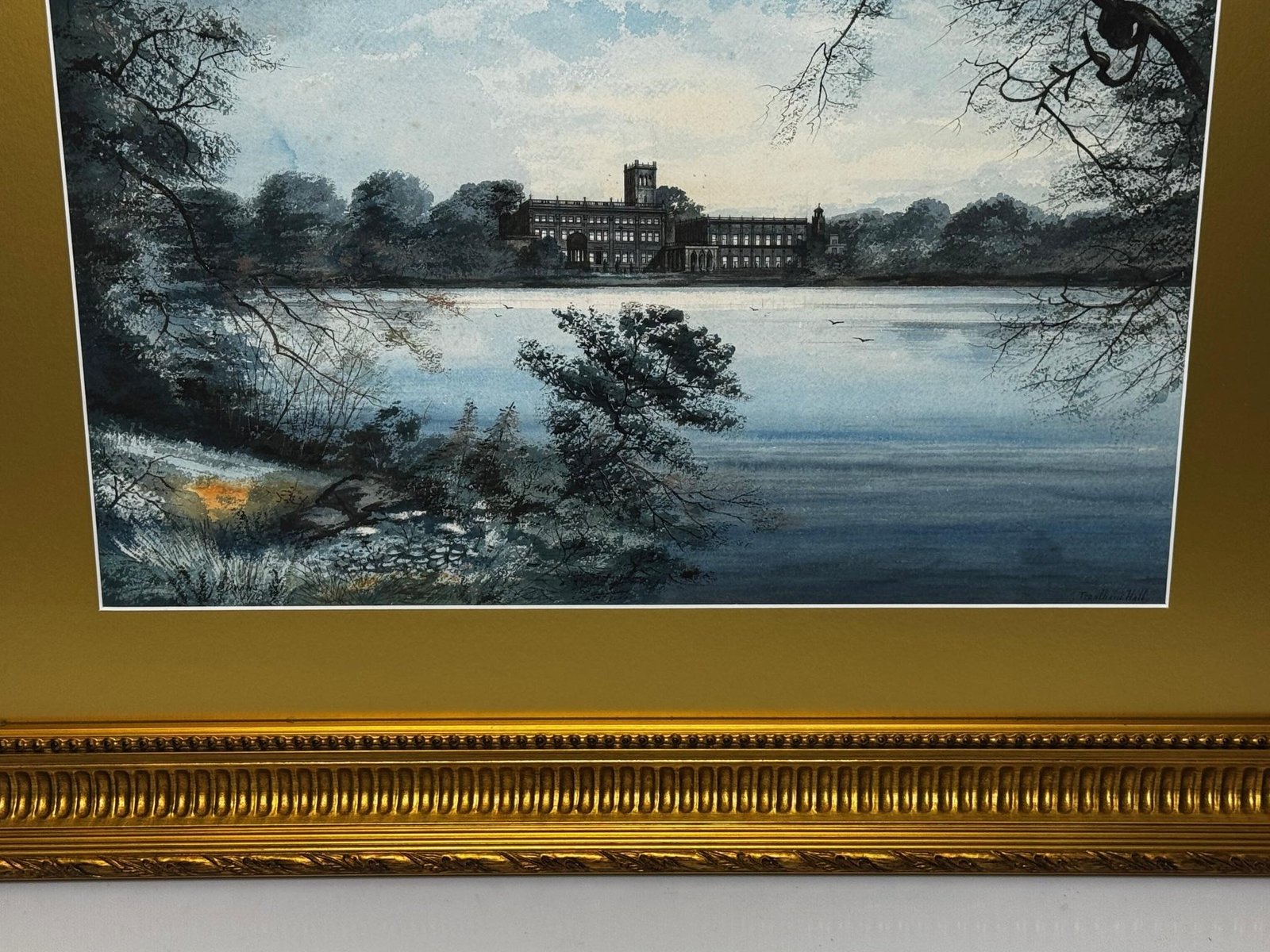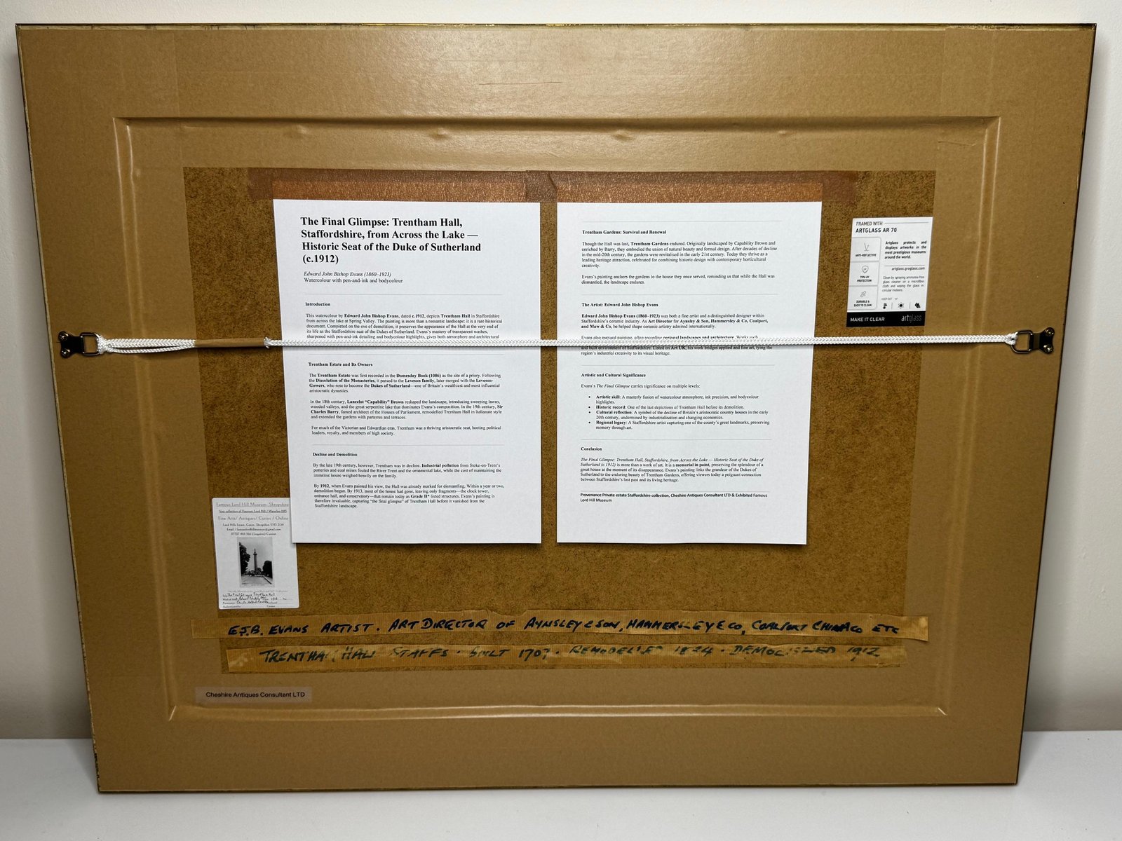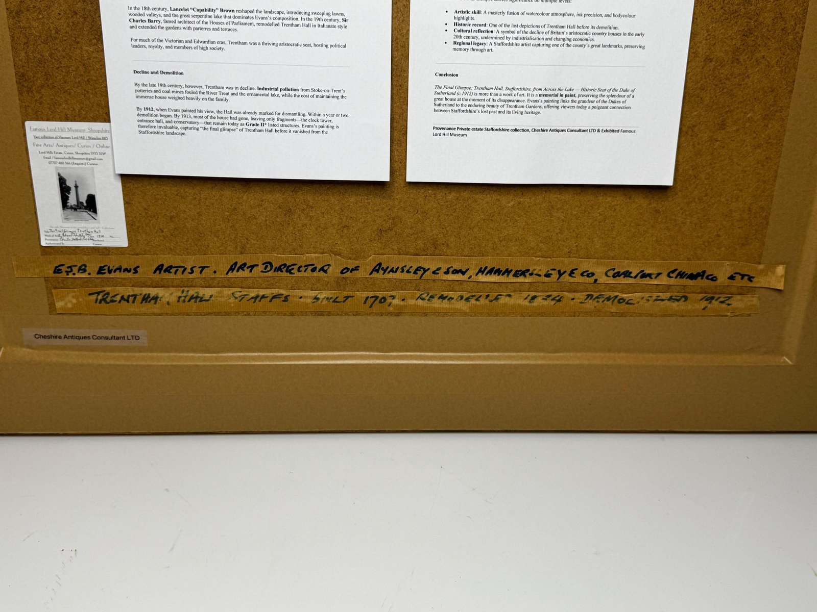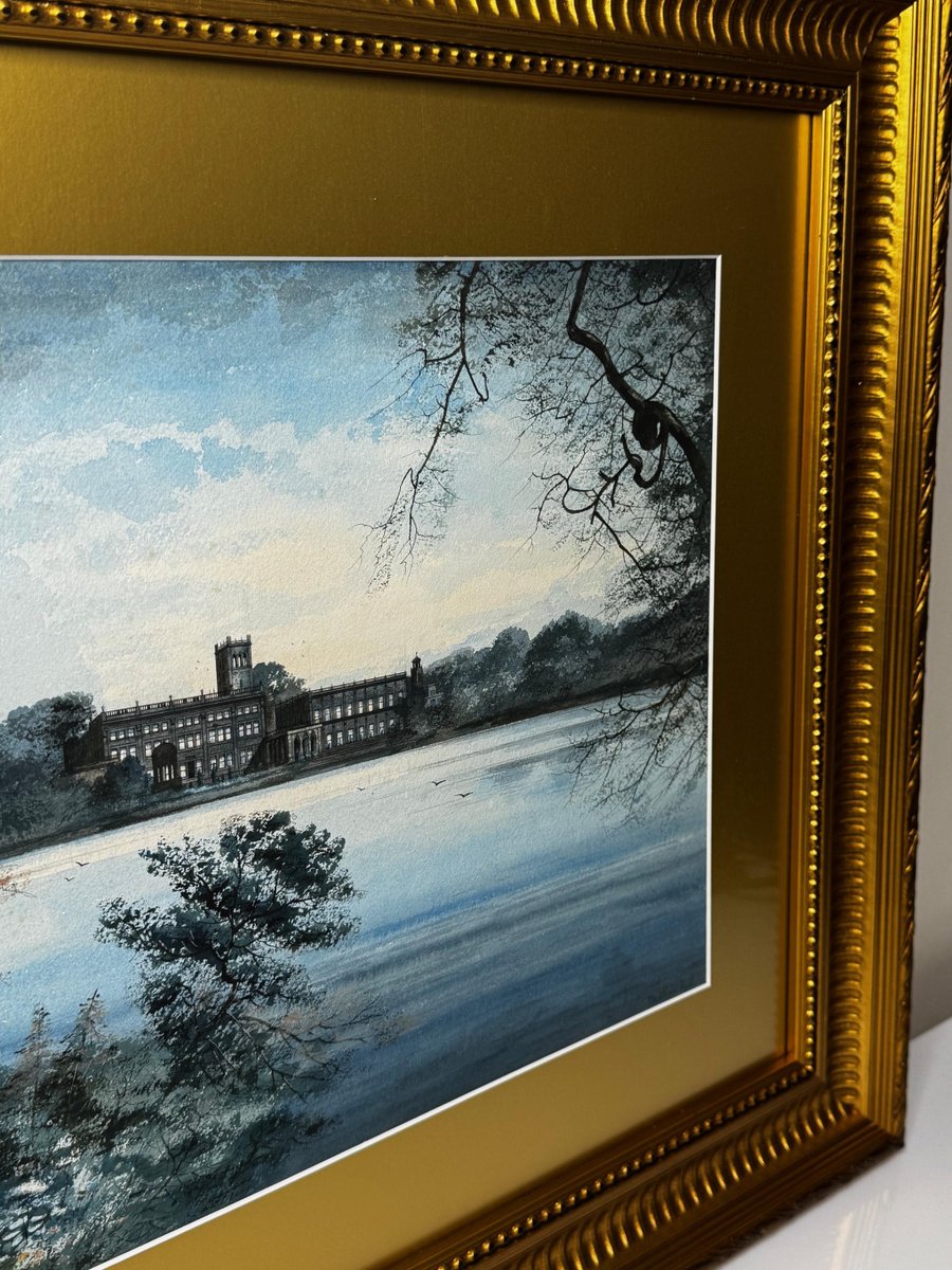 A Last View of Trentham Hall, Staffordshire (c.1912) Edward John Bishop Evans (1860–1923) Subject & Medium This evocative watercolour by Edward John Bishop Evans, painted circa 1912, captures not merely a landscape but a world on the brink of disappearance. Depicting Trentham Hall in Staffordshire, viewed across its reflective lake, the work stands as one of the last visual records of the Dukes of Sutherland’s great country seat, completed just before its demolition. Evans blends transparent washes, crisp pen-and-ink detailing, and subtle bodycolour highlights to achieve both atmosphere and precision. The result is at once an accomplished work of art and an irreplaceable historical document. Composition & Technique The composition is carefully balanced: Trentham Hall rises beyond the mirrored waters of the lake, framed by wooded slopes and softened skies. Evans’s use of watercolour washes creates depth and mood, while fine pen-and-ink lines articulate the architectural details. The restrained use of bodycolour provides luminosity, enriching textures and forms. The Story of Trentham Hall The history of Trentham stretches back nearly a thousand years: 1086: Recorded in the Domesday Book as the site of a priory. Post-Dissolution: The estate passed to the Leveson family, later merging with the Leveson-Gowers, who became Dukes of Sutherland. 18th century: Lancelot “Capability” Brown landscaped the grounds, introducing sweeping lawns, wooded valleys, and the serpentine lake. 19th century: Architect Sir Charles Barry remodelled the Hall into an Italianate palace with terraces, fountains, and formal parterres. By the Victorian and Edwardian eras, Trentham Hall was a seat of grandeur, hosting royalty, political leaders, and cultural figures. Yet industrial pollution from Stoke’s potteries and the cost of maintaining such a vast residence led to decline. By 1912, when Evans painted this serene view, demolition was imminent. Within a year the house was dismantled, leaving the gardens—designed by Brown and Barry—as the lasting legacy. Today those gardens flourish as one of Britain’s leading heritage attractions, while Evans’s painting serves as a poignant reminder of the lost Hall. Conclusion A Last View of Trentham Hall is more than a picturesque landscape: it is a memorial in watercolour, preserving the grandeur of Trentham Hall while linking it to the gardens that endure. For collectors of historic British watercolours, Staffordshire heritage, or country house art, this work represents a rare survival—an image of beauty at the threshold of loss. Signed Lower right, in watercolour: Edward J. B. Evans About the Artist Edward John Bishop Evans (1860–1923) was a Staffordshire painter and an influential art director in the region’s ceramic industry, contributing designs to Aynsley, Hammersley & Co, Coalport, and Maw & Co. He also documented the landscapes and architecture of Staffordshire in watercolour, many of which are now in museum collections and listed on Art UK. His dual role as artist and cultural historian ensures his work carries both artistic and documentary significance. Artistic & Cultural Importance Artistic mastery: Atmospheric washes with precise detailing. Historical witness: Among the final depictions of Trentham Hall. Cultural symbolism: A reflection of Britain’s fading country house era. Regional pride: A Staffordshire artist preserving a Staffordshire jewel. Frame Reframed in a gold-leaf scoop-profile Larson Juhl gilt moulded frame, paired with a fitted acid-free gold mount and protected by museum-quality AR70 anti-reflective glass. Elegant presentation with full conservation protection. Dimensions (Framed) 82 cm wide × 64.5 cm high × 4.5 cm deep Provenance Private estate, Staffordshire collection. Exhibited at the Lord Hill Museum Why Collectors Will Value It A unique record of one of Staffordshire’s greatest lost houses Both a fine artwork and a piece of history Signed by an important Staffordshire artist Elegantly presented and ready to hang