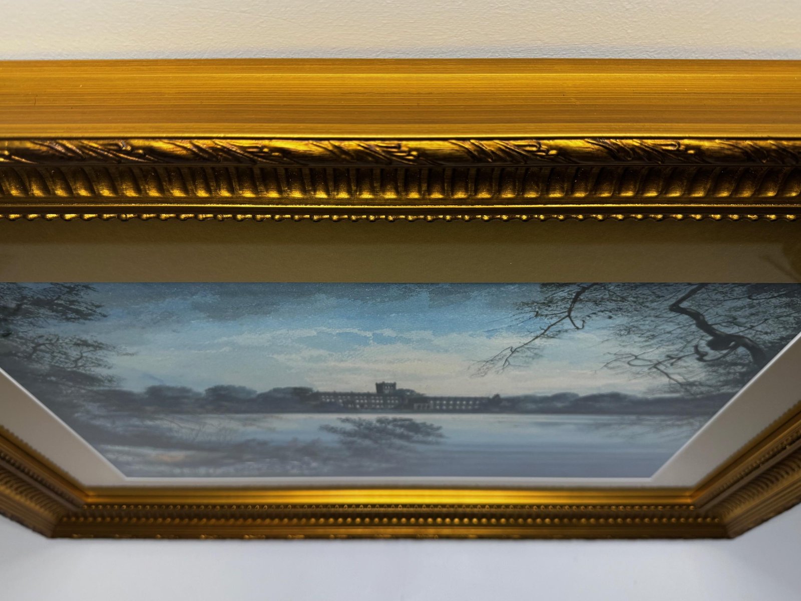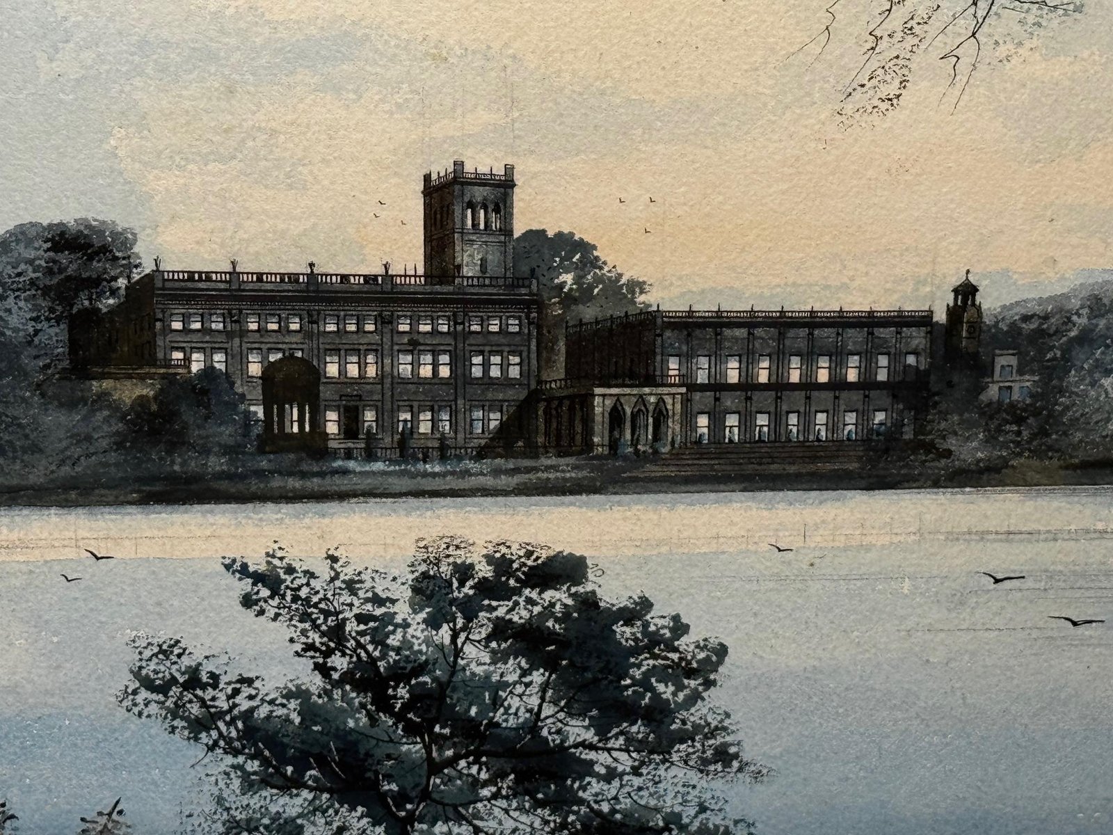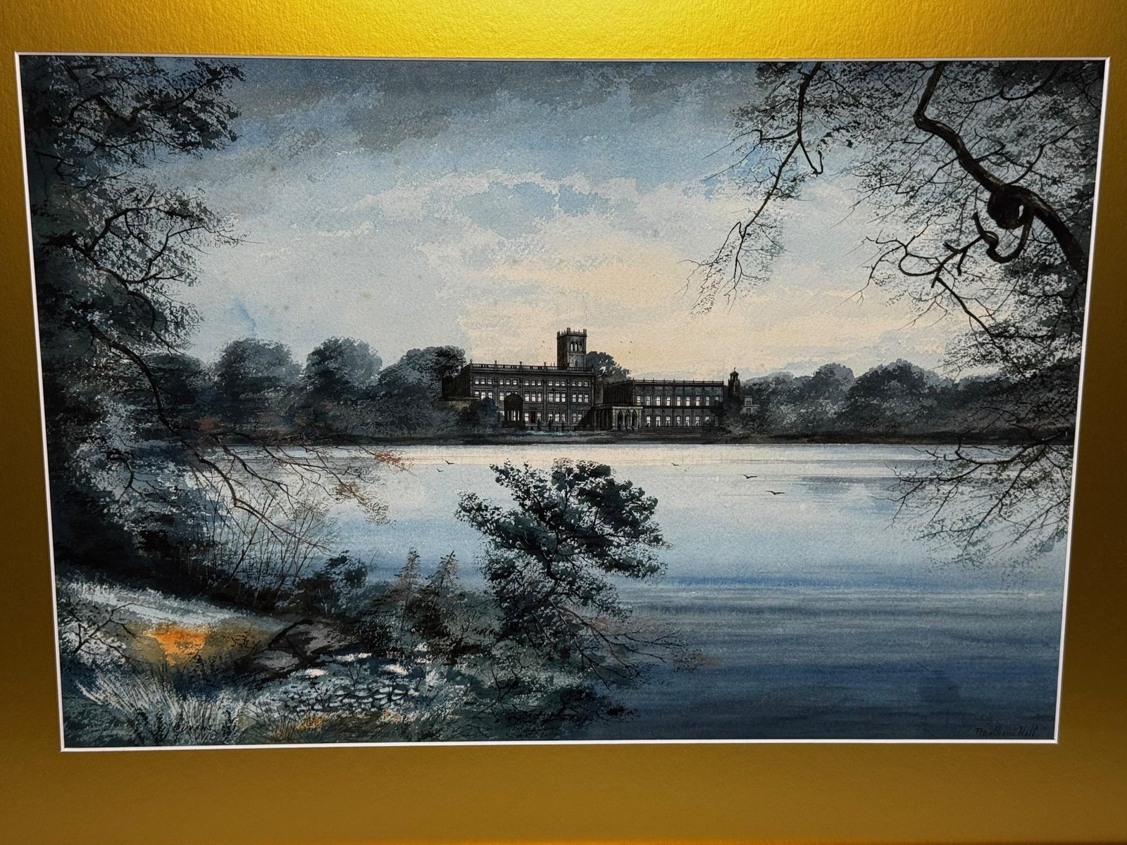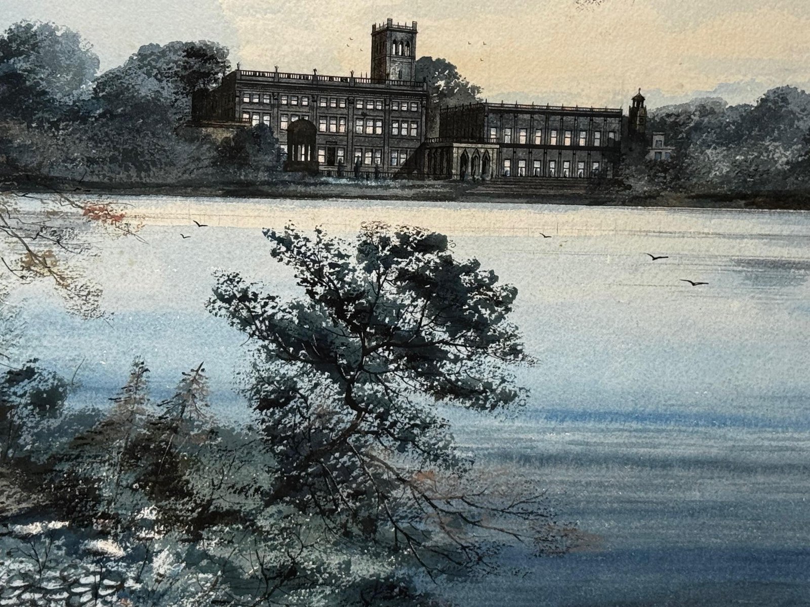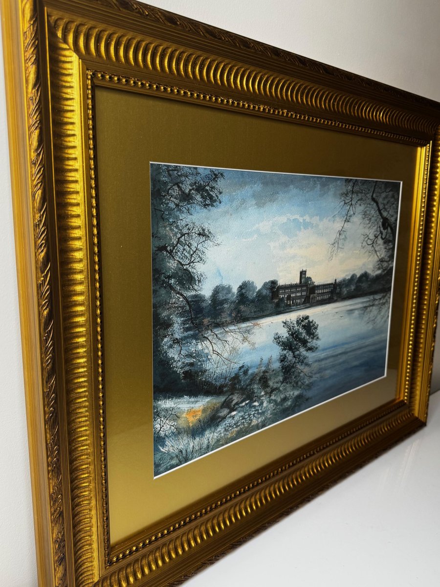 A Last View of Trentham Hall, Staffordshire (c.1912) Edward John Bishop Evans (1860–1923) Subject & Medium This evocative watercolour by Edward John Bishop Evans, painted circa 1912, captures not merely a landscape but a world on the brink of disappearance. Depicting Trentham Hall in Staffordshire, viewed across its reflective lake, the work stands as one of the last visual records of the Dukes of Sutherland’s great country seat, completed just before its demolition. Evans blends transparent washes, crisp pen-and-ink detailing, and subtle bodycolour highlights to achieve both atmosphere and precision. The result is at once an accomplished work of art and an irreplaceable historical document. Composition & Technique The composition is carefully balanced: Trentham Hall rises beyond the mirrored waters of the lake, framed by wooded slopes and softened skies. Evans’s use of watercolour washes creates depth and mood, while fine pen-and-ink lines articulate the architectural details. The restrained use of bodycolour provides luminosity, enriching textures and forms. The Story of Trentham Hall The history of Trentham stretches back nearly a thousand years: 1086: Recorded in the Domesday Book as the site of a priory. Post-Dissolution: The estate passed to the Leveson family, later merging with the Leveson-Gowers, who became Dukes of Sutherland. 18th century: Lancelot “Capability” Brown landscaped the grounds, introducing sweeping lawns, wooded valleys, and the serpentine lake. 19th century: Architect Sir Charles Barry remodelled the Hall into an Italianate palace with terraces, fountains, and formal parterres. By the Victorian and Edwardian eras, Trentham Hall was a seat of grandeur, hosting royalty, political leaders, and cultural figures. Yet industrial pollution from Stoke’s potteries and the cost of maintaining such a vast residence led to decline. By 1912, when Evans painted this serene view, demolition was imminent. Within a year the house was dismantled, leaving the gardens—designed by Brown and Barry—as the lasting legacy. Today those gardens flourish as one of Britain’s leading heritage attractions, while Evans’s painting serves as a poignant reminder of the lost Hall. Conclusion A Last View of Trentham Hall is more than a picturesque landscape: it is a memorial in watercolour, preserving the grandeur of Trentham Hall while linking it to the gardens that endure. For collectors of historic British watercolours, Staffordshire heritage, or country house art, this work represents a rare survival—an image of beauty at the threshold of loss. Signed Lower right, in watercolour: Edward J. B. Evans About the Artist Edward John Bishop Evans (1860–1923) was a Staffordshire painter and an influential art director in the region’s ceramic industry, contributing designs to Aynsley, Hammersley & Co, Coalport, and Maw & Co. He also documented the landscapes and architecture of Staffordshire in watercolour, many of which are now in museum collections and listed on Art UK. His dual role as artist and cultural historian ensures his work carries both artistic and documentary significance. Artistic & Cultural Importance Artistic mastery: Atmospheric washes with precise detailing. Historical witness: Among the final depictions of Trentham Hall. Cultural symbolism: A reflection of Britain’s fading country house era. Regional pride: A Staffordshire artist preserving a Staffordshire jewel. Frame Reframed in a gold-leaf scoop-profile Larson Juhl gilt moulded frame, paired with a fitted acid-free gold mount and protected by museum-quality AR70 anti-reflective glass. Elegant presentation with full conservation protection. Dimensions (Framed) 82 cm wide × 64.5 cm high × 4.5 cm deep Provenance Private estate, Staffordshire collection. Exhibited at the Lord Hill Museum Why Collectors Will Value It A unique record of one of Staffordshire’s greatest lost houses Both a fine artwork and a piece of history Signed by an important Staffordshire artist Elegantly presented and ready to hang