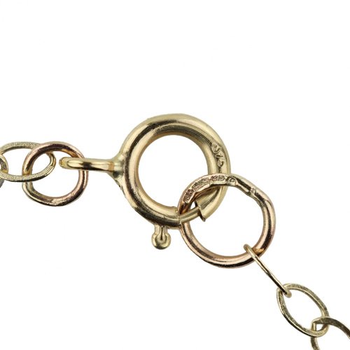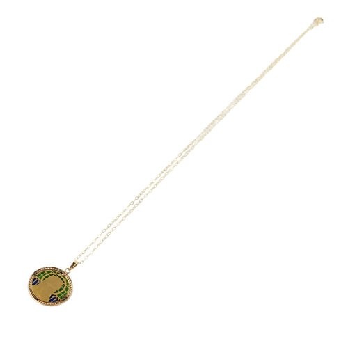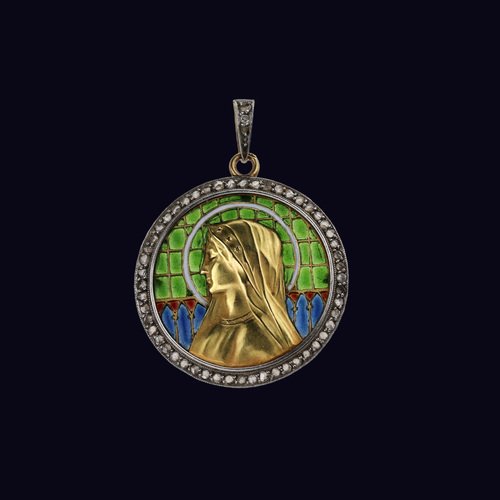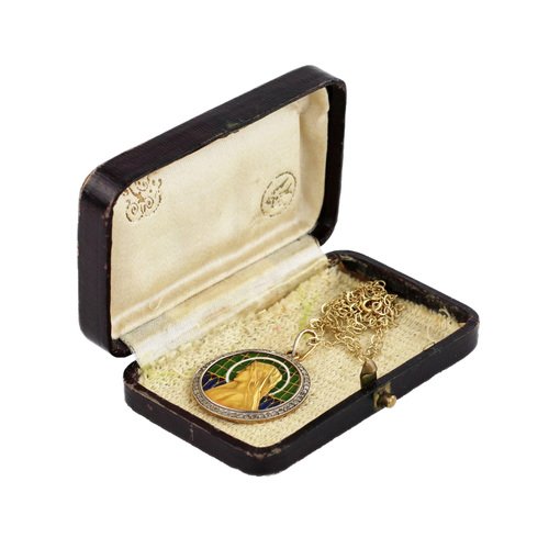 Ein Gold Anhänger an einer Kette mit Unserer Lieben Frau auf Glasmalerei, in einem antiken Etui.