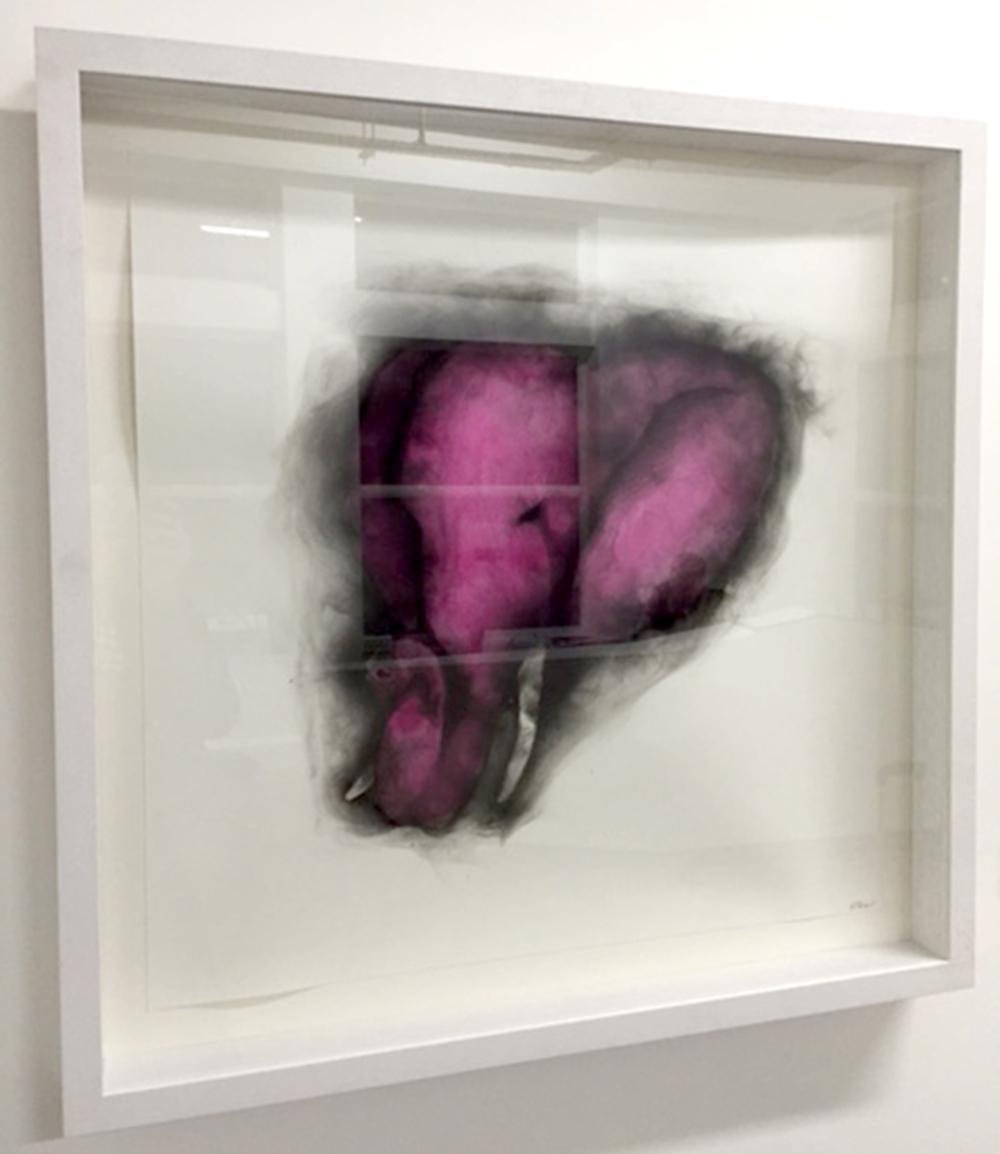 Elephant in the Room II - smoke on paper, framed on a contemporary box frame - all archival materials. Artwork size: 32x32 inches Frame size: 36x36x3 inches Frame style: white wood box frame, UV glass, archival mat board The Smokes consist of images that are created by capturing smoke on paper as evidence of a transformation and preservation of the ephemeral. During the process, credit cards, gift cards, photos, and even slides of the artists’ artwork are burned to remove their growing presence in daily life, and explore the idea of transformation. In 2014, Rob was awarded the John Ringling Towers Visual Artist Grant by the Arts and Cultural Alliance of Sarasota. In 2009, he was awarded a fellowship at the Virginia Center for Creative Arts. In 2007, he was awarded a Virginia Museum of Fine Arts Professional Artist Fellowship, received and Honorable Mention from the Loyola Works on Paper Exhibition at Loyola University and was the recipient of a Purchase Award at the 31st Bradley International Print & Drawing Exhibition. In 2006, Rob was awarded the Drawing Award at the Peninsula Fine Art Center Biennial. Rob has been featured in more than 50 articles in publications, and blogs, including New American Paintings, the Huffington Post UK, Daily Mail UK, Installation Magazine, and Studio Visit (volumes 1, 4, 6 and 8). Lark Books featured a Smoke and a Struggle in the books: Skulls in 2008, 500 Ceramic Sculptures in 2009, and Ceramic Sculptures in 2011. His collections include: The Fralin Museum of Art at the University of Virginia (December, 2013), Ripley’s Believe It Or Not, Orlando, FL, St. Regis in Washington DC, and Four Seasons Hotel in Houston, Texas. In 2010, Rob was awarded four residencies, two from the Virginia Center for Creative Arts, Amherst, Virginia and Moulin à Nef in Auvillar, France and Ragdale Foundation. In 2015, Rob will be a resident at the Hermitage Artist Retreat in Englewood, Florida. Rob began his education at Auburn University receiving his BFA in Painting and Graphic Design. At the University of Tennessee, Rob earned and MFA in Painting and Drawing and and MS in Curriculum and Instruction.