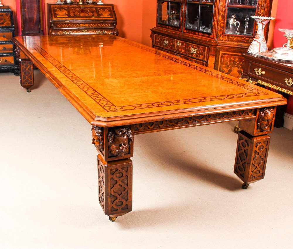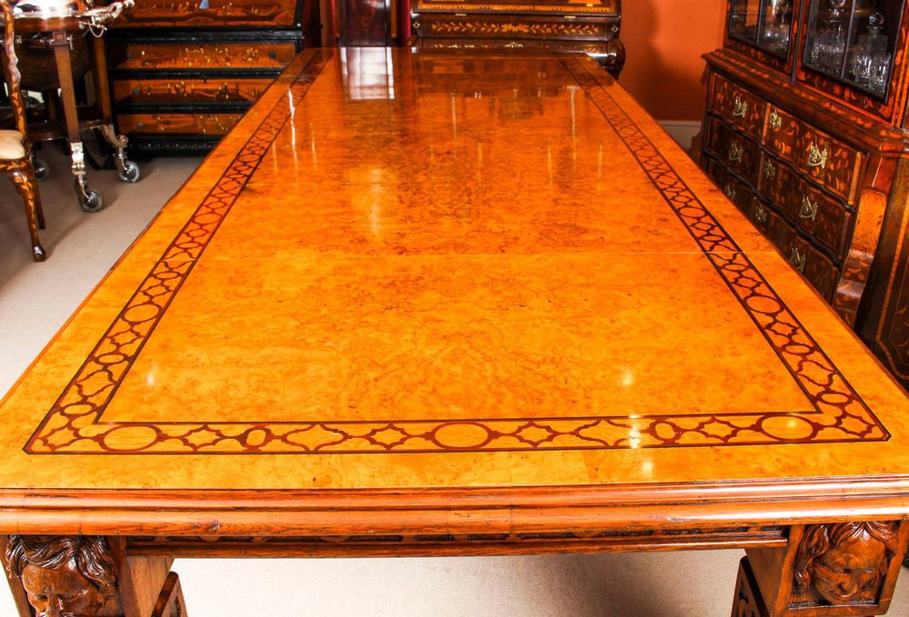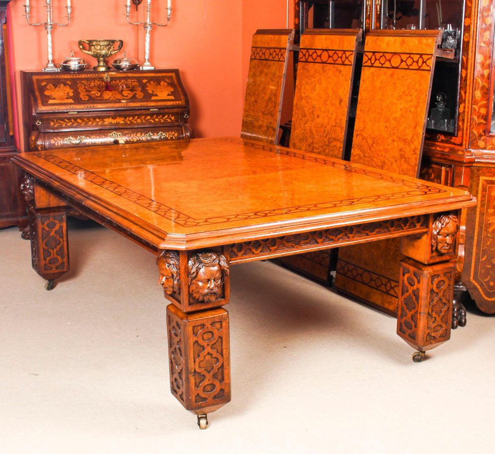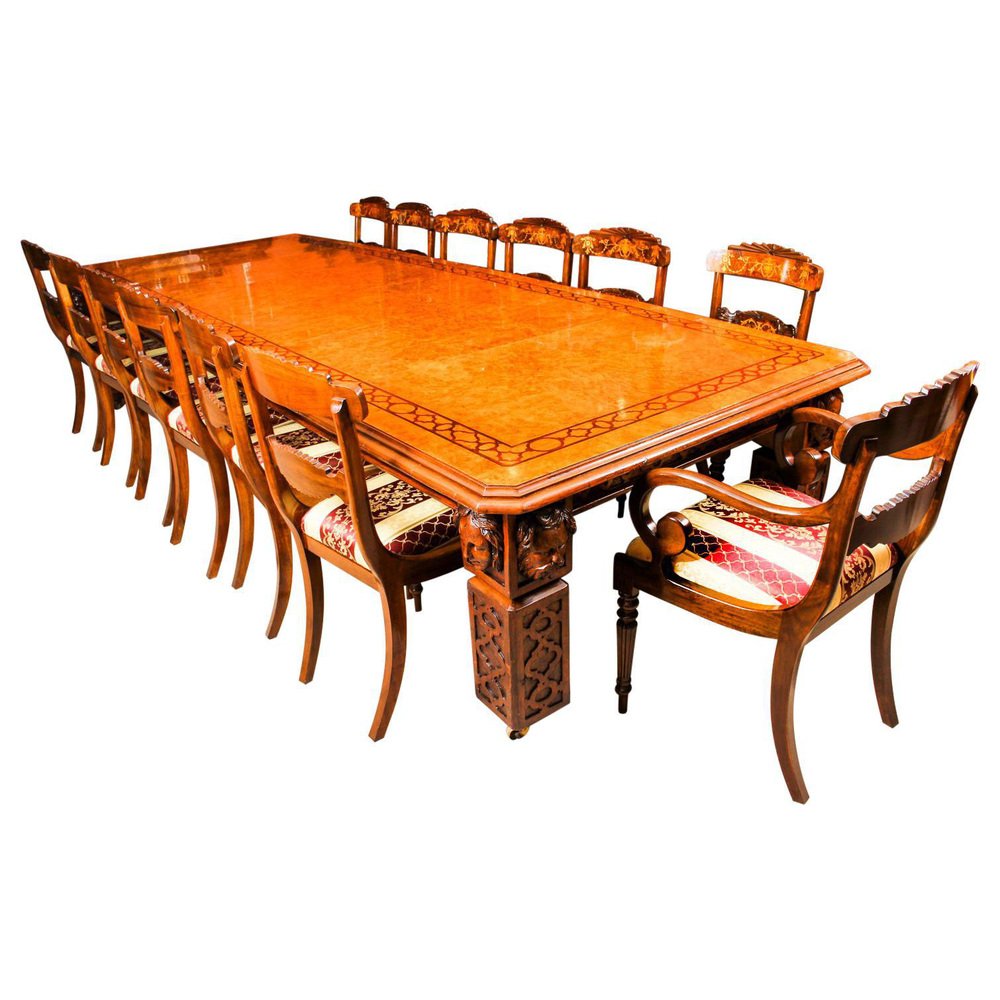 There is no mistaking the style and sophisticated design of this dining set comprising an exquisite rare English antique Elizabethan Revival pollard oak extending dining table, circa 1850 in date and a set of fourteen vintage dining chairs. The table with a striking rectangular pollard oak top with canted corners, inlaid marquetry decoration to match the fret carved frieze, and a moulded edge over the already mentioned beautiful hand carved frieze. This majestic table has four leaf extensions and can comfortably seat fourteen. This striking table has been handcrafted from solid oak which is not only strong, but has a beautiful grain. The top is in Pollard, oak with twin line inlaid marquetry decoration, which is seen in the intricate burr on the tabletop. The four leaf extensions can be added or removed as required to suit the occasion by a special winding mechanism. The table is raised on massive hand carved square section legs with blind fret moulding, headed by carved masks, and terminating in brass castors. The stunning set of fourteen vintage burr walnut and inlaid marquetry dining chairs complement the table beautifully. The set comprises a pair of armchairs along with a total of twelve side chairs. The chairs are made from solid walnut and also feature marquetry inlaid decoration along the same lines as the table. For your seating comfort, the chairs in this set have beautifully reupholstered and feature drop in seats which can quickly and easily be removed leaving the cane seats below available to provide a cooler seating option in warmer weather. This impressive dining set is exemplary of the early Victorian era with its Pollard oak and delicate inlaid marquetry. It will Stand out in your dining or conference room and will become the key piece in your furnishing collection. Condition: In excellent condition having been beautifully cleaned, French polished and waxed in our workshops, please see photos for confirmation. Dimensions in cm: Height 77 x width 360 x depth 142 - fully extended Height 77 x width 160 x depth 142 - with all leaves removed Height 105 x width 48 x depth 46 - chair Height 105 x width 56 x depth 53 - armchairs Height 53 - seat height Dimensions in inches: Height 30.3 x width 141.7 x depth 55.9 - fully extended Height 30.3 x width 63.0 x depth 55.9 - with all leaves removed Height 41.3 x width 18.9 x depth 18.1 - chair Height 41.3 x width 22.0 x depth 20.9 - armchairs Height 20.9 - seat height Pollard oak Pollarding is a pruning system in which the upper branches of a tree are removed, promoting a dense head of foliage and branches. It has been common in Europe since medieval times and is practiced today in urban areas worldwide, primarily to maintain trees at a predetermined height. The bole of the tree, constantly cut back over a period of years, will eventually form a Lump, or ‘burr’, which when sawn for veneer, gives a lovely grained, swirling figure. The effect is similar to that of burr walnut with its distinctive speckled grain. Burrs, or ‘burls’, are growths which appear on the side of tree trunks, resulting from a tree undergoing some form of stress. They may be caused by an injury, virus or fungus. During the 19th century great strides were made in the mechanization of cabinet making. Marc Isambard Brunel [Isambard Kingdom’s father] built the first steam driven saw mill, and invented a circular saw that could be used to cut veneers thinly and evenly for the first time. He also developed the first hydraulic veneer press. The figured wood cut from burrs and pollards is notoriously difficult to cut and lay: the wild grain which makes it so attractive results in a very delicate, brittle veneer. The new machines enabled the Victorian craftsmen to make the most of these beautiful timbers. Winding mechanism for extending tables Were first made in the early 19th century. A man by the name of Samuel Hawkins applied for a patent on a screw expander on June 6th, 1861. Presumably, Mr. Hawkins either died or retired because his business was taken over by a young machinist named Joseph Fitter in 1864. Joseph Fitter operated a machinist shop where he produced winding mechanisms for extending tables as well as screw expanders for piano stools and other applications at 210 Cheapside, Birmingham England by the name of Britannia Works.
