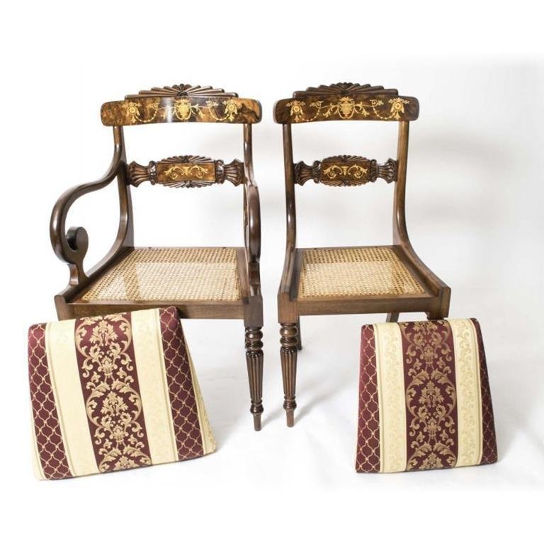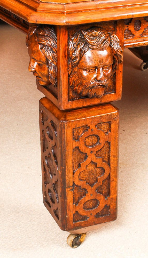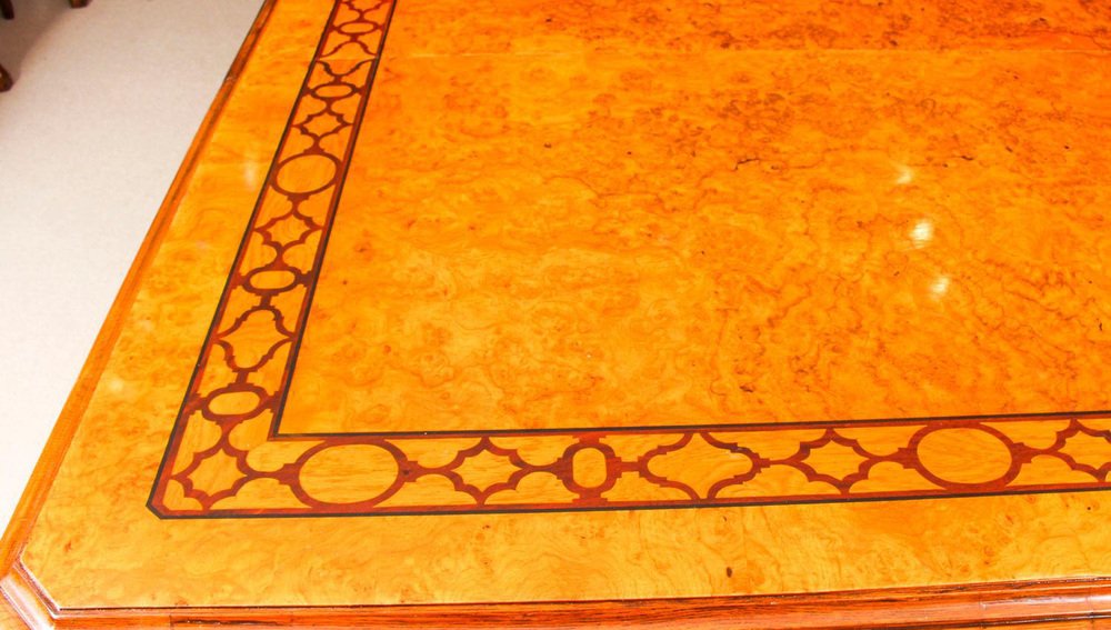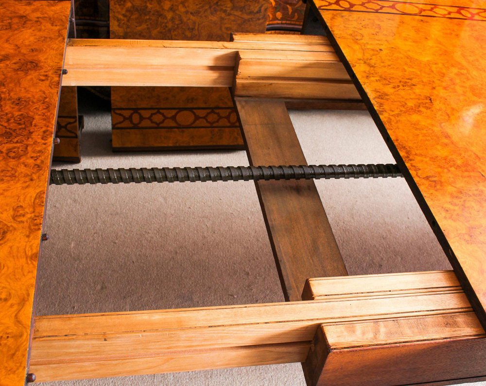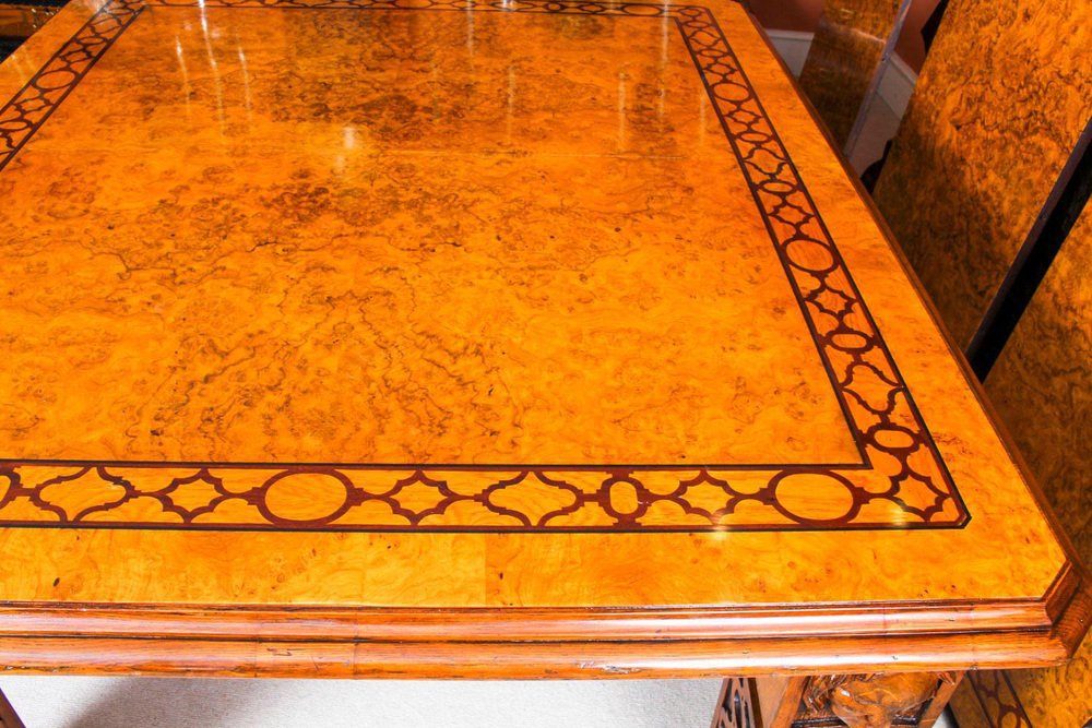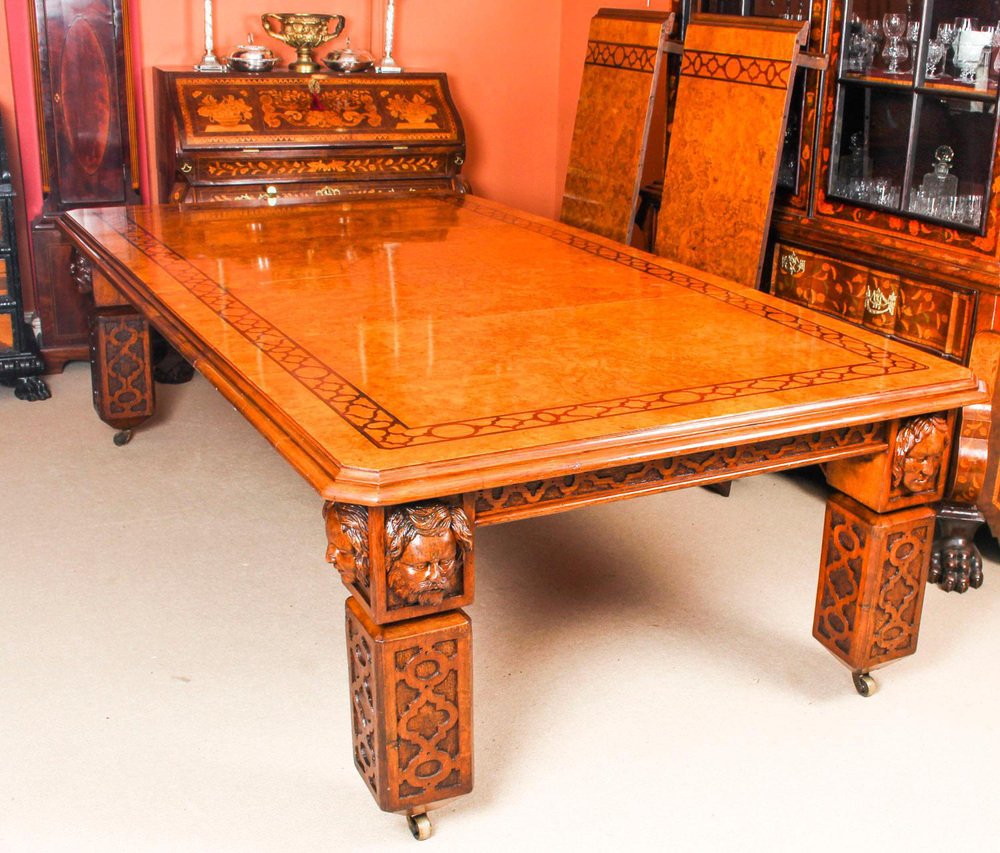 There is no mistaking the style and sophisticated design of this dining set comprising an exquisite rare English antique Elizabethan Revival pollard oak extending dining table, circa 1850 in date and a set of fourteen vintage dining chairs. The table with a striking rectangular pollard oak top with canted corners, inlaid marquetry decoration to match the fret carved frieze, and a moulded edge over the already mentioned beautiful hand carved frieze. This majestic table has four leaf extensions and can comfortably seat fourteen. This striking table has been handcrafted from solid oak which is not only strong, but has a beautiful grain. The top is in Pollard, oak with twin line inlaid marquetry decoration, which is seen in the intricate burr on the tabletop. The four leaf extensions can be added or removed as required to suit the occasion by a special winding mechanism. The table is raised on massive hand carved square section legs with blind fret moulding, headed by carved masks, and terminating in brass castors. The stunning set of fourteen vintage burr walnut and inlaid marquetry dining chairs complement the table beautifully. The set comprises a pair of armchairs along with a total of twelve side chairs. The chairs are made from solid walnut and also feature marquetry inlaid decoration along the same lines as the table. For your seating comfort, the chairs in this set have beautifully reupholstered and feature drop in seats which can quickly and easily be removed leaving the cane seats below available to provide a cooler seating option in warmer weather. This impressive dining set is exemplary of the early Victorian era with its Pollard oak and delicate inlaid marquetry. It will Stand out in your dining or conference room and will become the key piece in your furnishing collection. Condition: In excellent condition having been beautifully cleaned, French polished and waxed in our workshops, please see photos for confirmation. Dimensions in cm: Height 77 x width 360 x depth 142 - fully extended Height 77 x width 160 x depth 142 - with all leaves removed Height 105 x width 48 x depth 46 - chair Height 105 x width 56 x depth 53 - armchairs Height 53 - seat height Dimensions in inches: Height 30.3 x width 141.7 x depth 55.9 - fully extended Height 30.3 x width 63.0 x depth 55.9 - with all leaves removed Height 41.3 x width 18.9 x depth 18.1 - chair Height 41.3 x width 22.0 x depth 20.9 - armchairs Height 20.9 - seat height Pollard oak Pollarding is a pruning system in which the upper branches of a tree are removed, promoting a dense head of foliage and branches. It has been common in Europe since medieval times and is practiced today in urban areas worldwide, primarily to maintain trees at a predetermined height. The bole of the tree, constantly cut back over a period of years, will eventually form a Lump, or ‘burr’, which when sawn for veneer, gives a lovely grained, swirling figure. The effect is similar to that of burr walnut with its distinctive speckled grain. Burrs, or ‘burls’, are growths which appear on the side of tree trunks, resulting from a tree undergoing some form of stress. They may be caused by an injury, virus or fungus. During the 19th century great strides were made in the mechanization of cabinet making. Marc Isambard Brunel [Isambard Kingdom’s father] built the first steam driven saw mill, and invented a circular saw that could be used to cut veneers thinly and evenly for the first time. He also developed the first hydraulic veneer press. The figured wood cut from burrs and pollards is notoriously difficult to cut and lay: the wild grain which makes it so attractive results in a very delicate, brittle veneer. The new machines enabled the Victorian craftsmen to make the most of these beautiful timbers. Winding mechanism for extending tables Were first made in the early 19th century. A man by the name of Samuel Hawkins applied for a patent on a screw expander on June 6th, 1861. Presumably, Mr. Hawkins either died or retired because his business was taken over by a young machinist named Joseph Fitter in 1864. Joseph Fitter operated a machinist shop where he produced winding mechanisms for extending tables as well as screw expanders for piano stools and other applications at 210 Cheapside, Birmingham England by the name of Britannia Works.