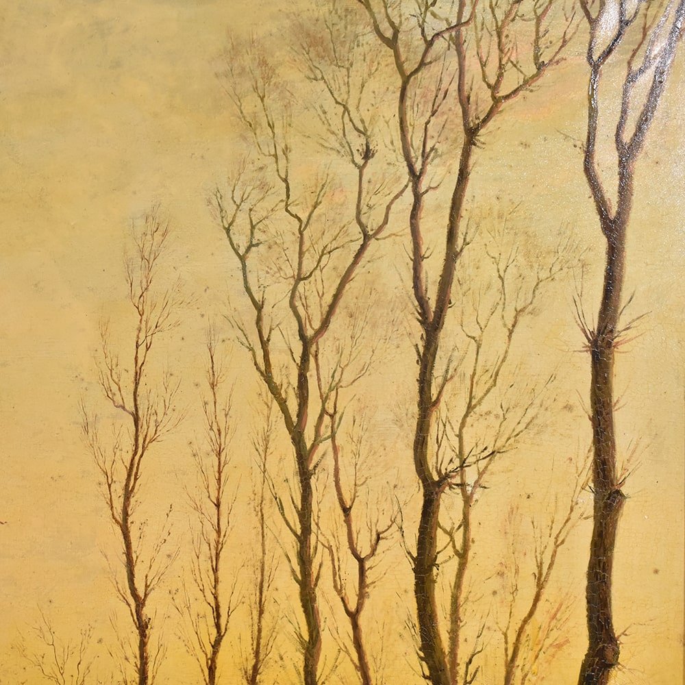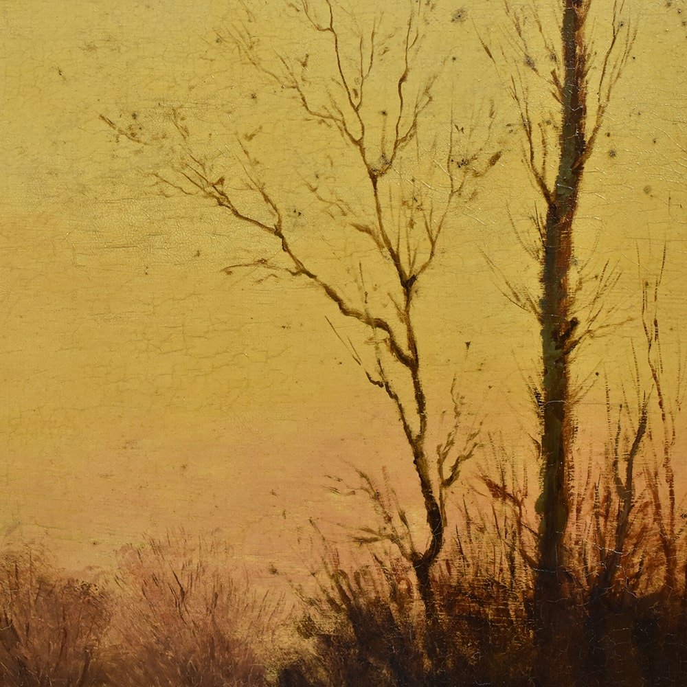 herbstlandschaft mit kahlen Bäumen, gemalt in warmen, leuchtenden Farben. Das alte Gemälde und der Rahmen sind restauriert.