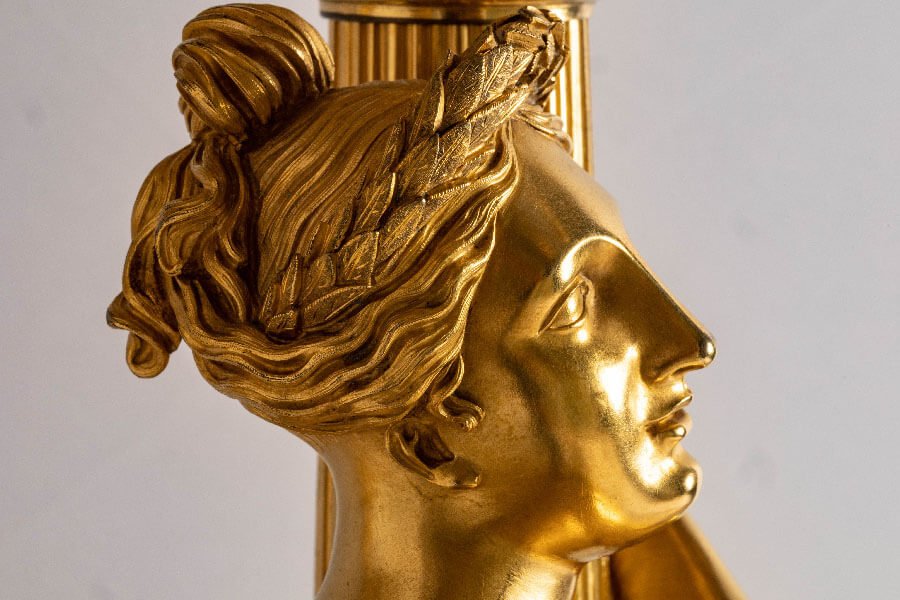 Die dargestellten Musen Die beiden Kandelaber zeigen zwei Musen aus der griechischen Tradition: Erato, die mit den Buchstaben, den Wissenschaften und den Künsten in Verbindung gebracht wird Euterpe, die mit Musik, Gesang und Lyrik in Verbindung gebracht wird In der griechischen Mythologie waren die Musen Göttinnen, die über verschiedene Bereiche der Künste und Wissenschaften herrschten. Sie waren die neun Töchter von Zeus, dem König der Götter, und Mnemosyne, der Göttin der Erinnerung. Apollo, Gott des Lichts, der Musik, der Prophezeiung und der Poesie, war ihr Anführer. Die Verwendung klassischer Musen als Stützfiguren für Kandelaber war ein besonders geschätztes Motiv in der französischen Dekoration des 19. Jahrhunderts, das voll und ganz mit der neoklassizistischen Ästhetik und dem ikonografischen Repertoire der Empire-Zeit übereinstimmte.