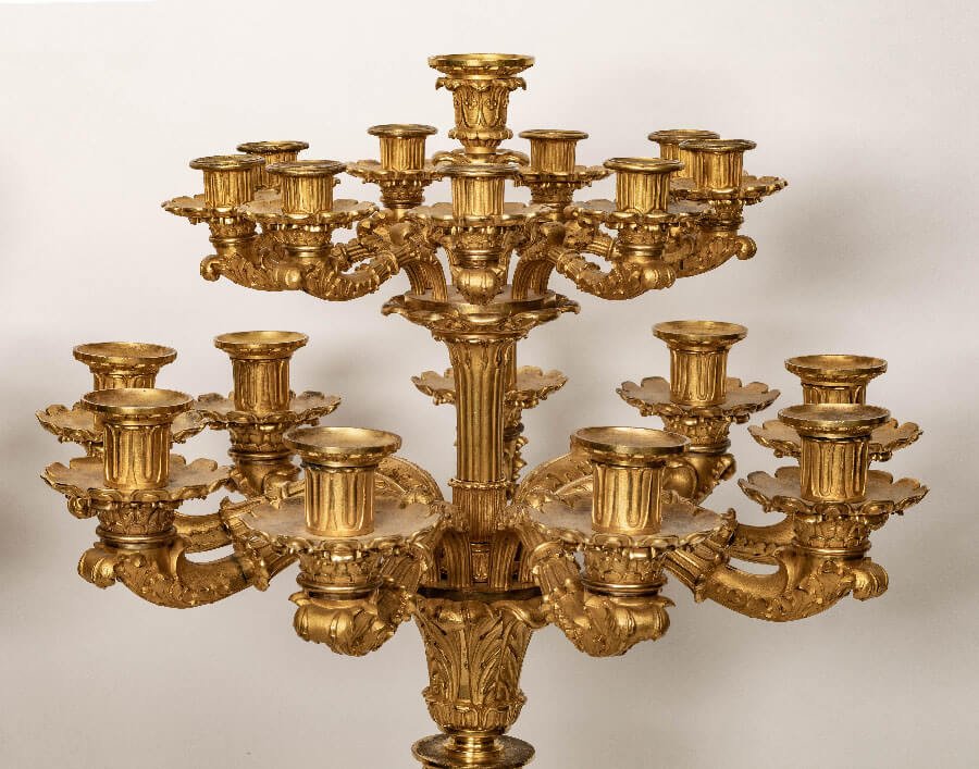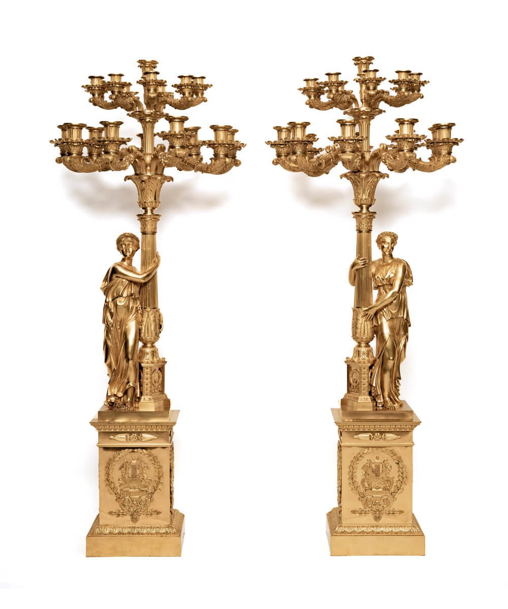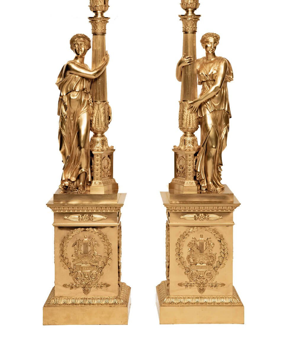 An imposing pair of Empire-period gilt bronze candelabra, featuring figures of Greek Muses. Each candelabrum is fitted with eighteen lights arranged on two tiers, with cast candle arms decorated with acanthus motifs and scrolling forms, and a central urn-shaped element, set on flared, fluted and reeded columns. The structure is supported by two Muses, Euterpe and Erato, standing on plinth bases.