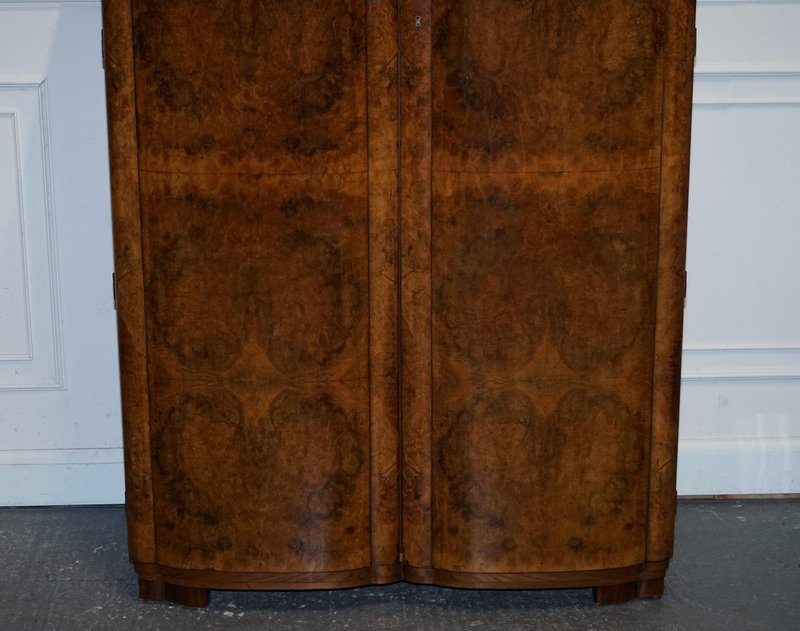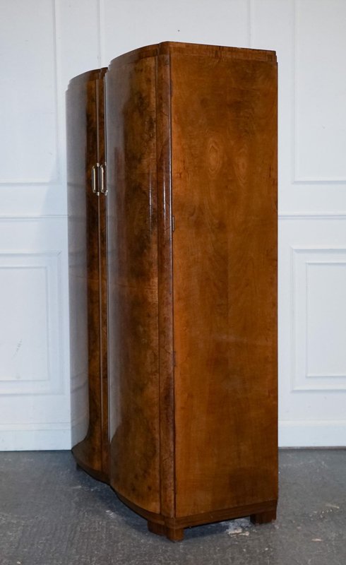A striking circa 1930s English Art Deco wardrobe, crafted in beautiful burr walnut with dramatic swirling grain patterns that give the piece exceptional richness and visual impact. This is a classic example of Art Deco design—sleek, sculptural, and confident—capturing the glamour and sophistication of the period. The two doors feature book-matched burr walnut veneers, creating a stunning mirrored effect that highlights the natural artistry of the timber. Gently curved edges and elegant proportions give the wardrobe a refined, streamlined silhouette true to 1930s craftsmanship. Inside, the wardrobe provides generous hanging and storage space, making it as practical as it is decorative. The warm tones of the walnut, combined with the clean Deco lines, allow this piece to sit beautifully in both period and modern interiors. A timeless and eye-catching Art Deco wardrobe—full of character, craftsmanship, and classic English style.