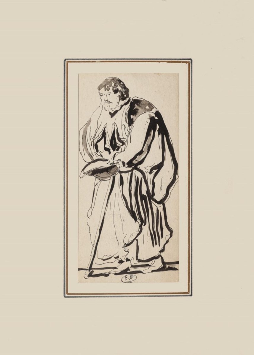 Theatralische Figur ist eine original monogrammierte Zeichnung in Bleistift, Aquarell und in China-Tusche auf Papier, realisiert vom russischen Szenografen Eugène Berman. Bildabmessung: 35 x 25 cm Bildabmessungen: 20 x 10 cm In sehr gutem Zustand. Das Kunstwerk stellt eine theatralische Figur dar. Unten in der Mitte handsigniert ""E.B"". Eugène Berman (Sankt Petersburg, 1899 - Rom, 1972) war ein russischer Maler und Bühnenbildner für Theater und Oper. Sein Werk wurde wegen der Melancholie und der introspektiven Züge als ""Neo-Romantik"" bezeichnet. Berman könnte sich von den Werken Pablo Picassos inspirieren lassen, insbesondere von den Gemälden der Blauen Periode.