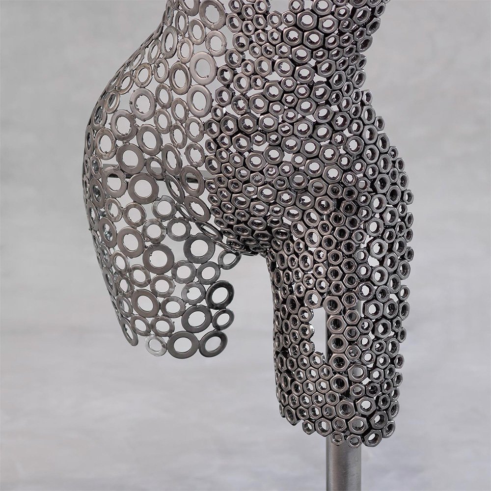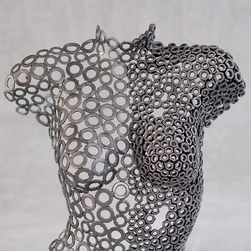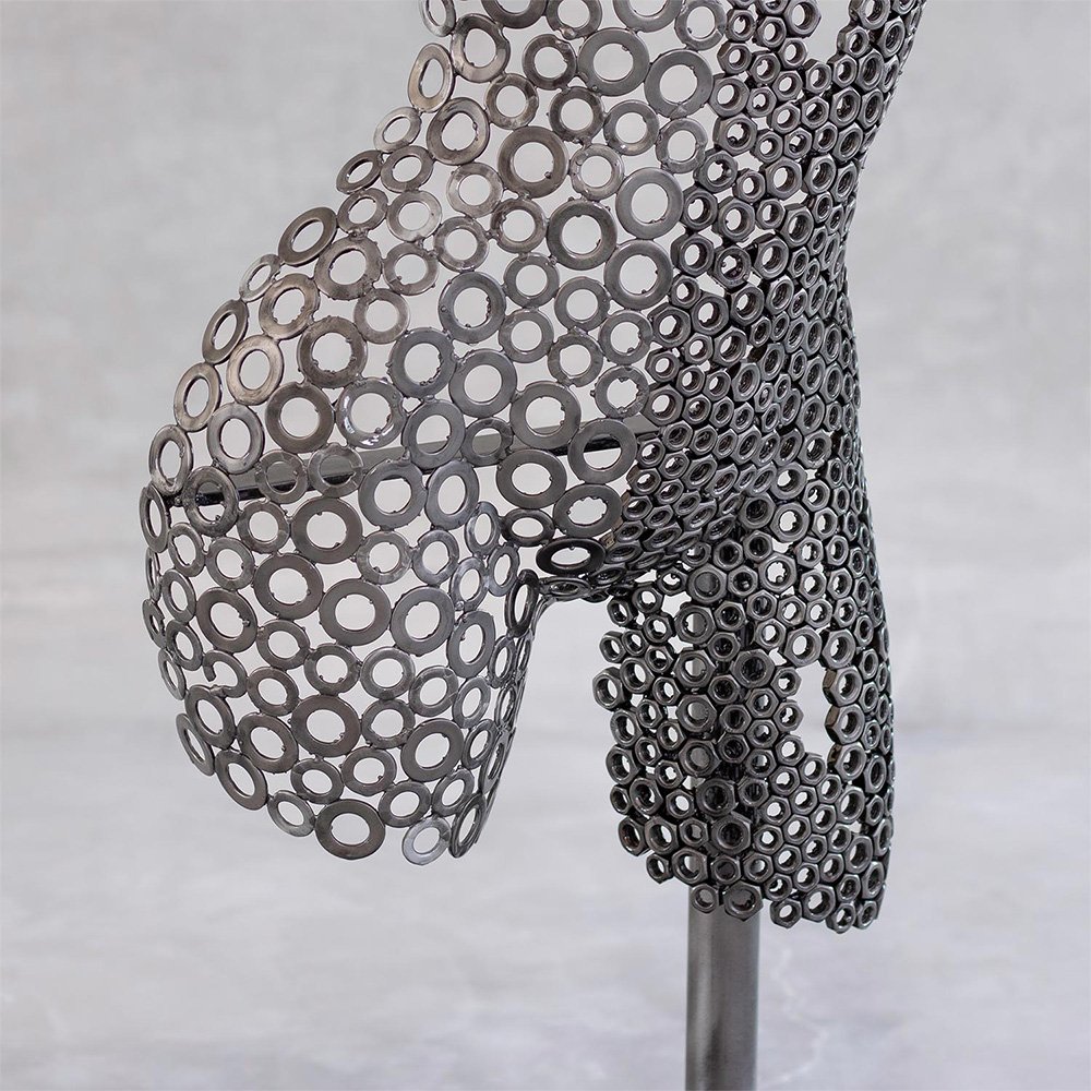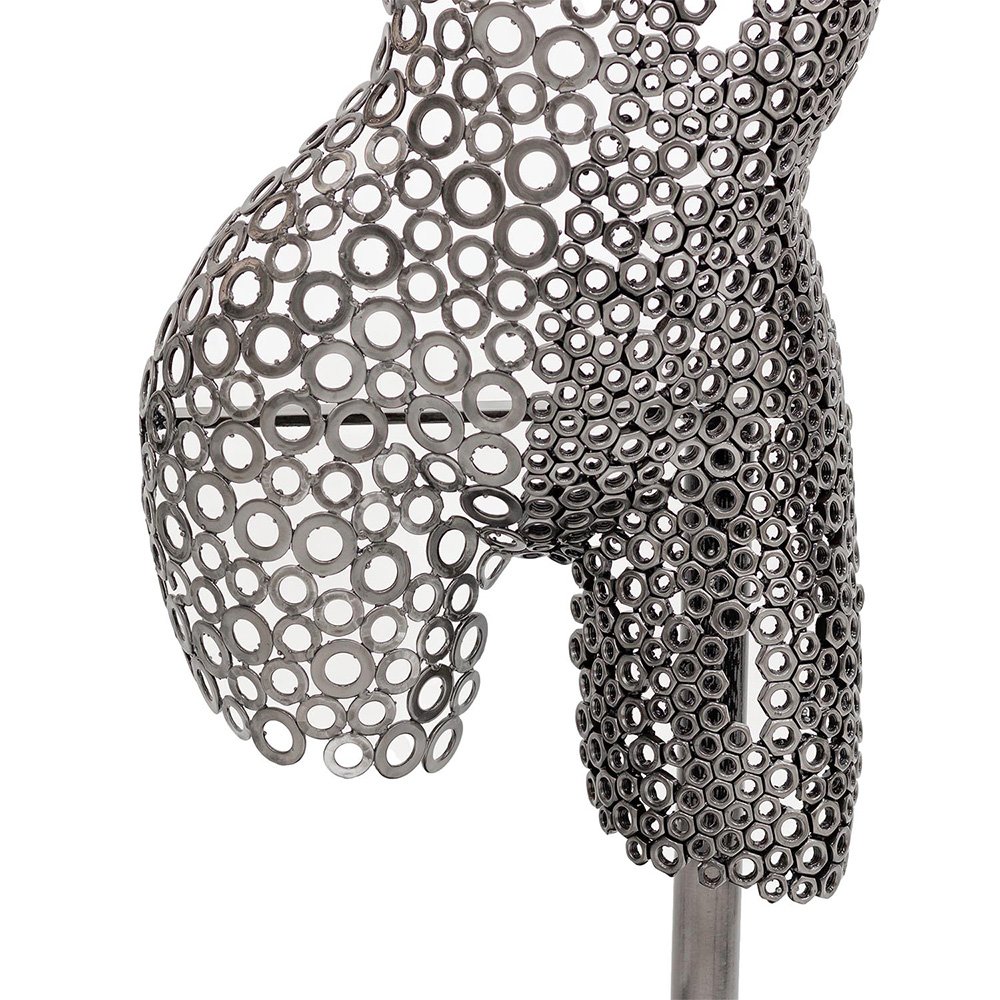 Hera is a handcrafted contemporary iron sculpture that reinterprets the female form through expressive industrial metalwork. Constructed from carefully arranged washers and metal nuts, the piece reveals the curves of a woman’s torso and thighs with remarkable structural precision.