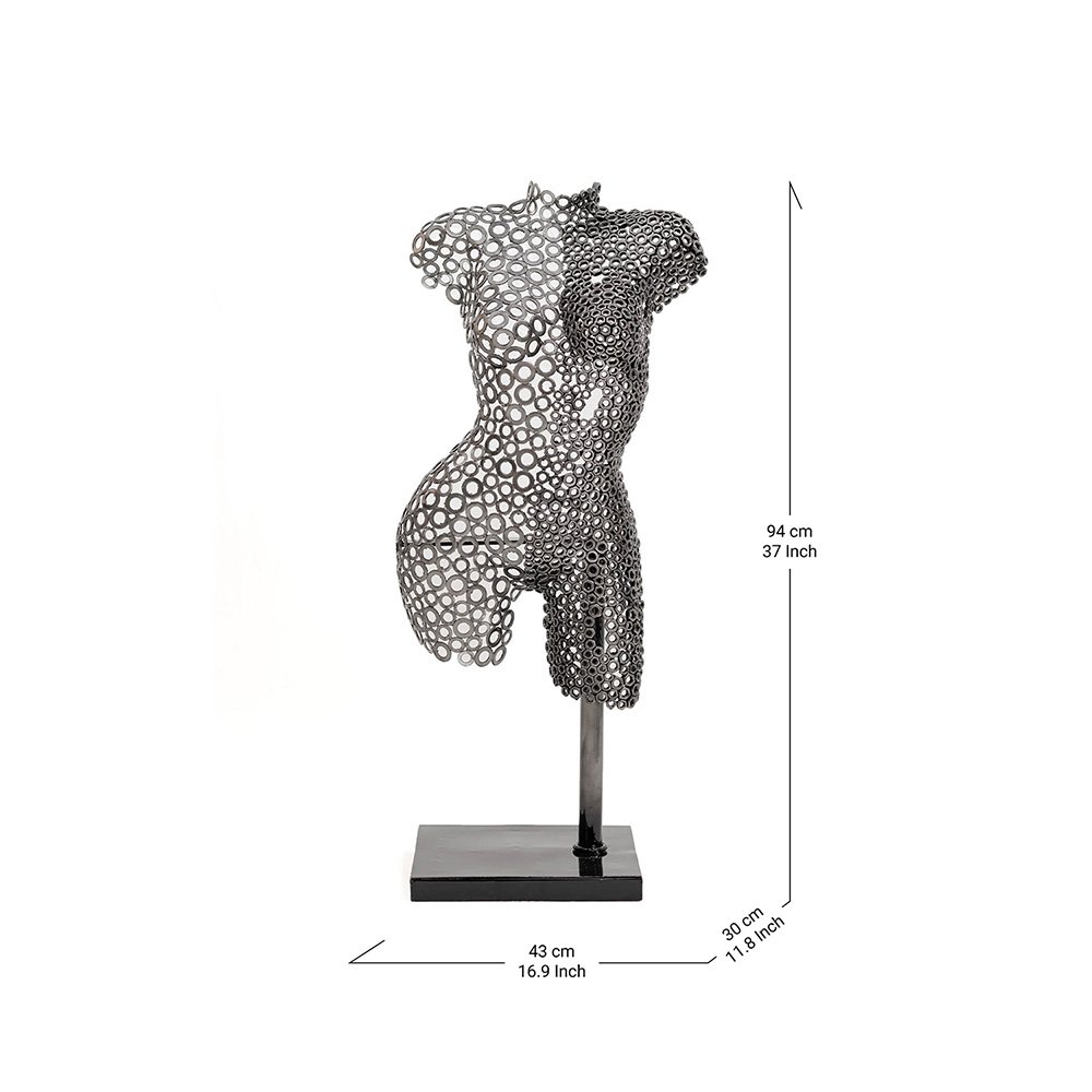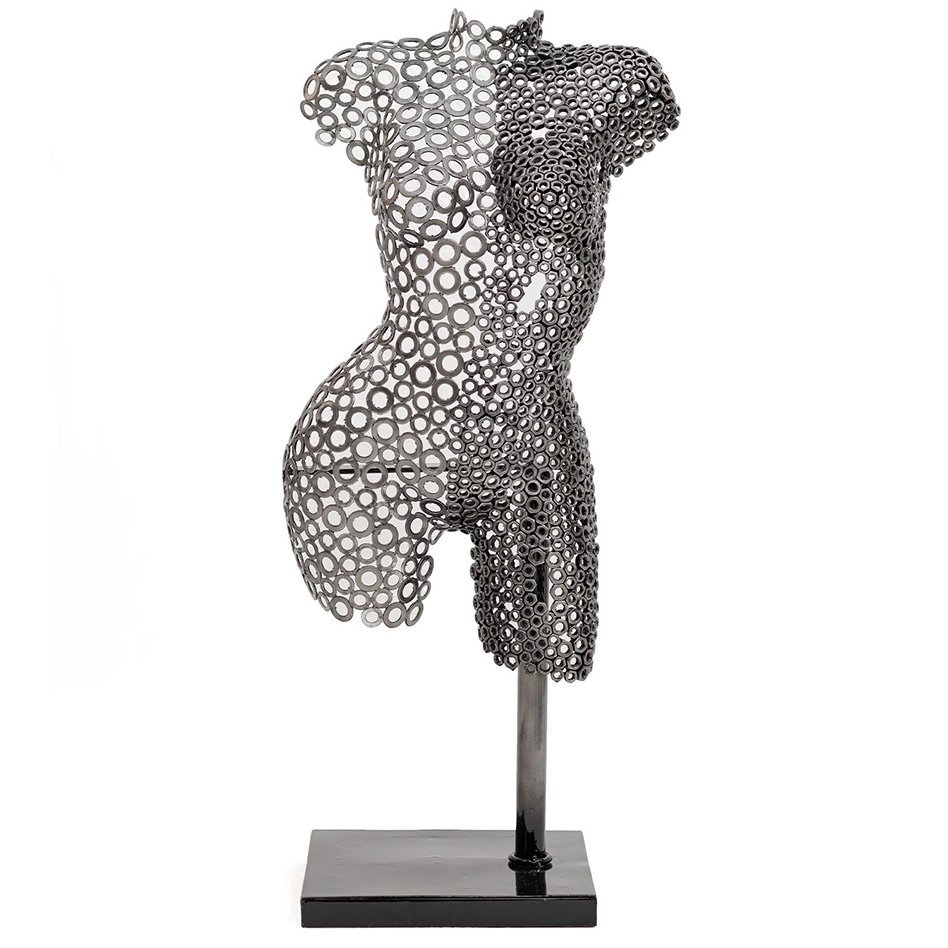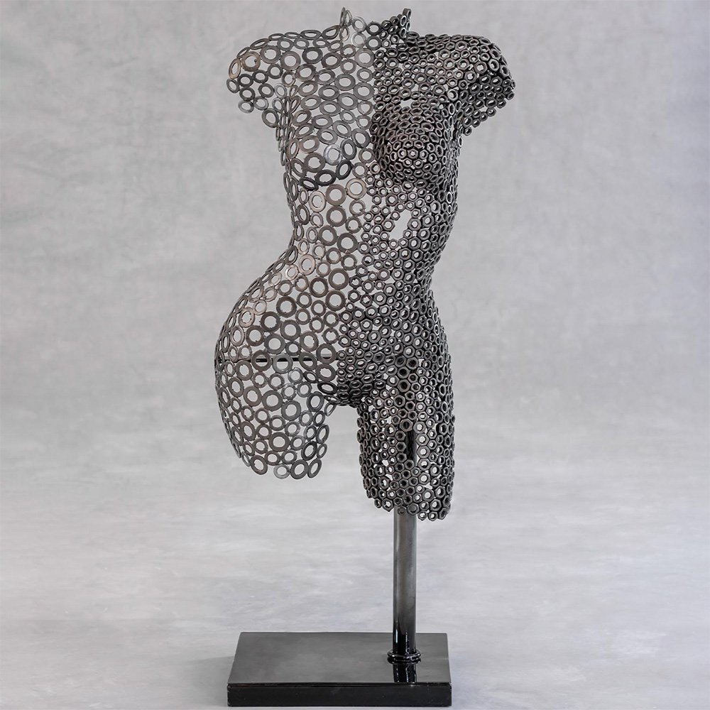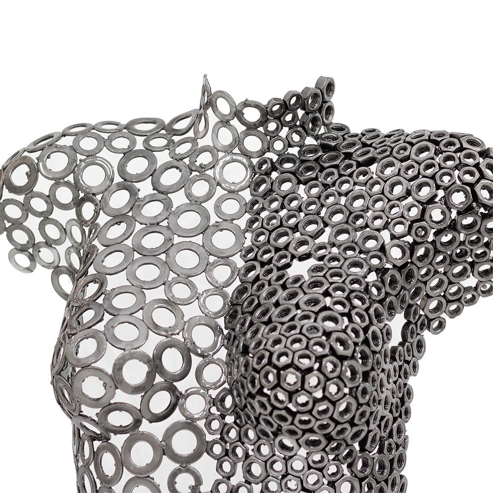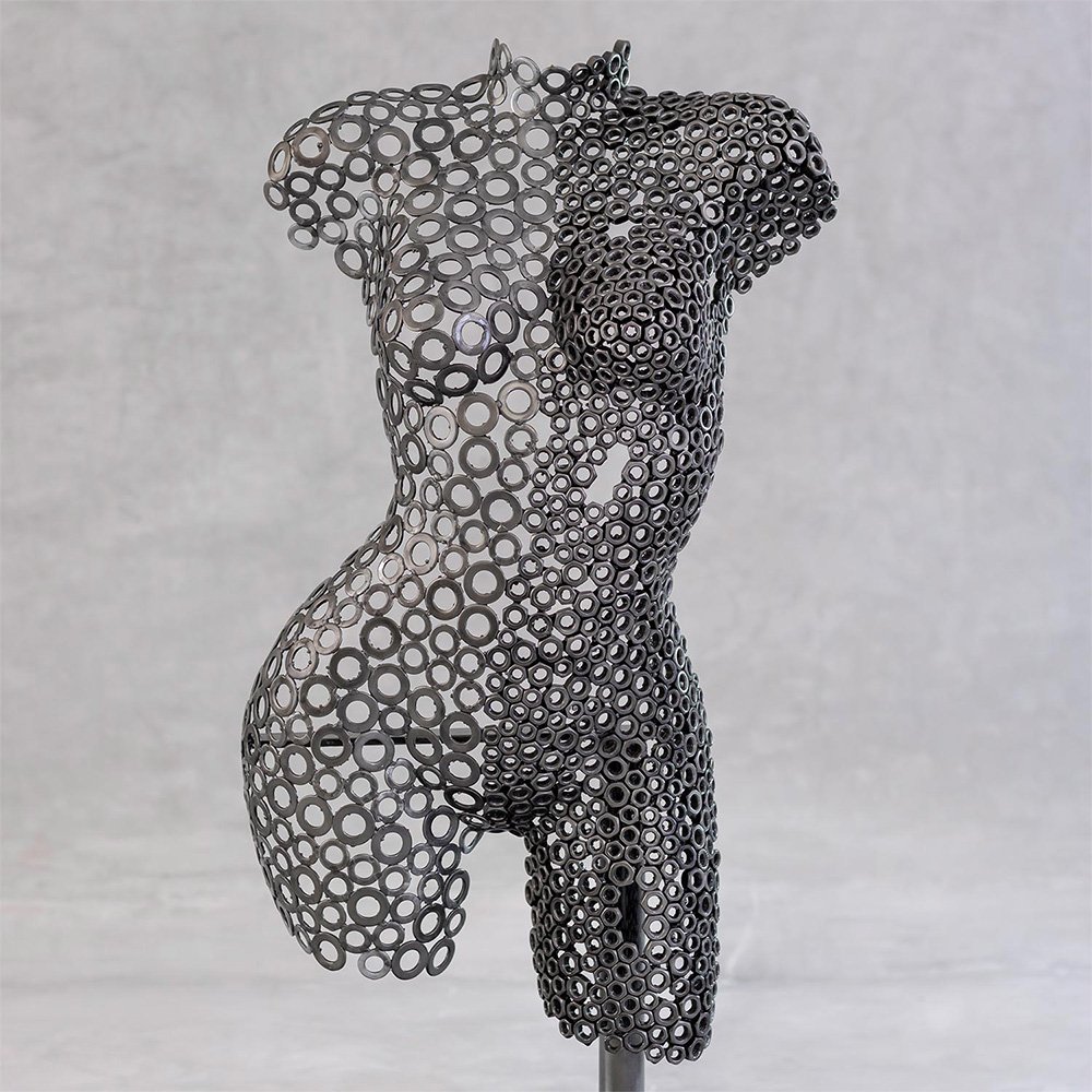 Hera is a handcrafted contemporary iron sculpture that reinterprets the female form through expressive industrial metalwork. Constructed from carefully arranged washers and metal nuts, the piece reveals the curves of a woman’s torso and thighs with remarkable structural precision.