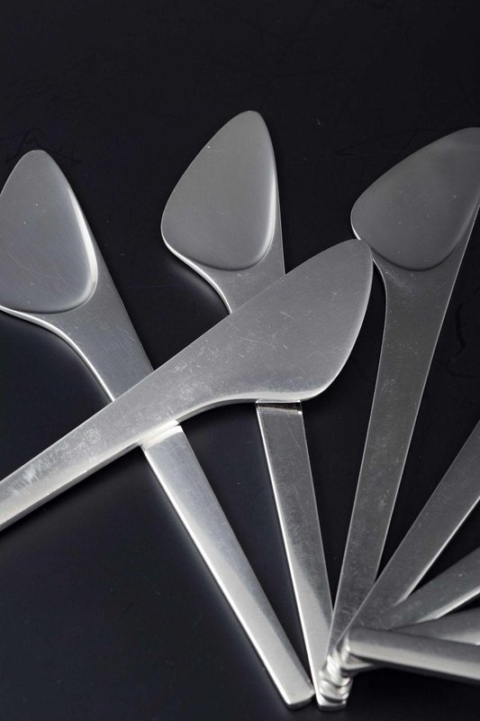 Georg Jensen, Denmark, c. 1957. Set of eight fish knives in the Caravel pattern, design by Henning Koppel. Sleek modernist design with organic leaf-shaped blade. • Manufacturer / origin: Georg Jensen, Denmark • Designer: Henning Koppel (1918-1981) • Material: Sterling silver • Dimensions: L. 15.5 cm • Signature / mark: Marked Georg Jensen Sterling Denmark • Period: c. 1957 • Condition: Very good condition with minor wear consistent with age A classic piece of modernist silverware and a sought-after collector’s item from Georg Jensen. Henning Koppel (1918-1981) is regarded as one of Denmark’s leading modernist designers. He collaborated with Georg Jensen from the late 1940s, creating a series of iconic silver and cutlery designs, including the Caravel pattern introduced in 1957, celebrated for its simplicity and sculptural elegance.