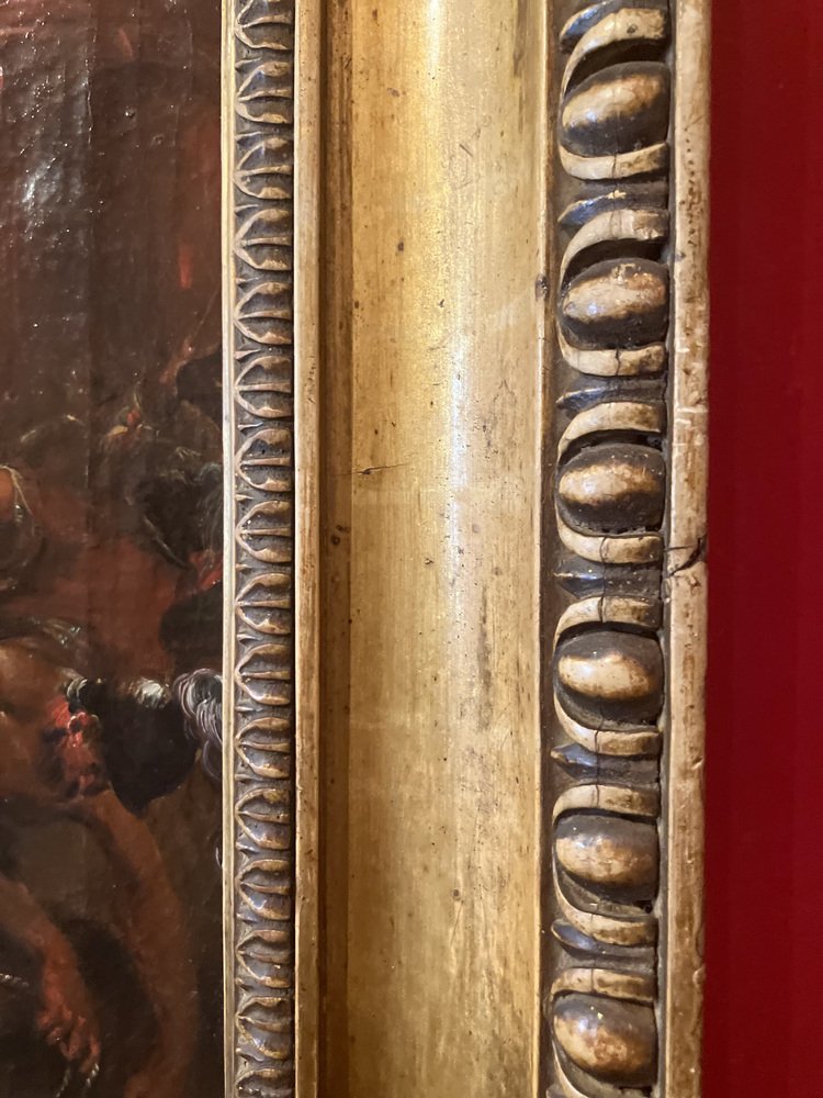 The painting is in excellent condition for its age, featuring the original canvas with an interesting and stable craquelé in some areas. The surface is uniform, with bright and saturated colors. It is housed in an elegant carved and gilded wooden frame, decorated with stylized acanthus leaves and deep egg and dart oval carvings.