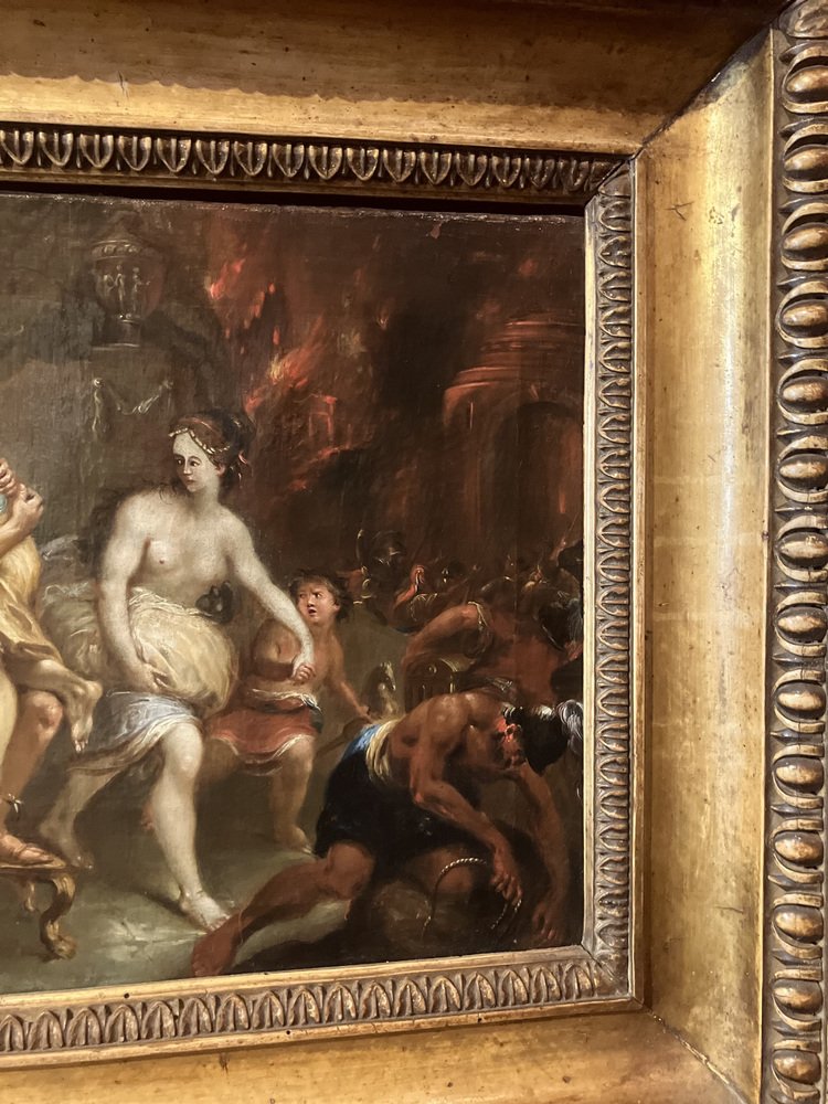 This oil painting on canvas, created by an artist from the 17th Century Flemish School, depicts one of the most significant scenes from Greco-Roman mythology: Aeneas saving his family from the devastating flames of Troy. The artwork captures an extraordinary dramatic moment from Virgil's "Aeneid,"illustrating the heroic and determined escape of Aeneas, carrying his elderly father Anchises on his back, along with his wife Creusa and son Ascanio, from the now-burning city of Troy.