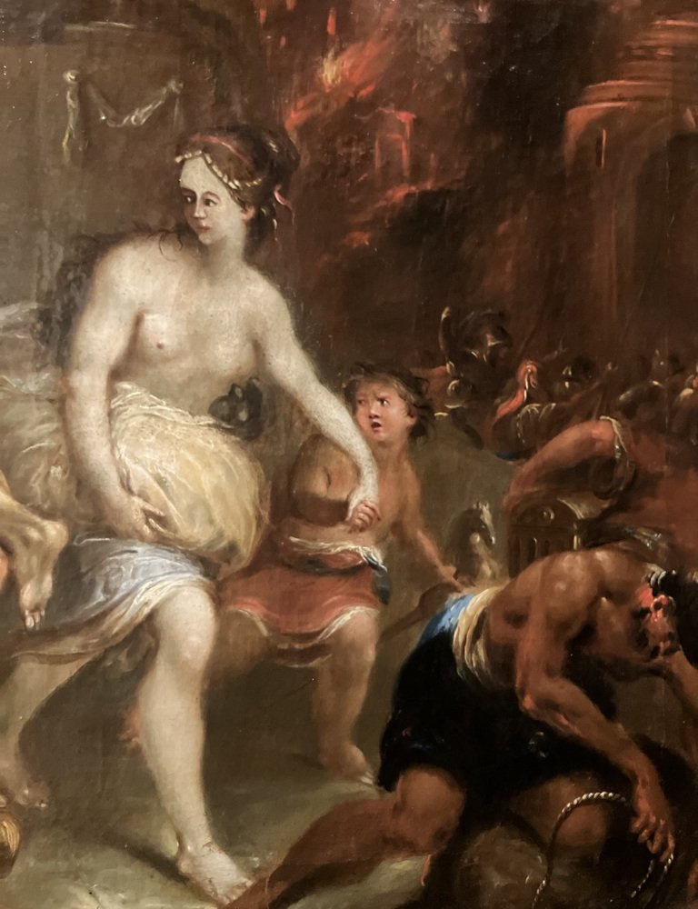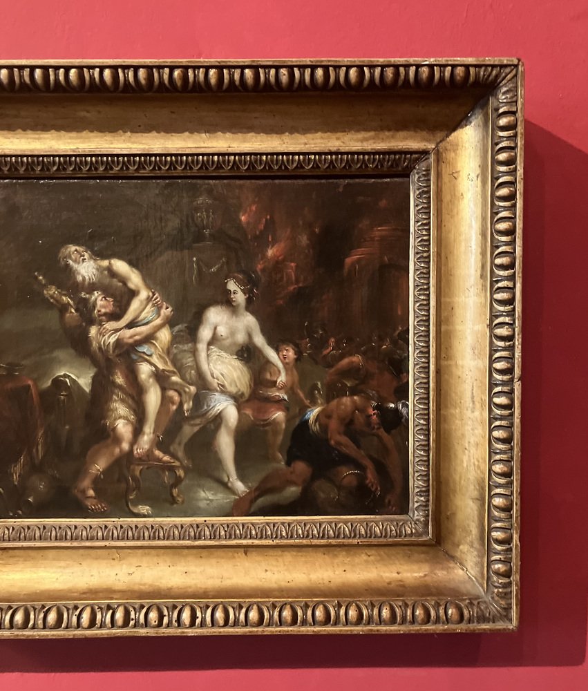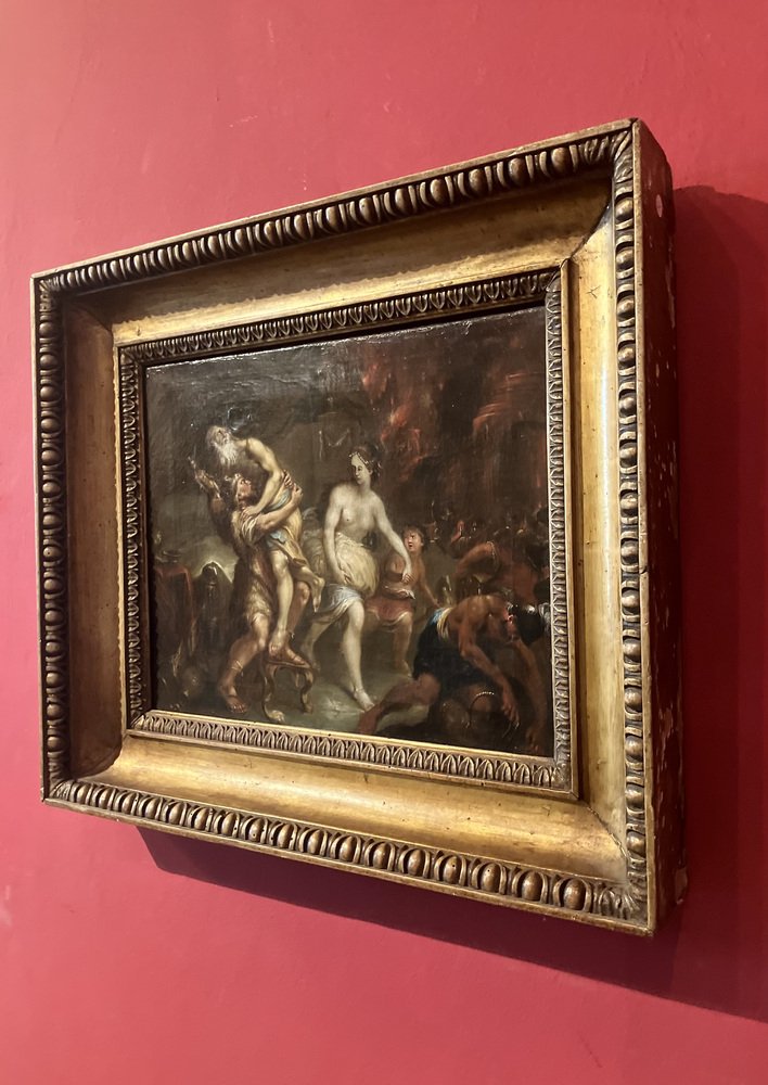 Dieses Ölgemälde auf Leinwand, das von einem Künstler der flämischen Schule des 17. Jahrhunderts geschaffen wurde, stellt eine der bedeutendsten Szenen der griechisch-römischen Mythologie dar: Aeneas rettet seine Familie aus den verheerenden Flammen von Troja. Das Kunstwerk fängt einen außerordentlich dramatischen Moment aus Virgils "Aeneis" ein, der die heldenhafte und entschlossene Flucht des Aeneas zeigt, der seinen alten Vater Anchises zusammen mit seiner Frau Creusa und seinem Sohn Ascanio aus der brennenden Stadt Troja auf seinem Rücken trägt.