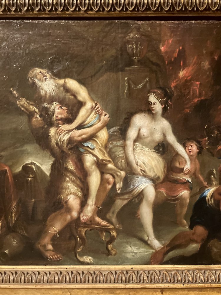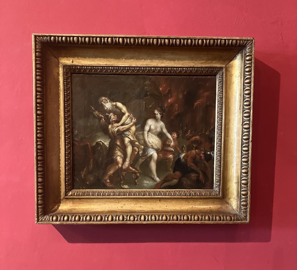 The mastery of chiaroscuro, the layered yet intense brushstrokes, and the use of contrasts and juxtapositions highlight the anguish and determination of the protagonists. The movements, skin tones, and garments, accentuated by the flickering fire, draw us into a pivotal moment for the characters. The other figures populating the majestic architecture seem doomed to be consumed by the destructive flames.