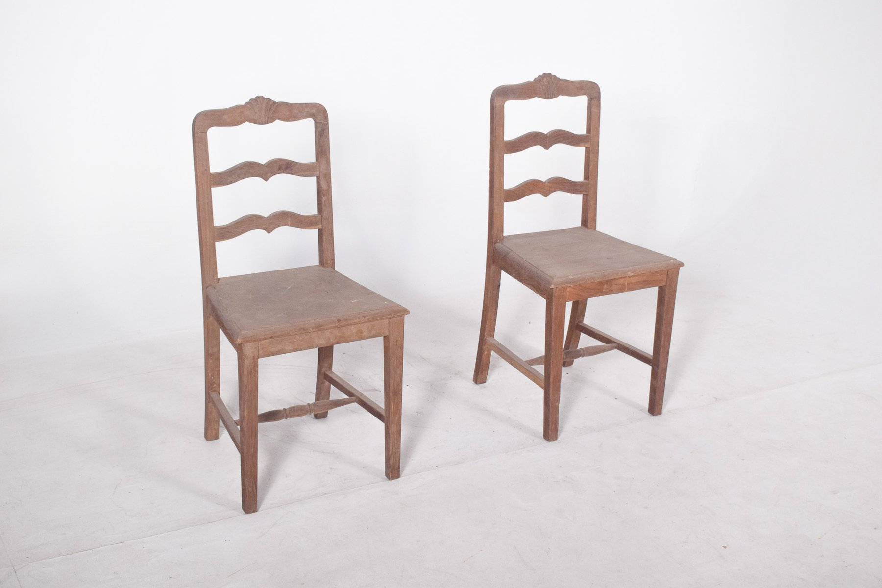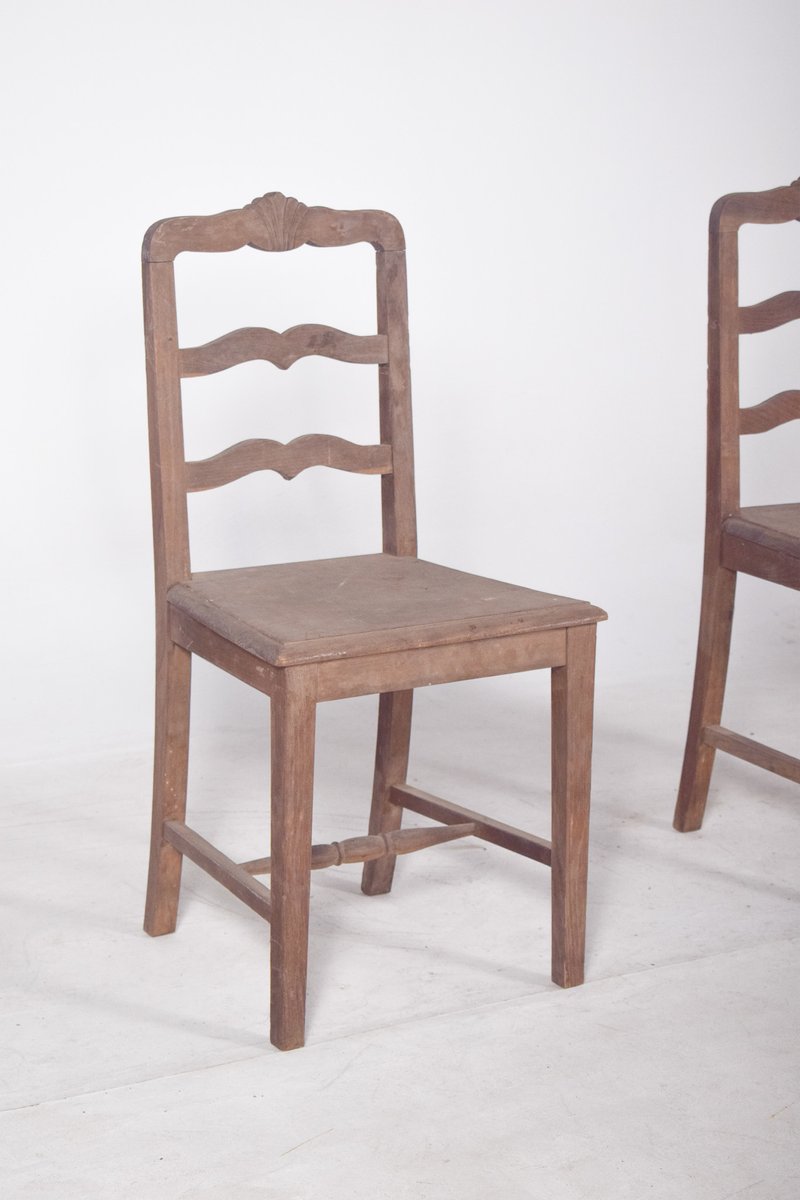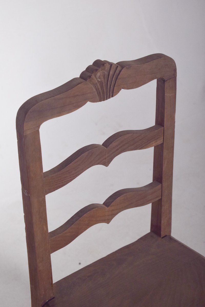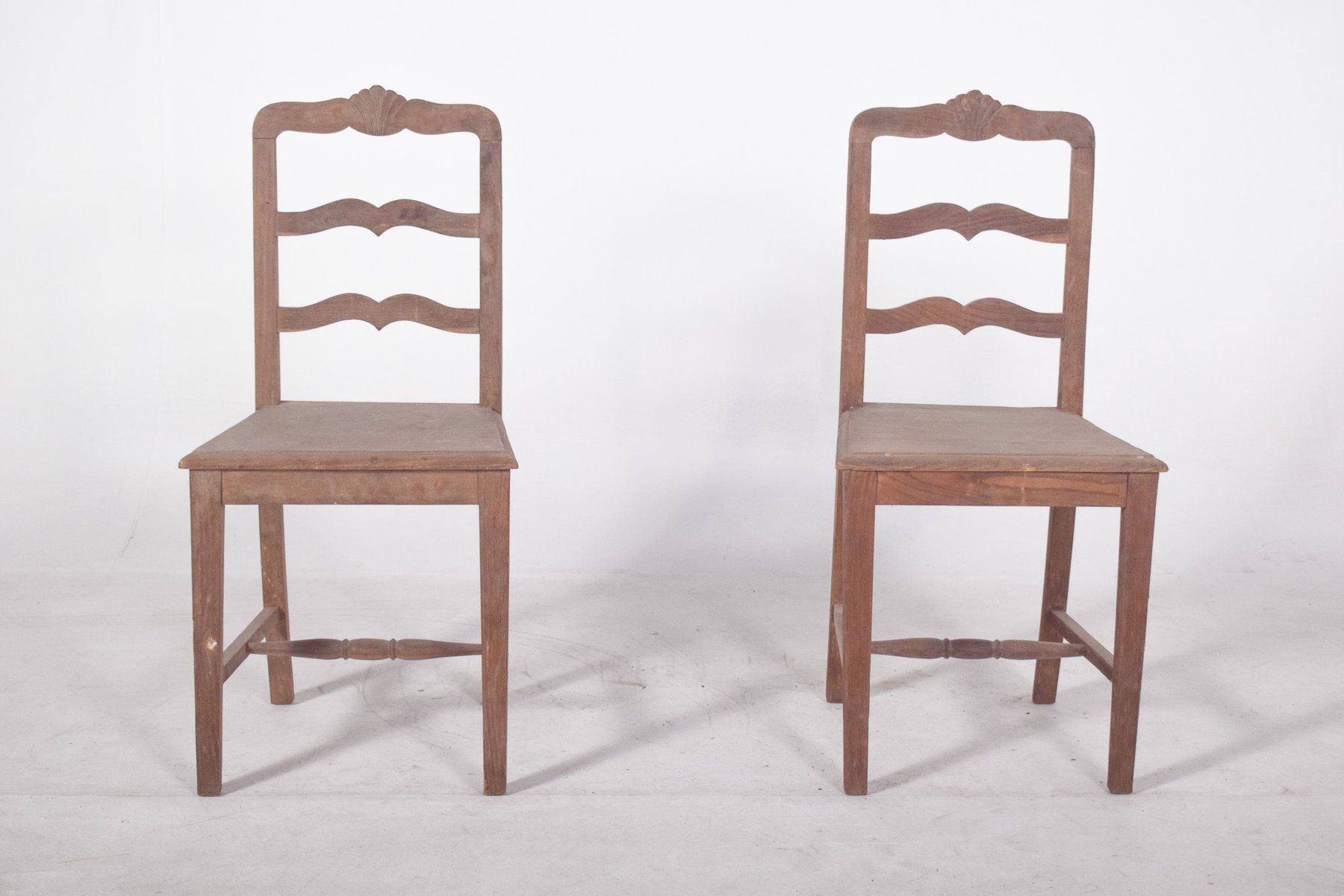 Pair of flowered chairs. Made of solid wood with a traditional design, possibly of rural origin or in the Brazilian colonial style, with a back made of three curved horizontal slats, the top one decorated with a discreet shell-shaped centre notch. The general lines are simple and robust, aimed at everyday functionality, with a flat wooden seat and a structure reinforced by side and front sleepers. The back legs are slightly arched for greater stability, while the front legs remain straight.