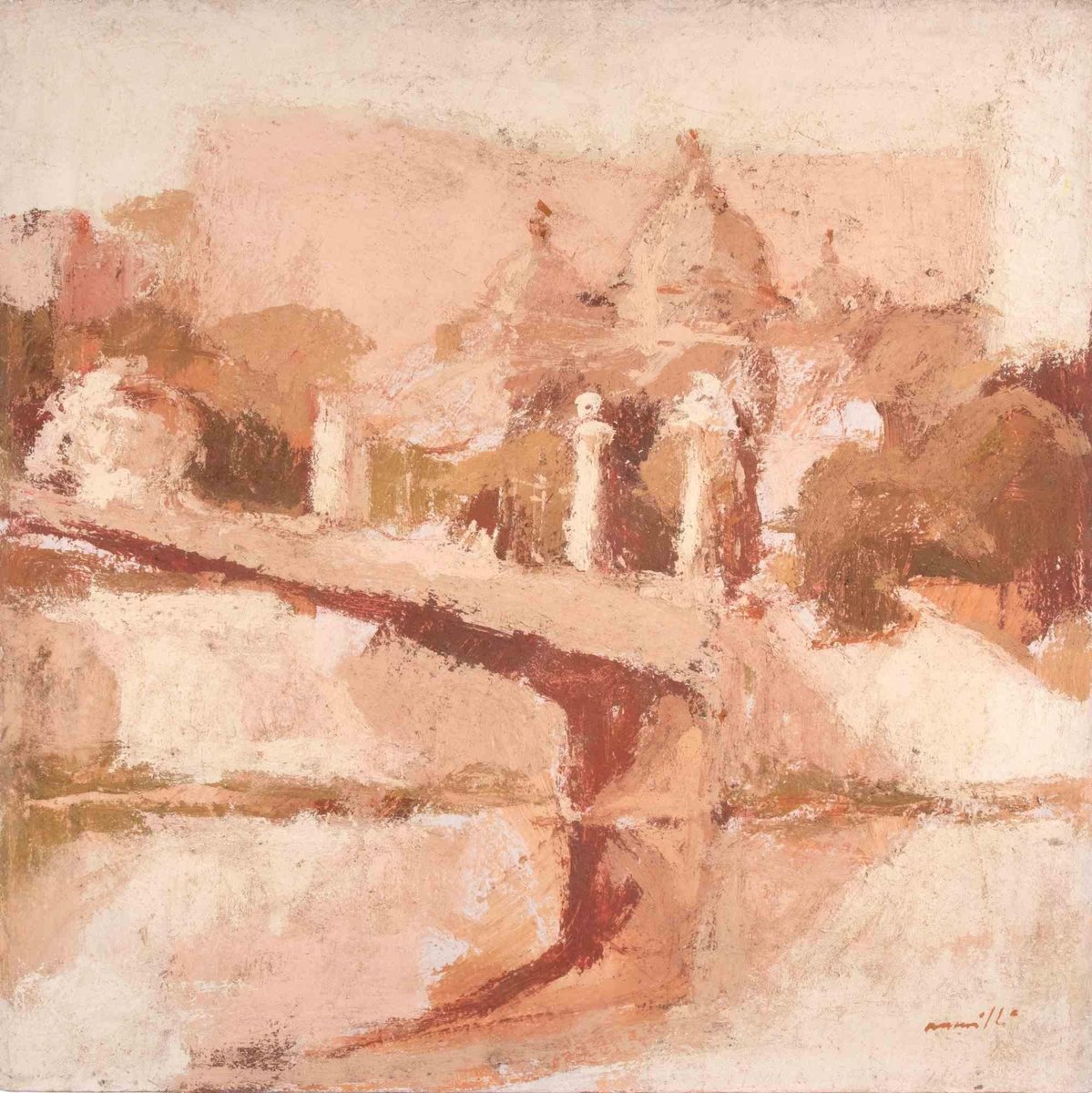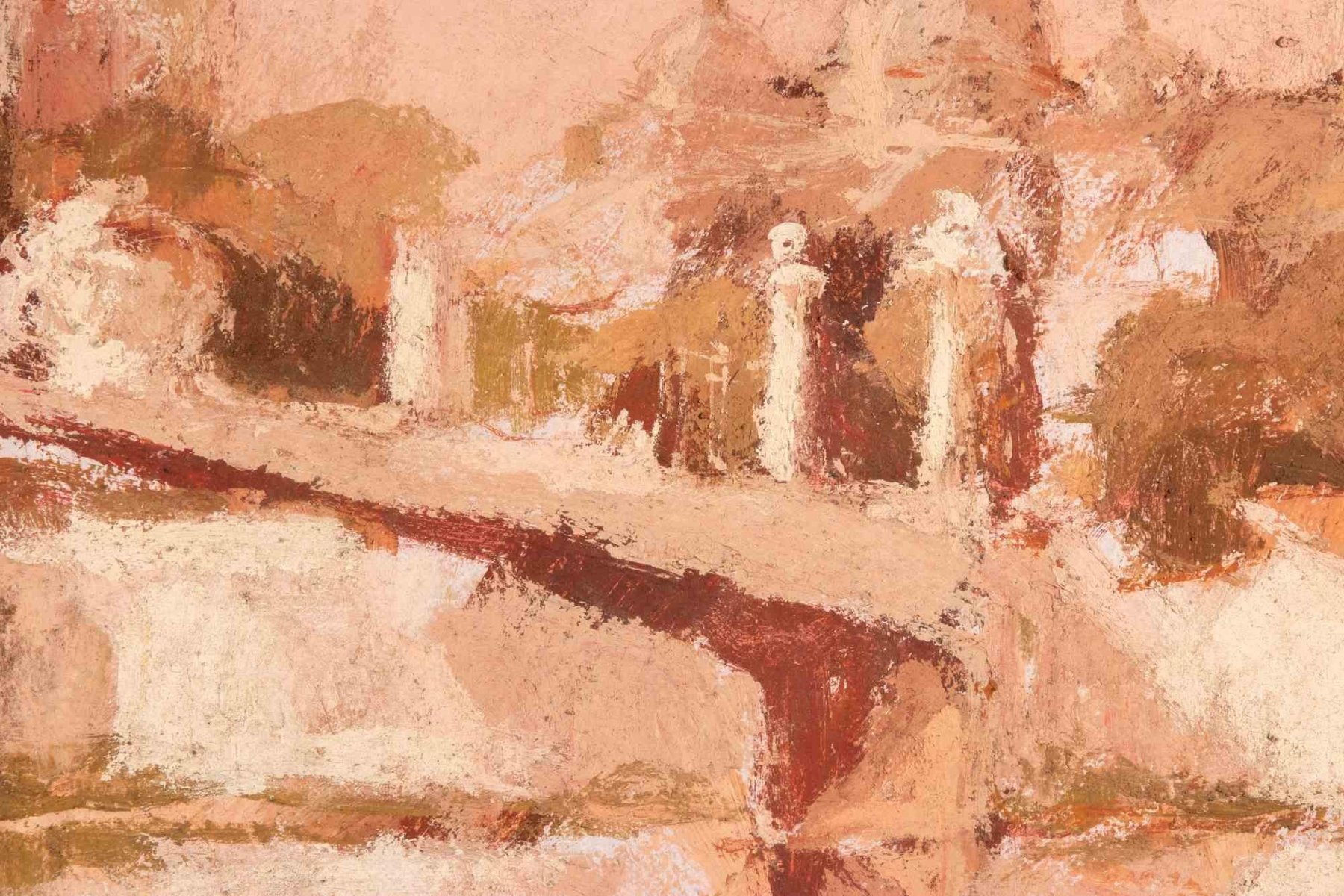 Oil on canvas realized by Franco Marzilli (1934-2010) in 1970s. Hand signed lower right. Very good condition. Franco Marzilli was born in Rome in 1934. He received his first artistic training by attending the Preparatory School for Ornamental Arts in Rome, continuing a personal pictorial research inspired by the typical atmospheres of the artists of the Roman School. He began exhibiting in 1962 in various Italian galleries and, between the end of the 1960s and the beginning of the 1970s, he was invited to present his work in New York, London and Paris, where he lived for a short period. Back in Italy, he expanded his study of sculpture applied to both bronze and ceramics. Through the use of colors obtained from the skilful manual dosage of earths and oils spread on the canvas with soft brushstrokes, Marzilli renews classical themes by restoring the typical dimensions of urban views, especially Roman ones, of dancers at rest, of fruit compositions and of landscapes of the Sabine countryside. Among the many exhibitions in private galleries and public spaces, noteworthy are the solo shows at the College of Arts, Humanities and Social Sciences of Cardiff University in 1973 and at the Sala de Exposiciones of the City of Buenos Aires in 1997.
