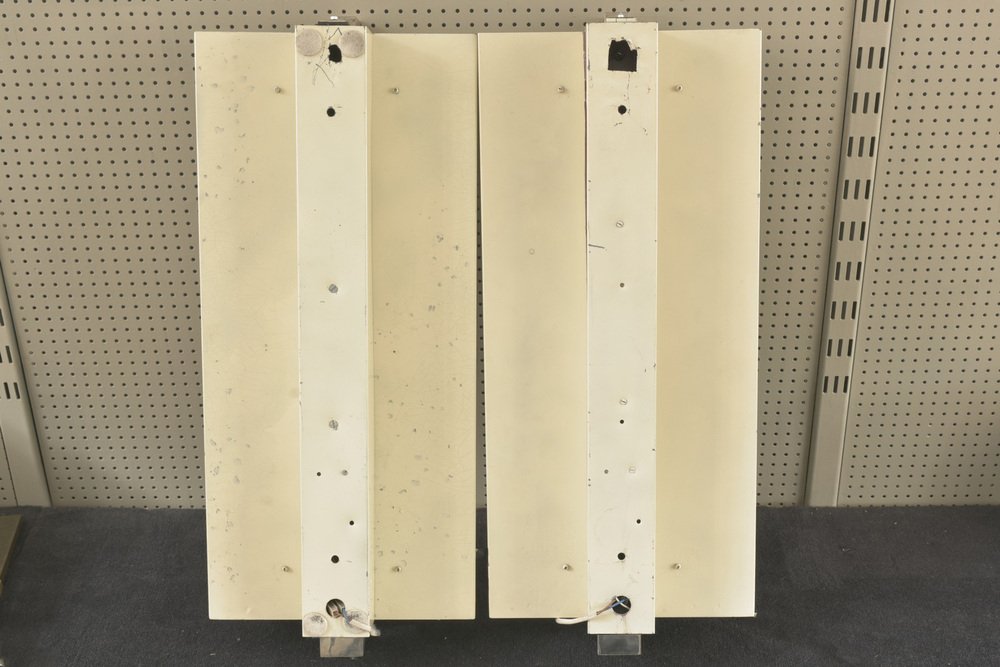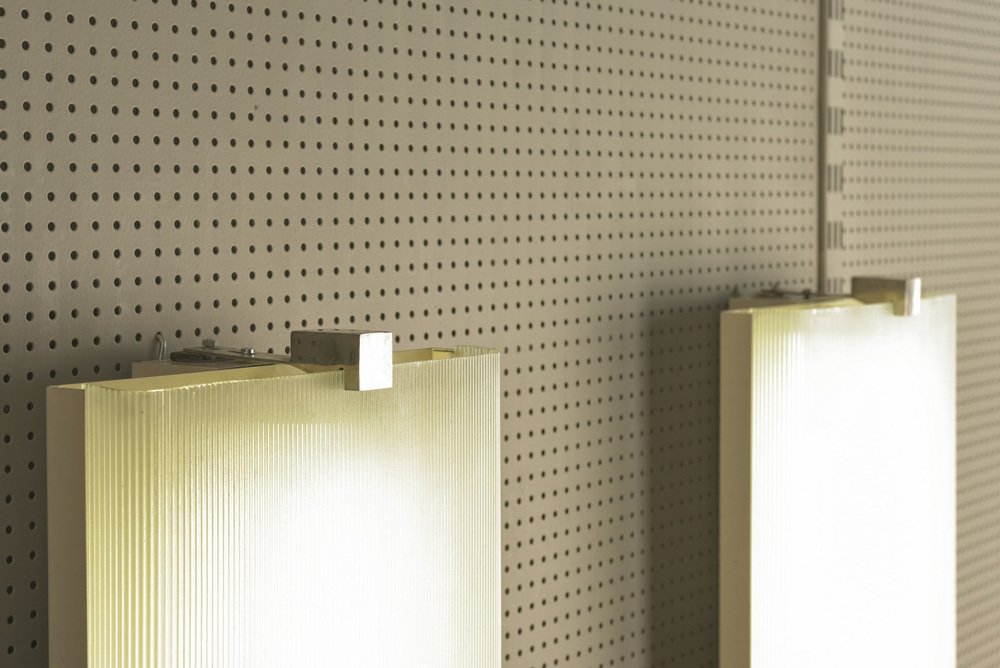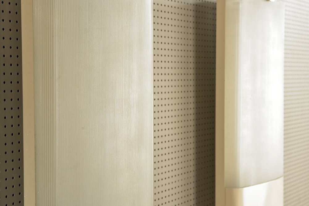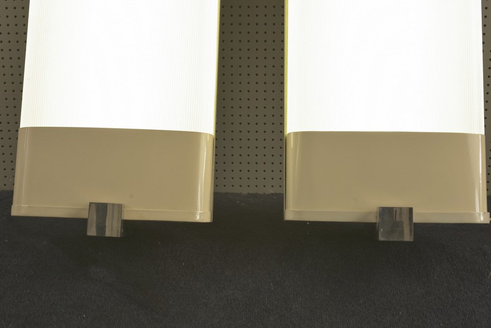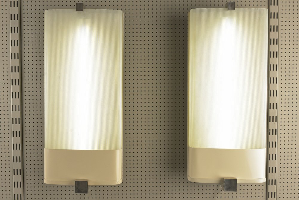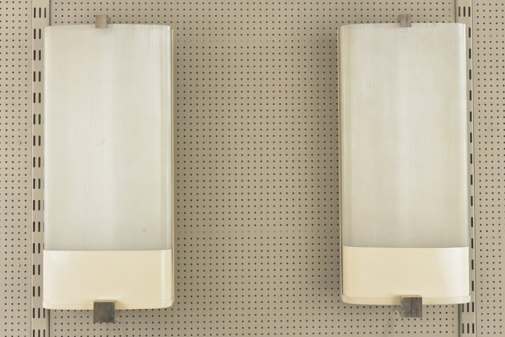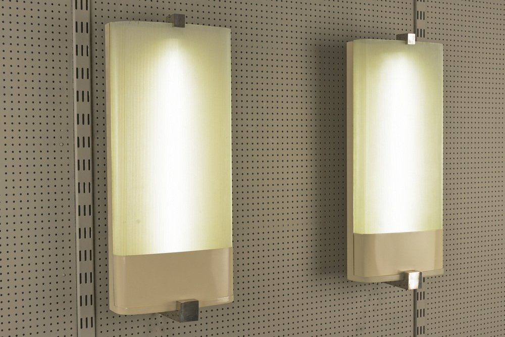 Paar Wandlampen Designer: Factory Design Jahr: um 1940 Hersteller: unbekannt Land: Frankreich Maße: H 66 cm B 30 cm T 15 cm Material: Lackiertes Stahlblech, gewölbtes, geripptes Glas, vernickelte Zierteile, jeweils mit einer Leuchtstoffröhre Zustand: guter Originalzustand Besondere Bemerkungen: wenige Gebrauchsspuren. Das Paar großer Wandleuchten aus Frankreich aus den 1940er Jahren ist kühl und klar in seiner Aussage, klassisch und streng in seiner Gestaltung.
