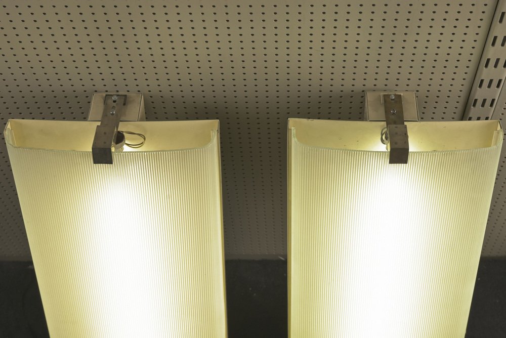 Pair of Wall Lamps Designer: Factory Design Year: around 1940 Manufacturer: unknown Country: France Measurements: H 66 cm W 30 cm D 15 cm Material: Painted sheet steel, curved, ribbed glass, nickel-plated decorative parts, each with a fluorescent tube Condition: good original condition Special Remarks: few traces of wear. The pair of large wall lights from France from the 1940s are cool and clear in their statement, classic and strict in their design.