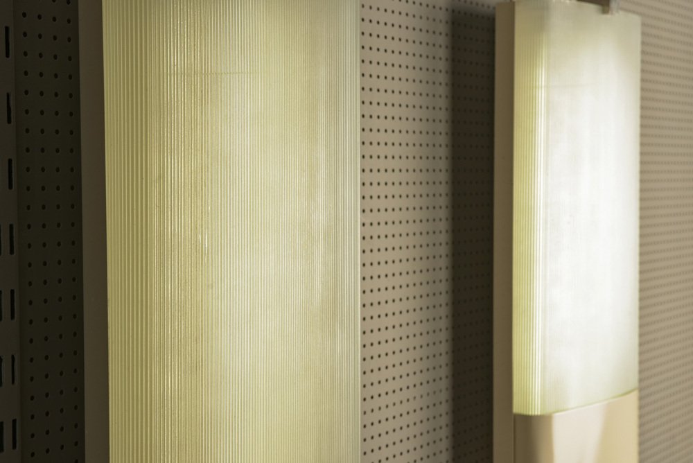 Lackiertes Stahlblech, gewölbtes, geripptes Glas, vernickelte Zierteile, je eine Leuchtstoffröhre, die größten Applikationen aus Frankreich.