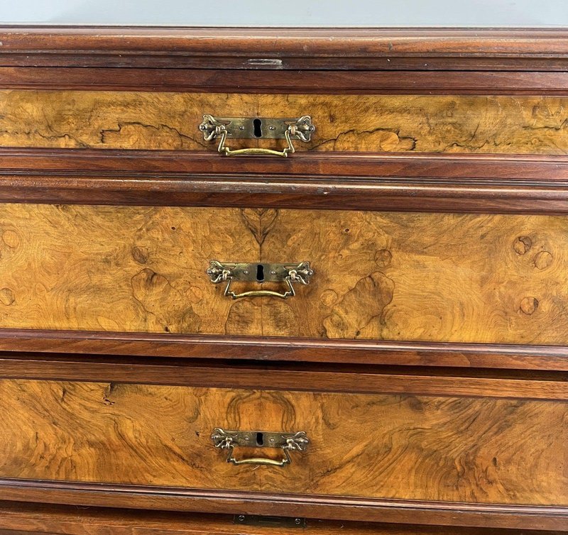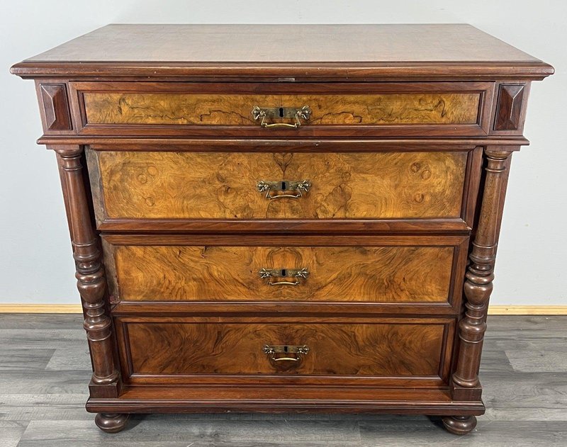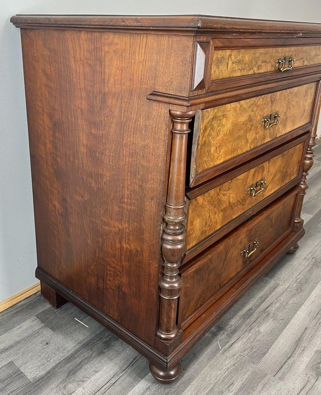 This chest features stunning burr-patterned drawer fronts complemented by deep, warm wood tones across the frame. Decorative turned columns on each side enhance its French character, while traditional brass handles finish the look with authenticity. The piece stands on classic bun feet, giving it a solid and balanced silhouette.
