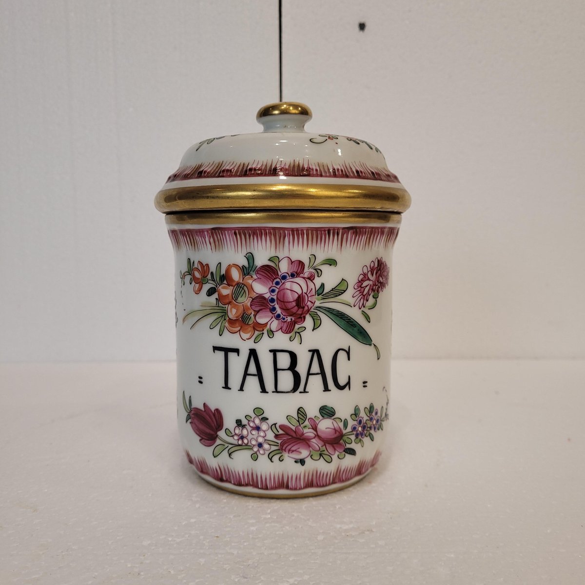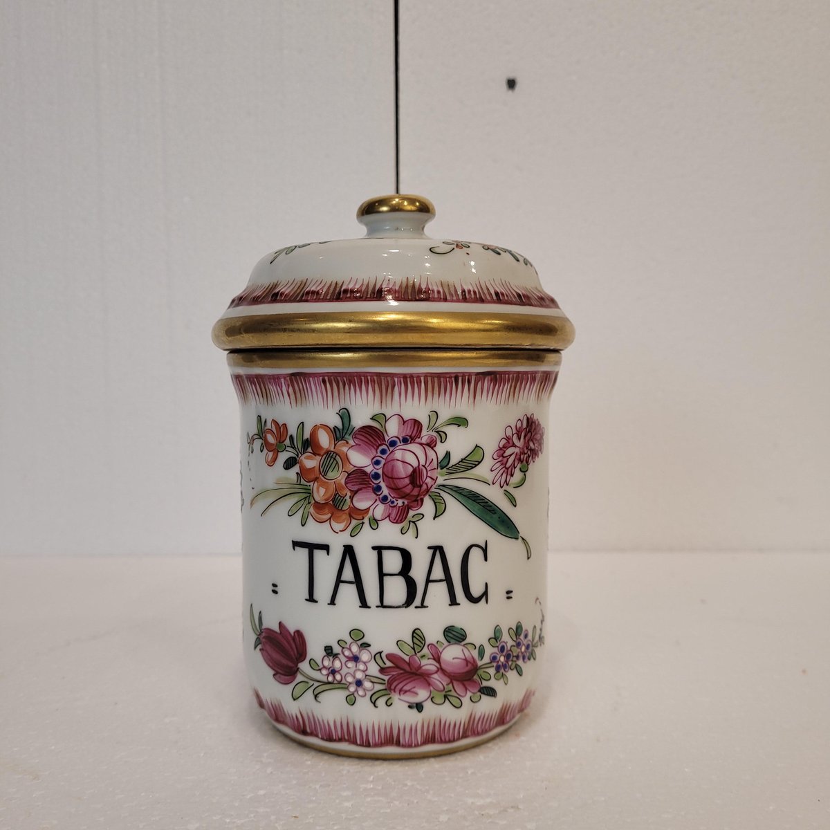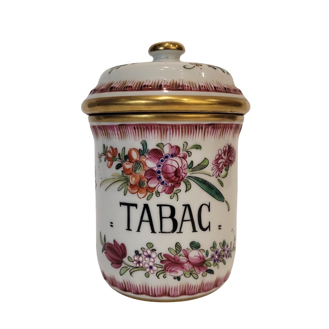 This unusual hand-painted porcelain tobacco jar from the late 19th century, originating in France. The white porcelain surface is decorated with floral motifs in green, pink, and orange. It also features gold details on the lid handle, the lid rim, and the body of the jar. The word "Tabac" is written in black in the center.