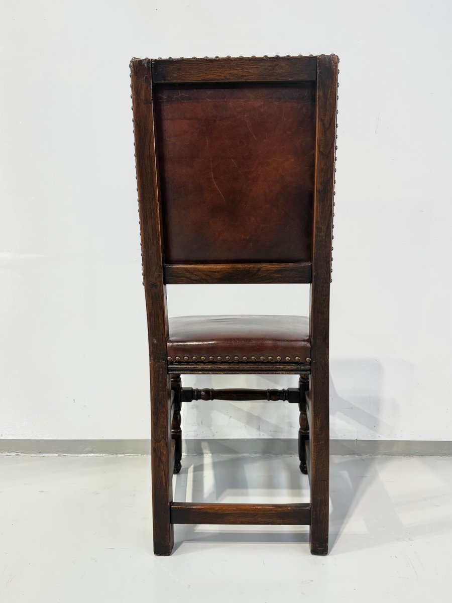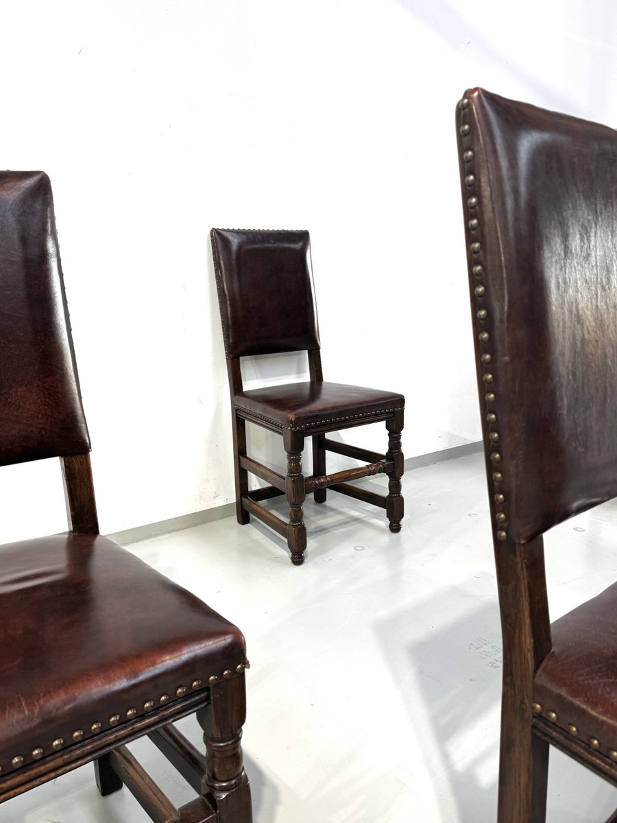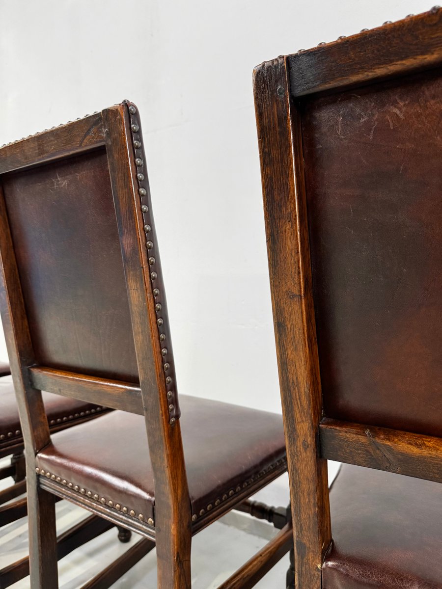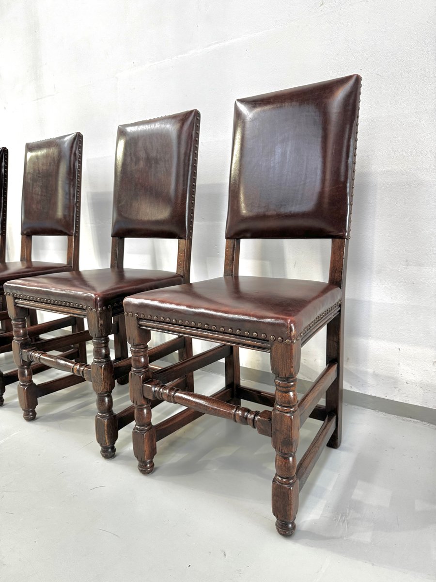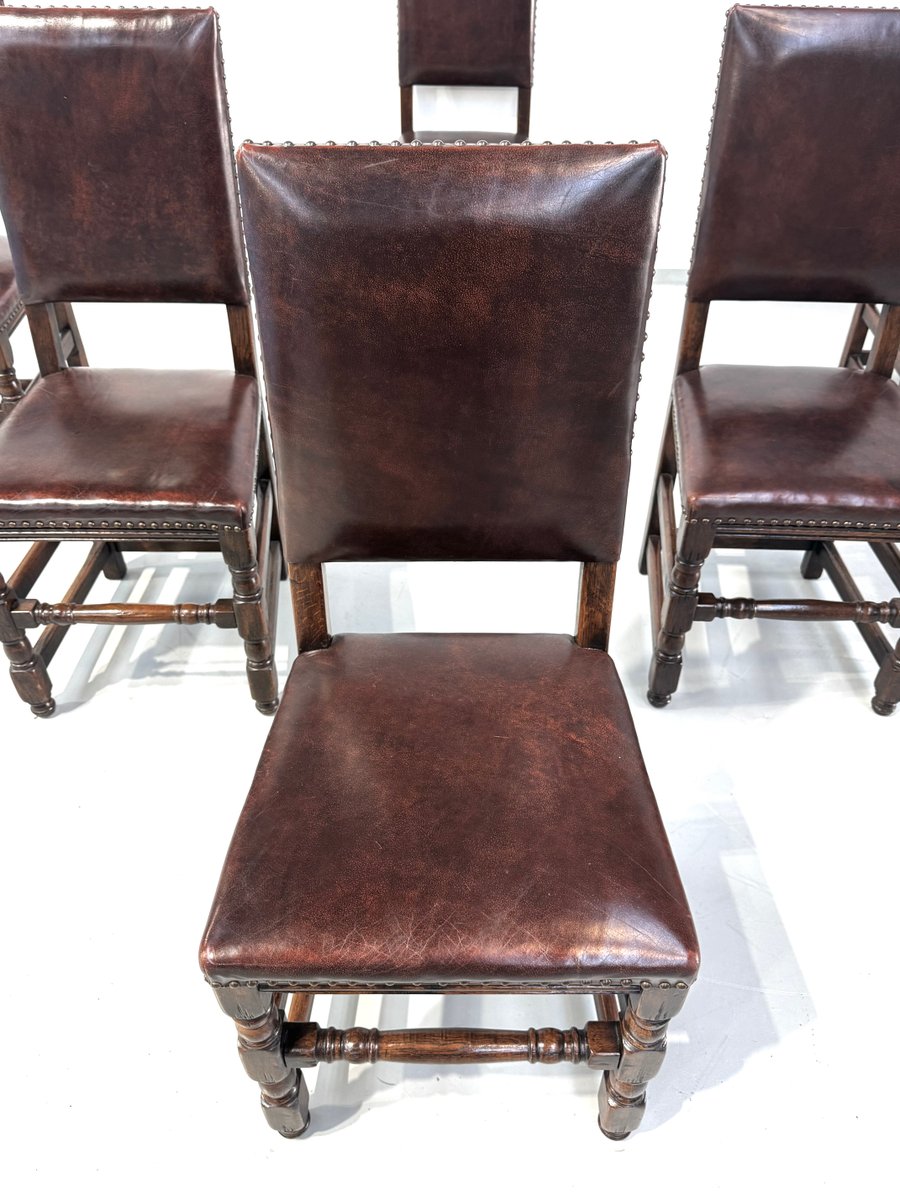 Französische Vintage Castle Stühle aus Braunem Leder & Eiche, 1960er, 6 . Set