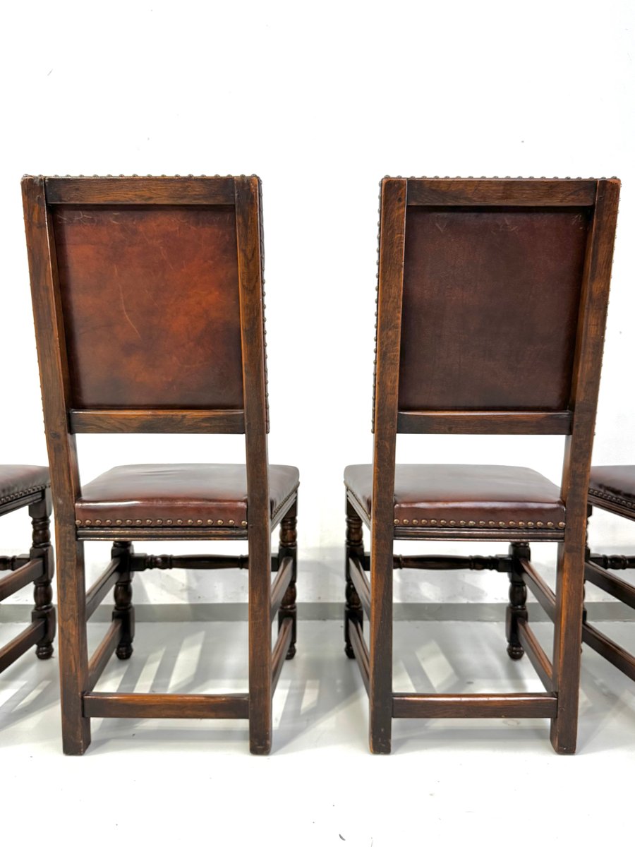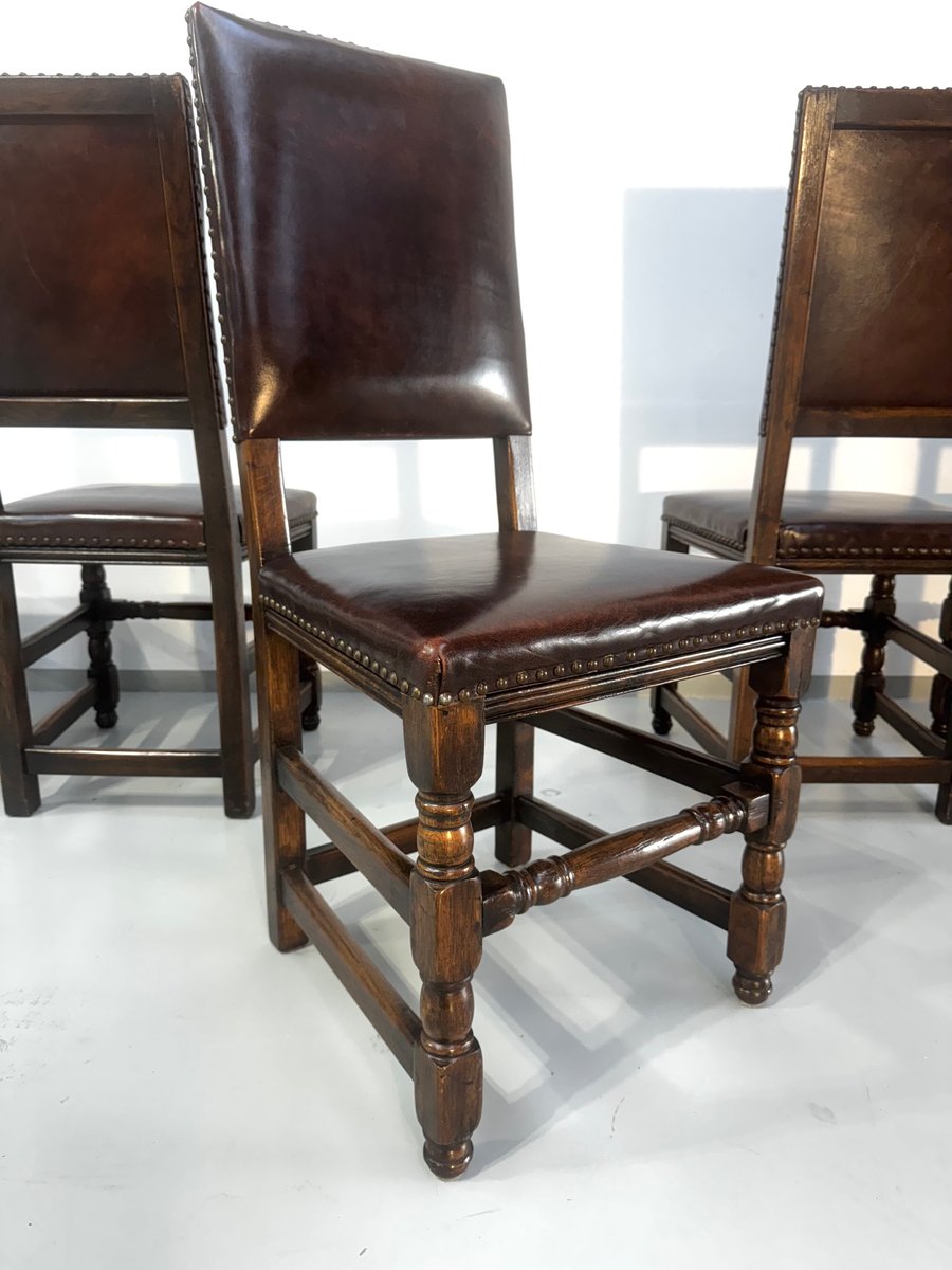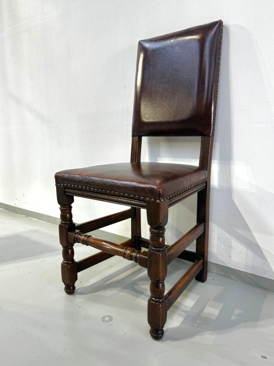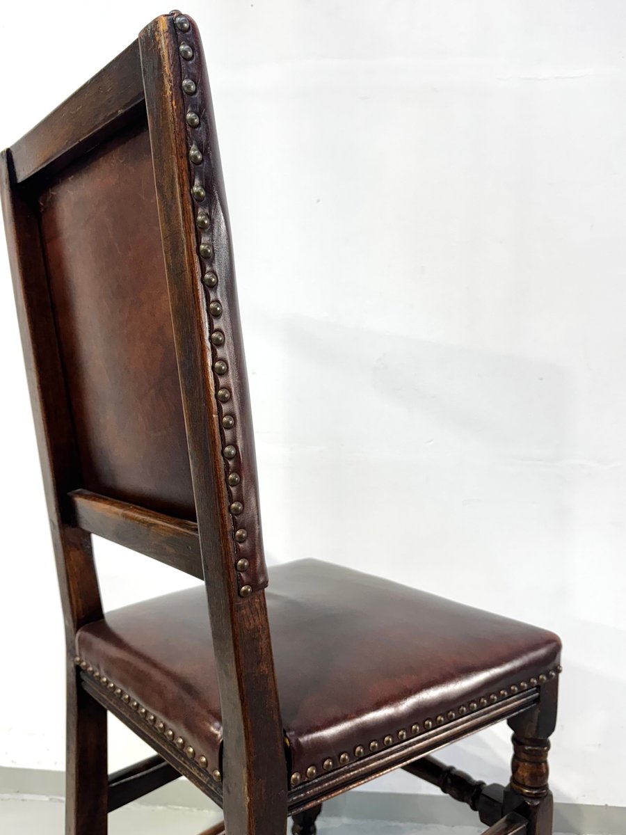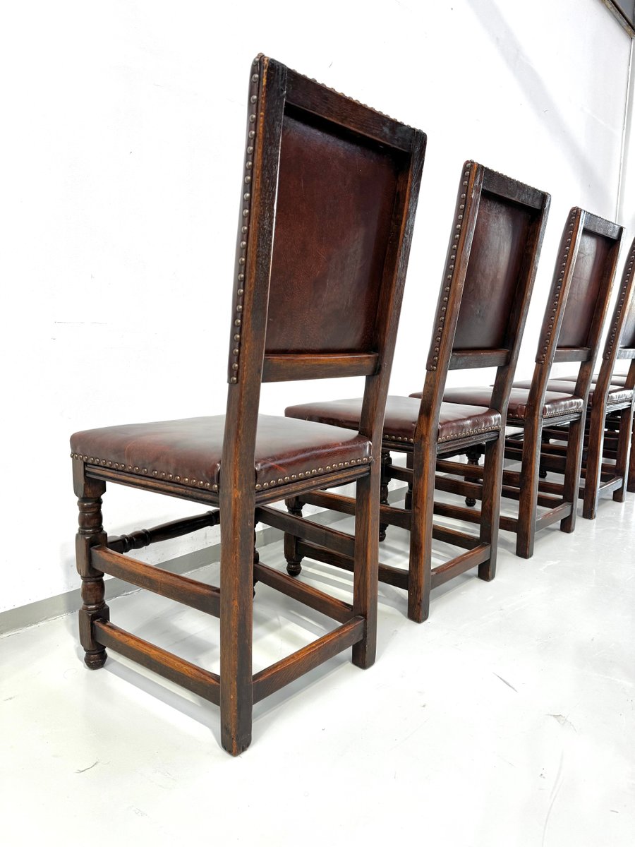 Französische Vintage Castle Stühle aus Braunem Leder & Eiche, 1960er, 6 . Set