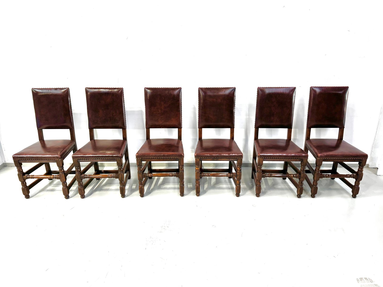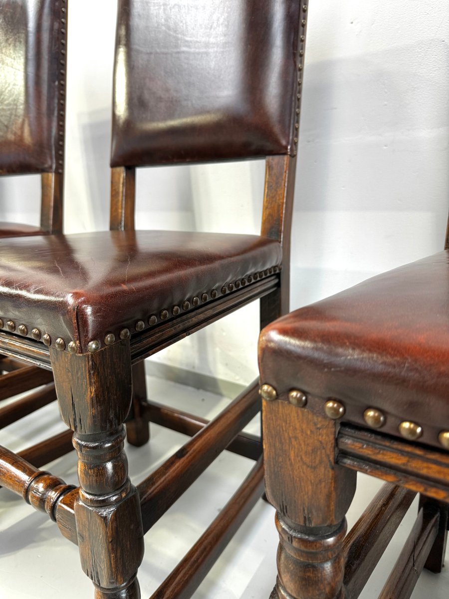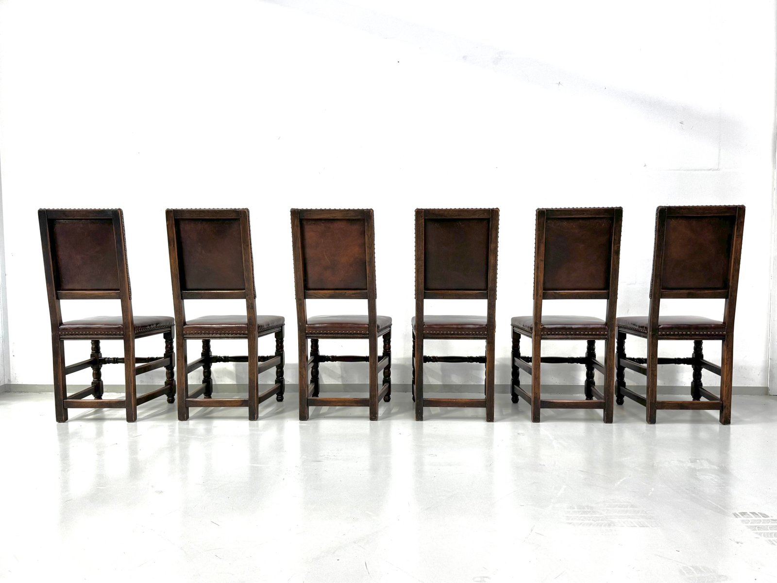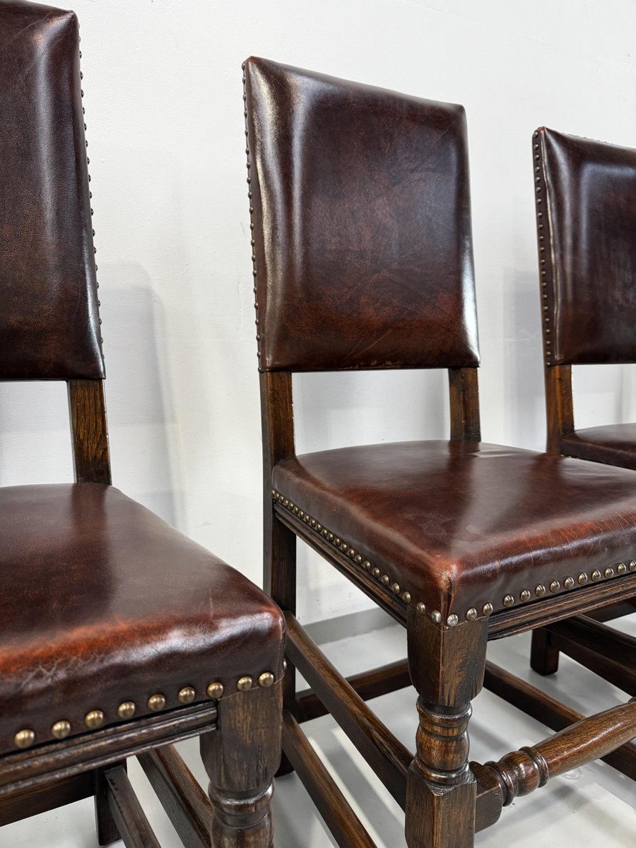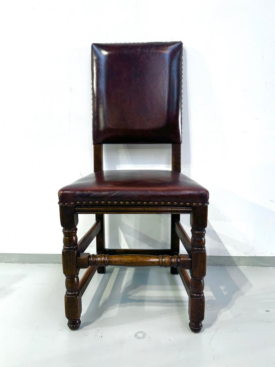 Französische Vintage Castle Stühle aus Braunem Leder & Eiche, 1960er, 6 . Set
