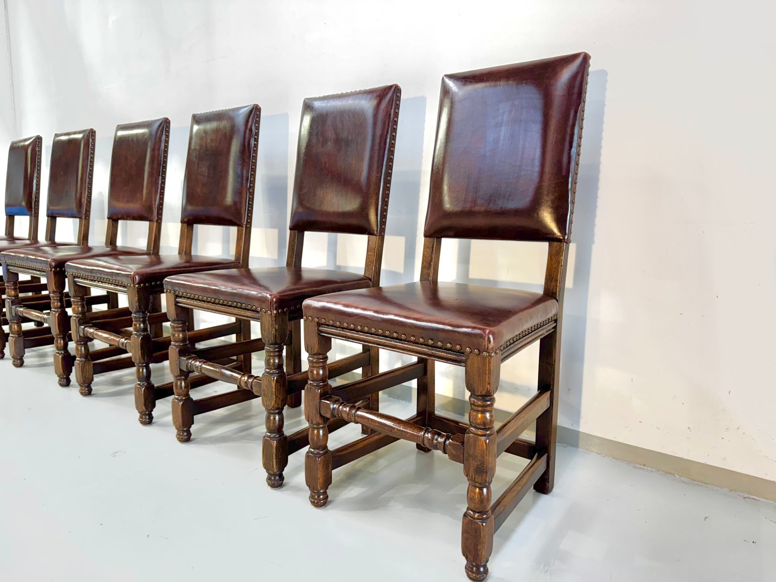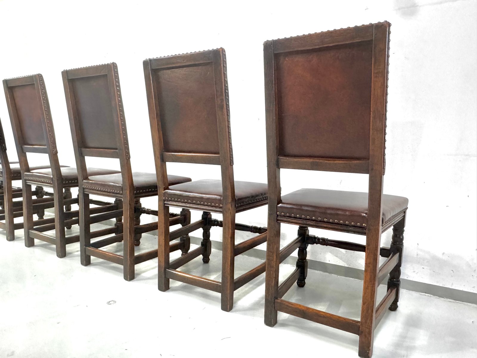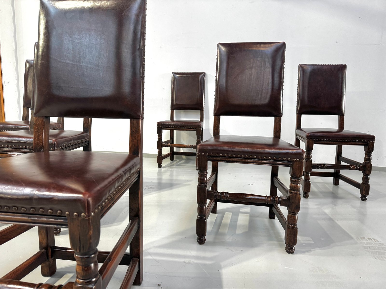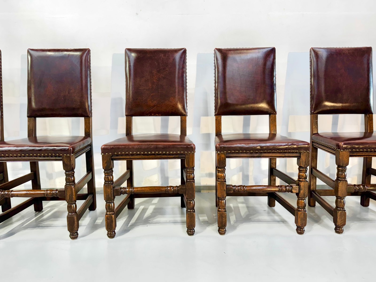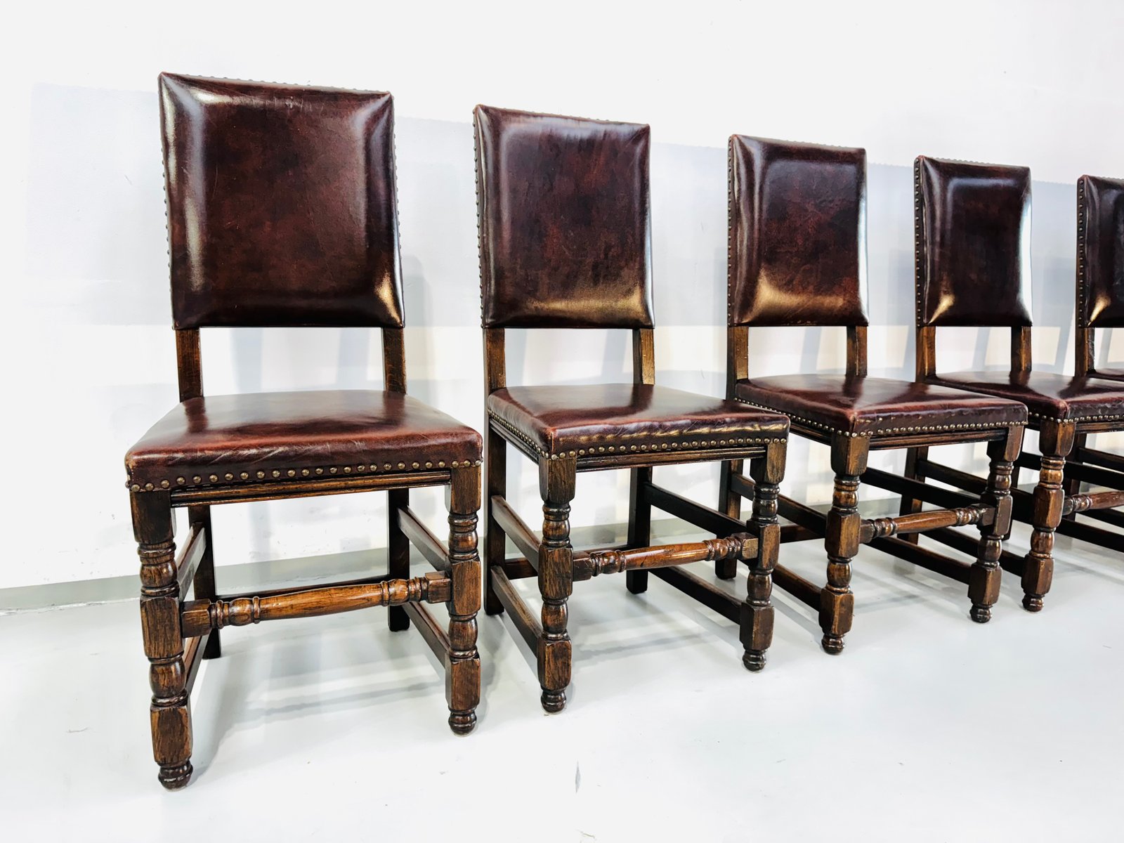 Französische Vintage Castle Stühle aus Braunem Leder & Eiche, 1960er, 6 . Set