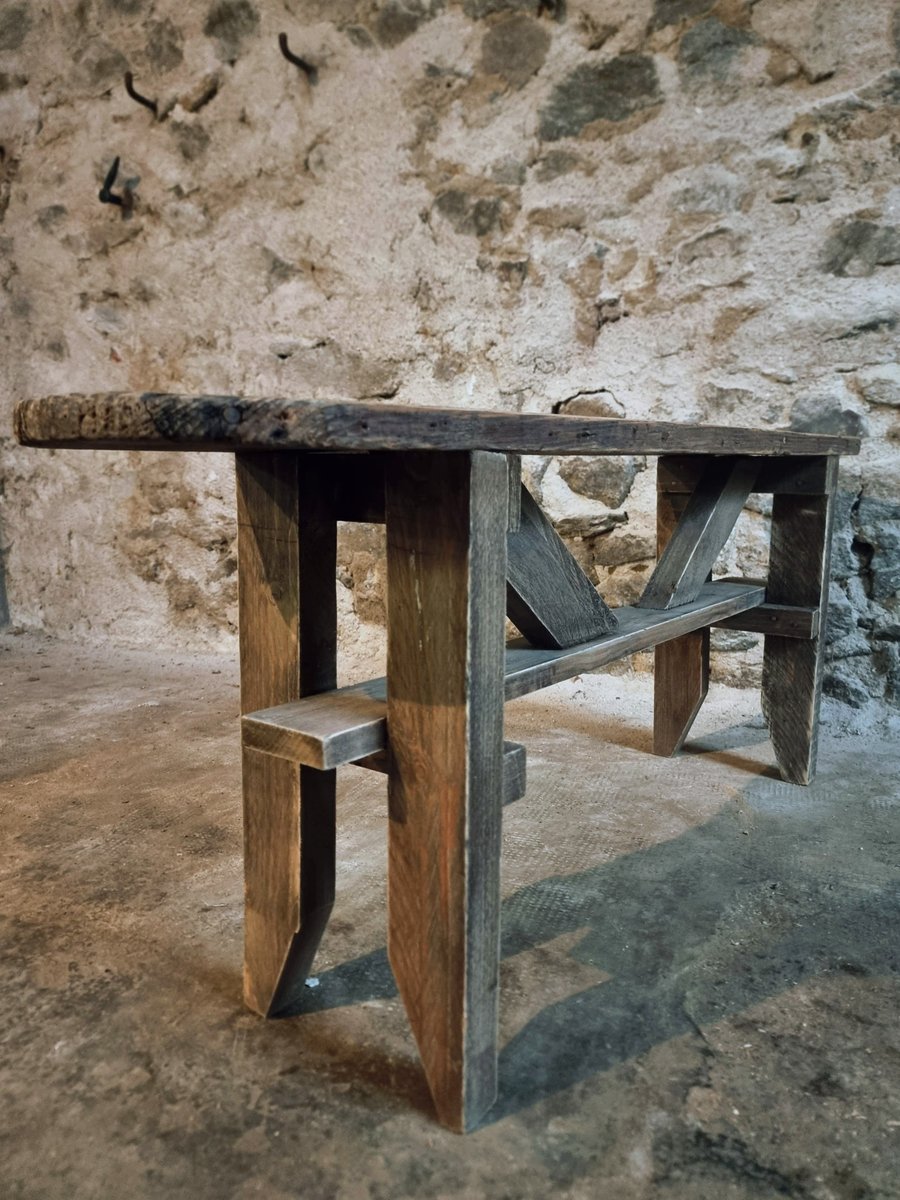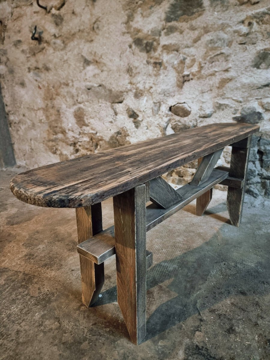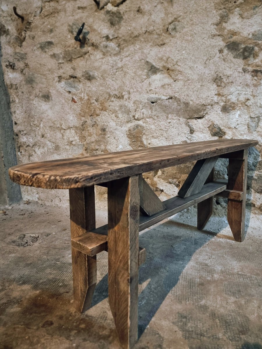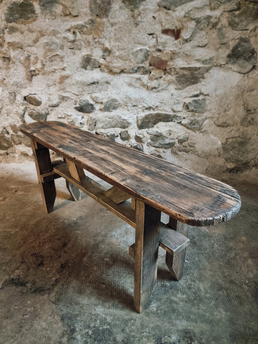 Das aus massivem Kiefernholz gefertigte Stück weist natürliche Gebrauchsspuren und Patina auf, was ihm Charakter verleiht.
