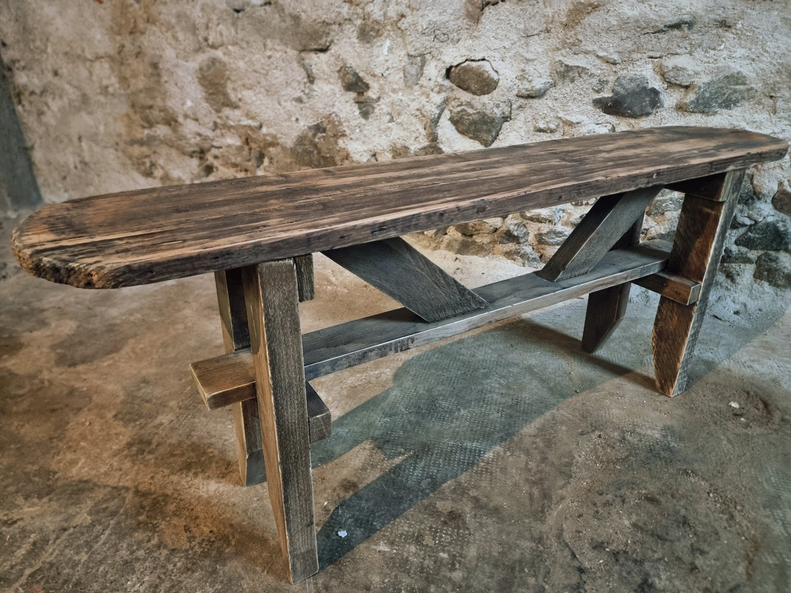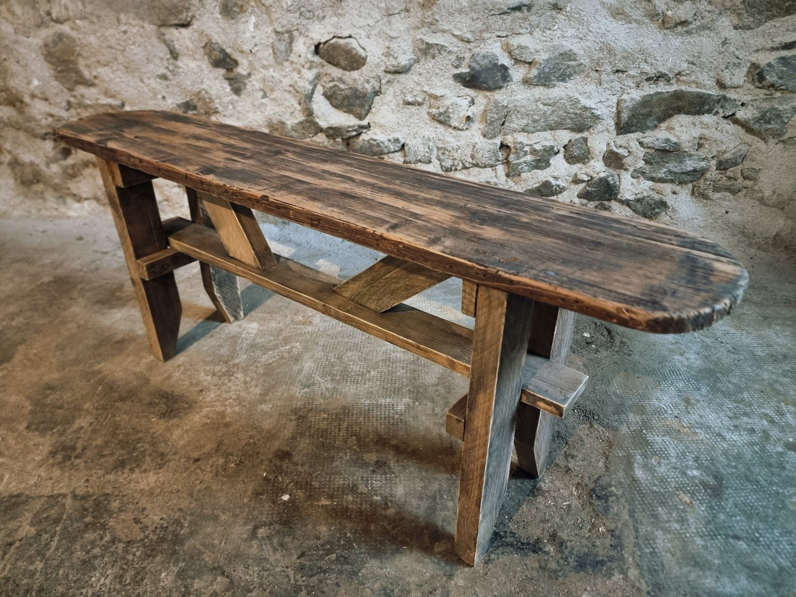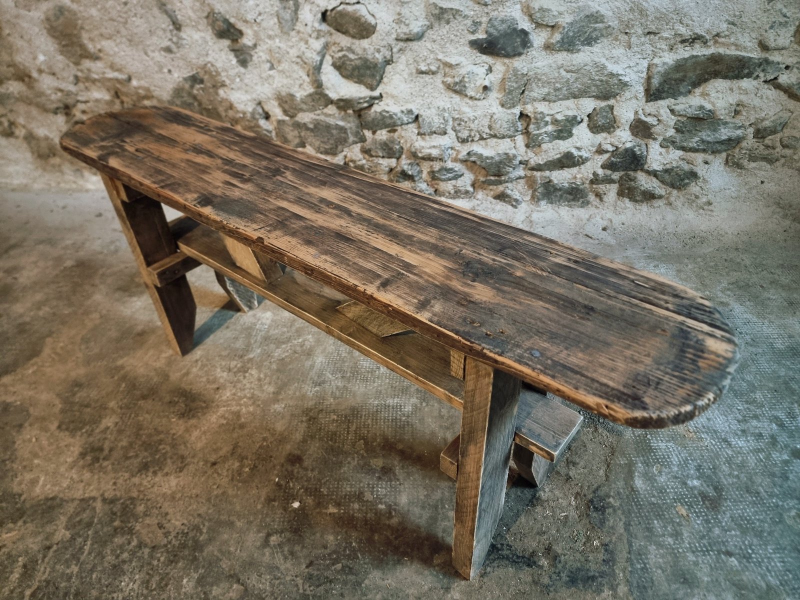 A functional vintage bench with a simple rustic look, suitable for many interiors.