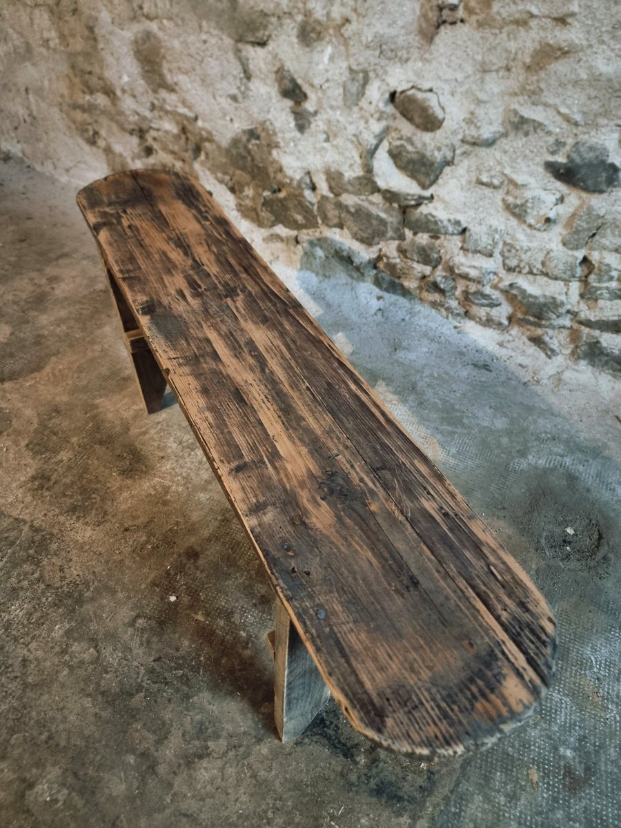 A vintage pine bench from France, dating to the 1960s.